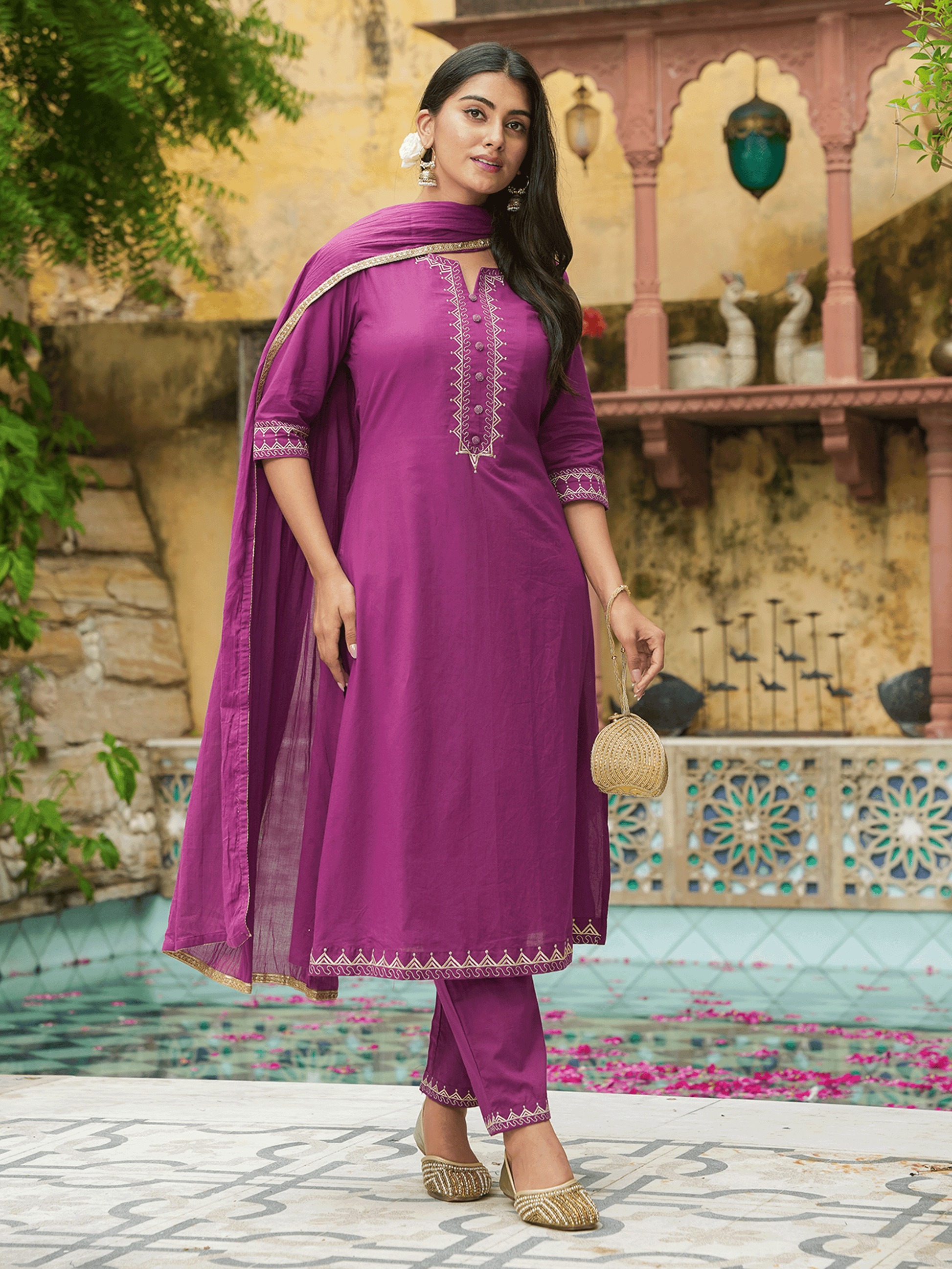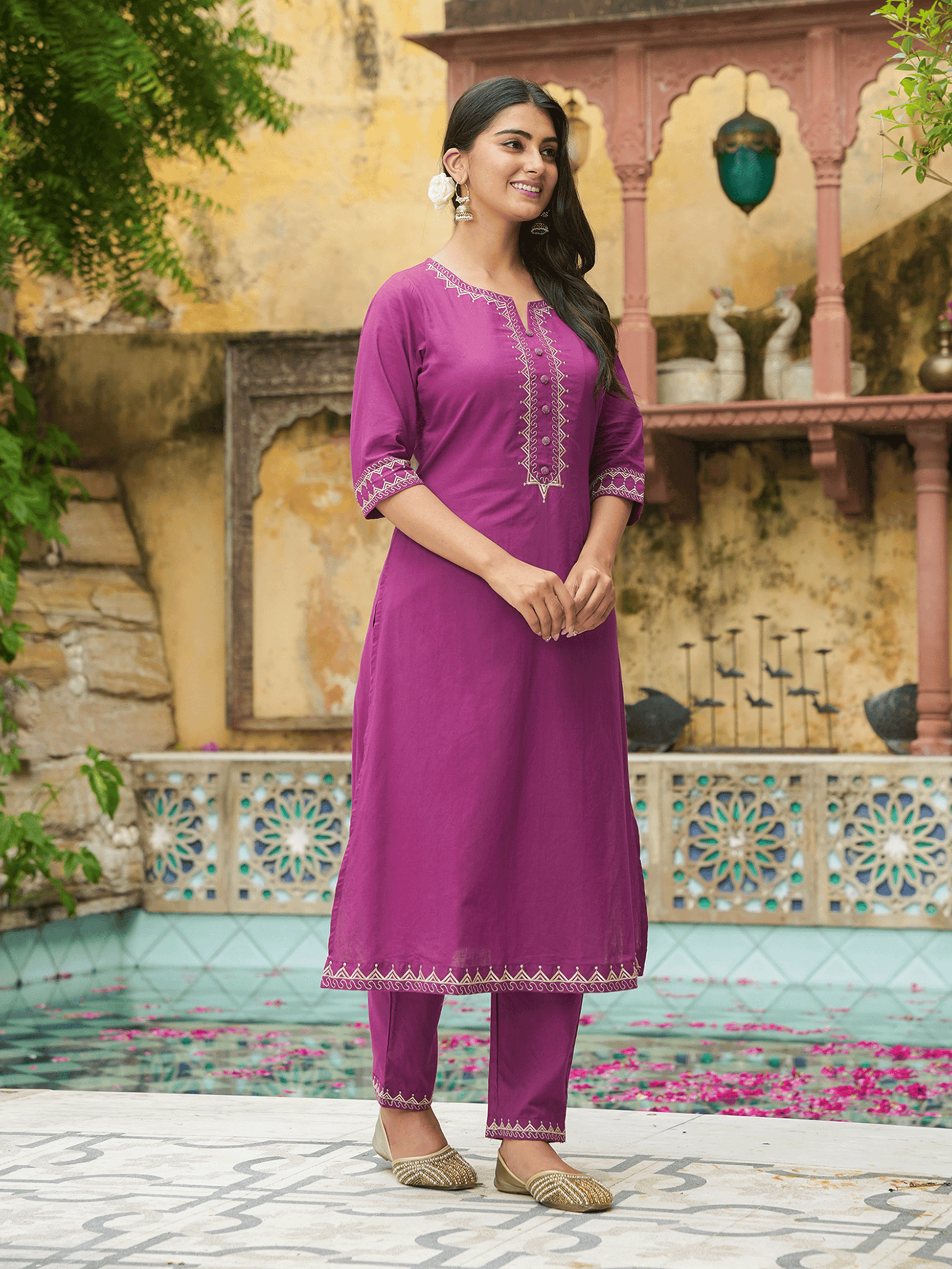 Elevate your ethnic wardrobe with this Soft Cotton kurta in a stunning Purple hue. Featuring an elegant A-line fit and striking Solid accents, it’s perfect for festive celebrations or family gatherings. The Round neckline and 3/4 Sleeve provide all-day comfort. Team with gold-toned accessories for an effortlessly chic vibe. Maintain its charm by following proper care instructions.