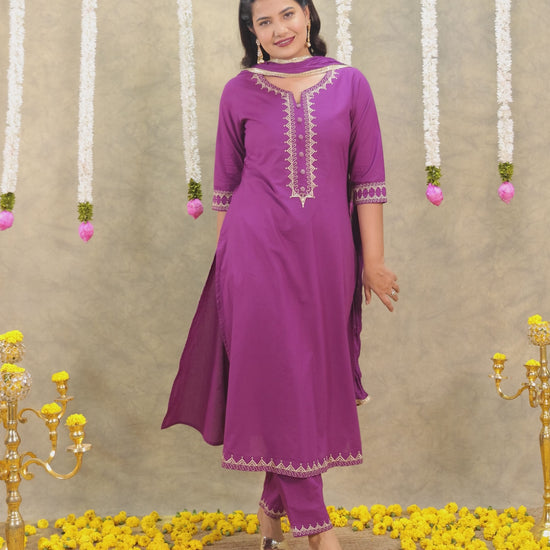 This purple solid kurta & trousers offers the perfect blend of comfort and style. The versatile round neckline offers timeless simplicity and comfort. The trousers offer a contemporary twist with their clean, streamlined fit. The elaborate embroidered, zari work tells a story through traditional techniques. The classic straight silhouette offers a timeless look with clean lines and comfortable mobility. Perfectly tailored with 3/4 sleeve and a calf length for versatile styling. Suitable for both casual gatherings and semi-formal events, with dry clean instructions.