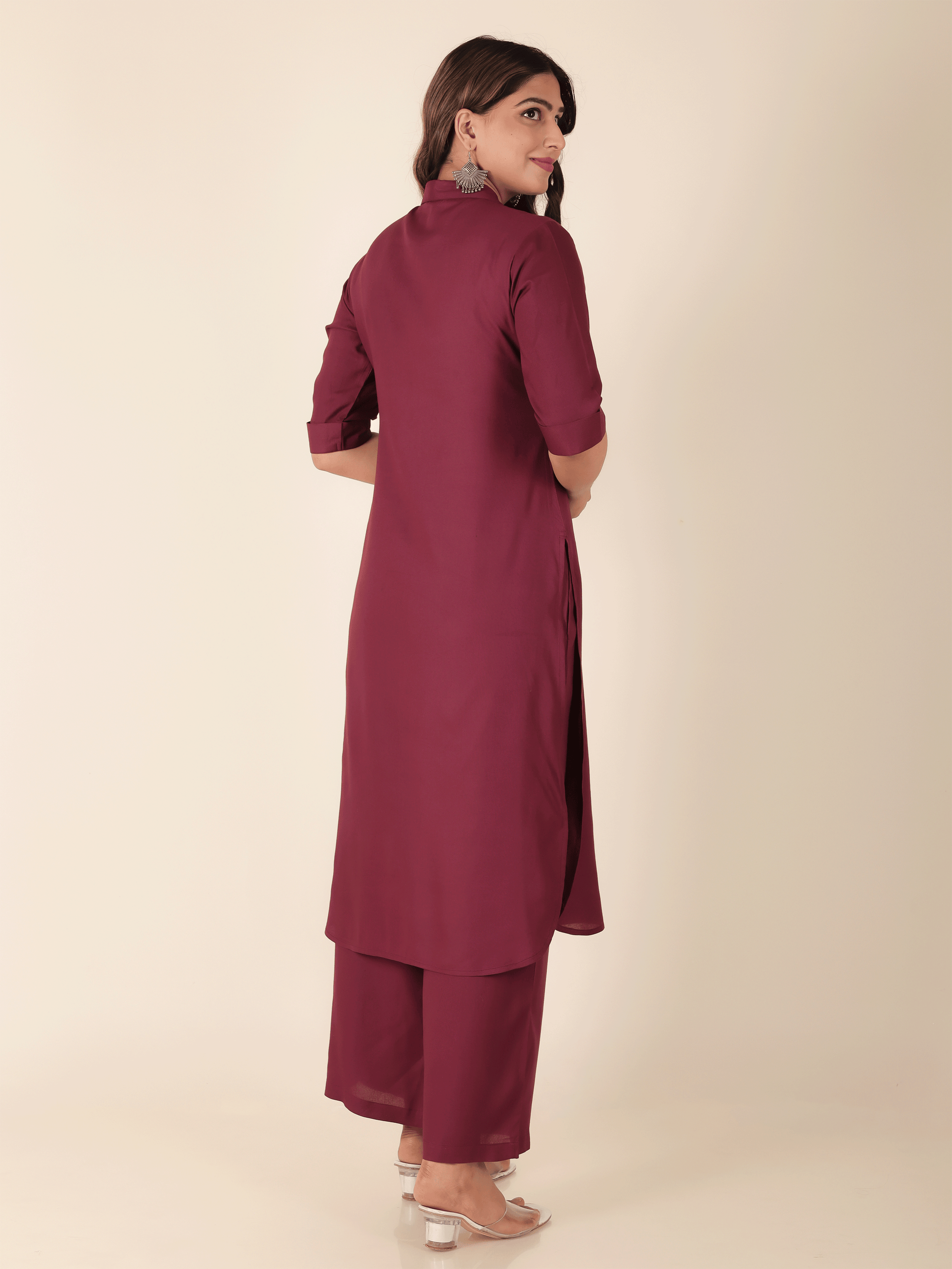 This Maroon Pathani kurta in soft Viscose is a timeless pick for festive and casual wear. Designed with a Collared neckline and Elbow Length Sleeve sleeves, its graceful Calf Length cut flatters all body types. The delicate Solid detailing adds a touch of sophistication. Pair it with statement earrings and juttis for a polished look. Maintain its pristine look by following proper care instructions.