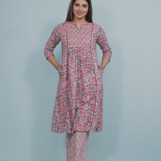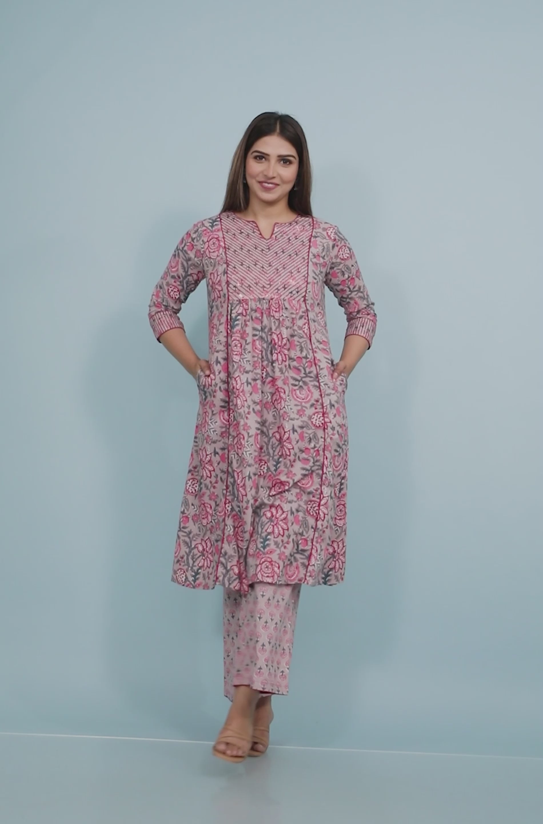 Embroidered Soft Cotton Floral Flared Grey Kurta