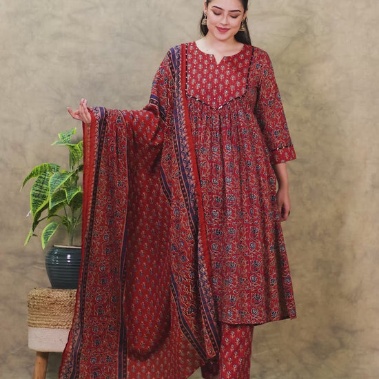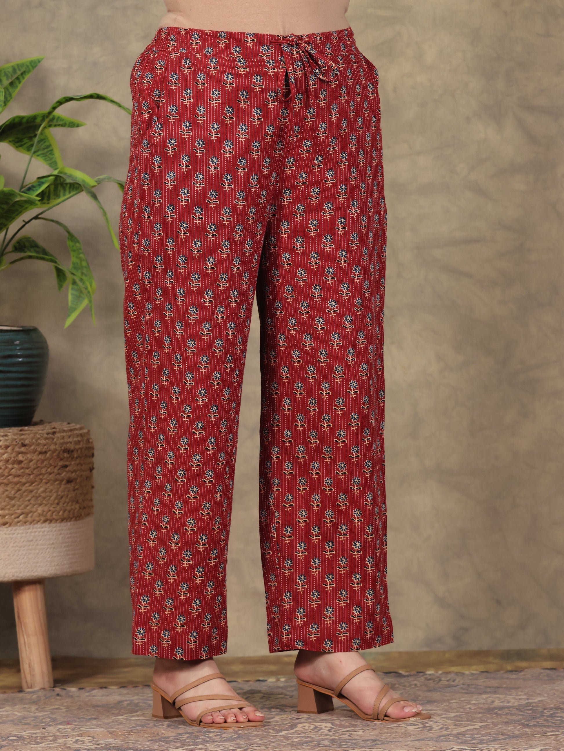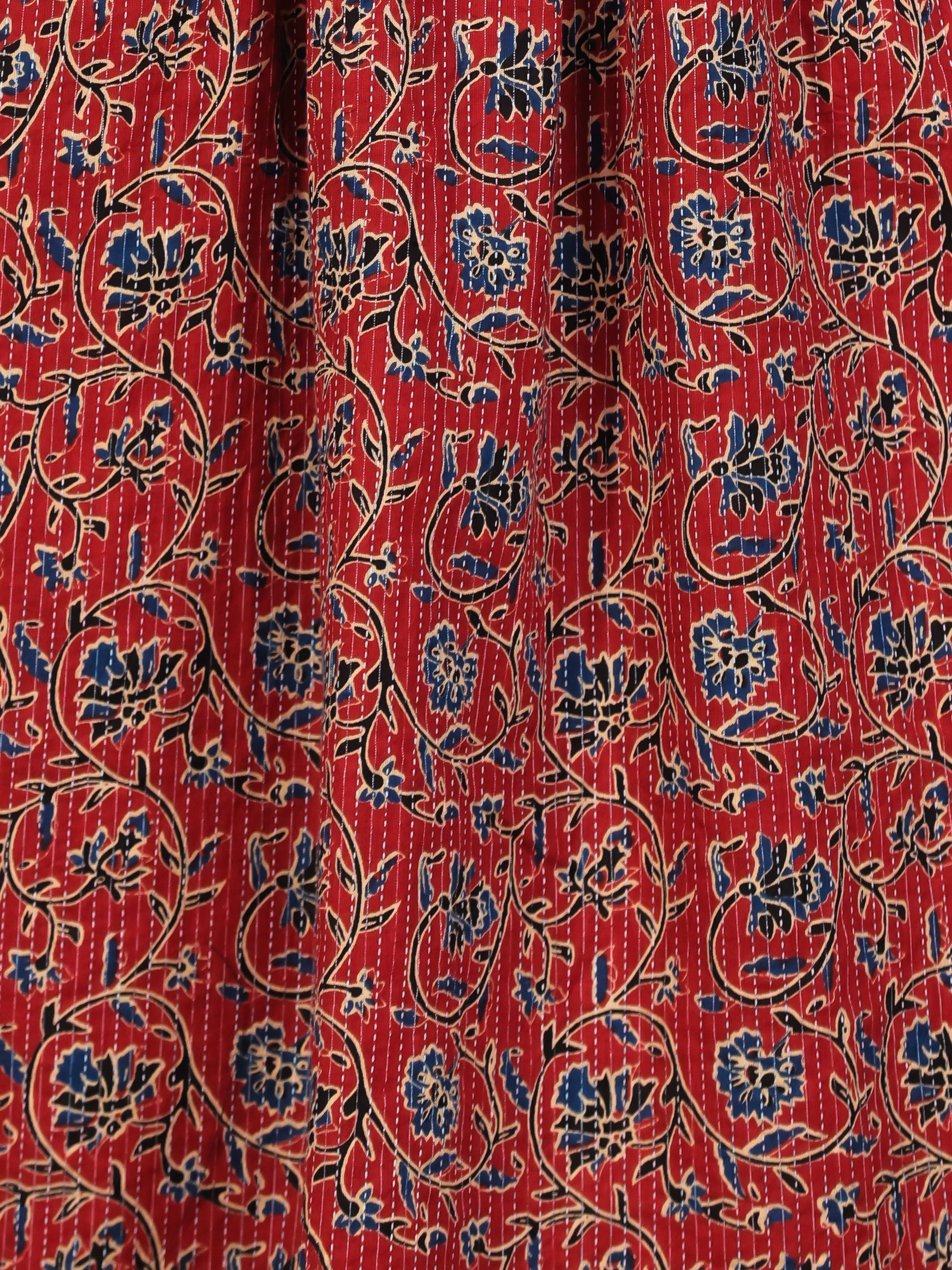 Embroidered Kantha Cotton Floral Flared Red Kurta