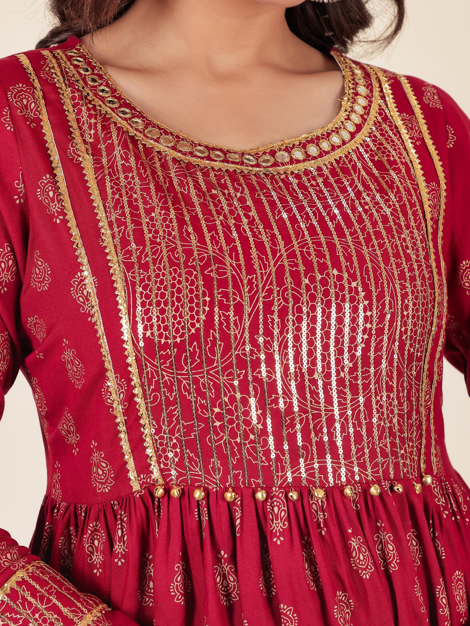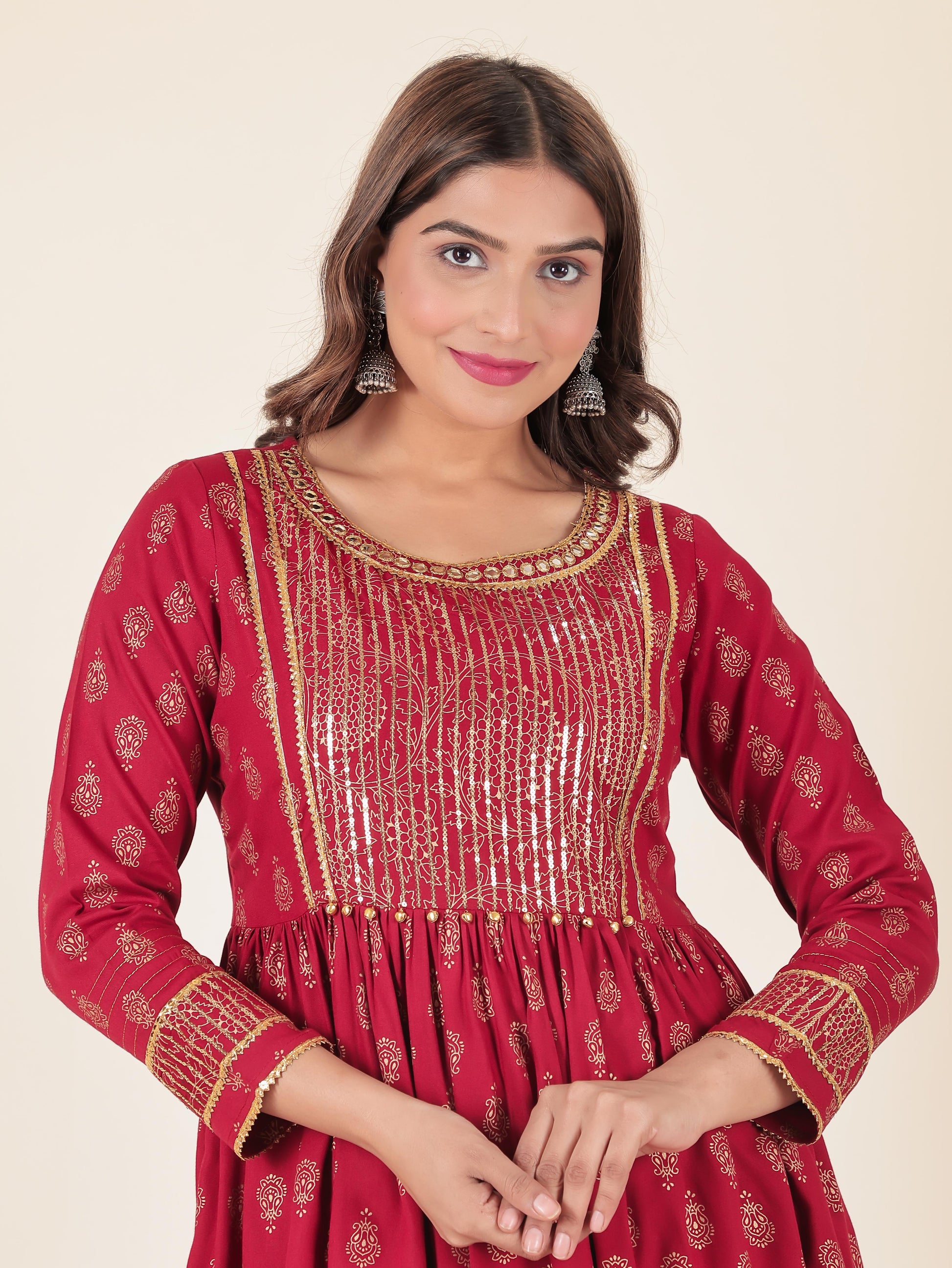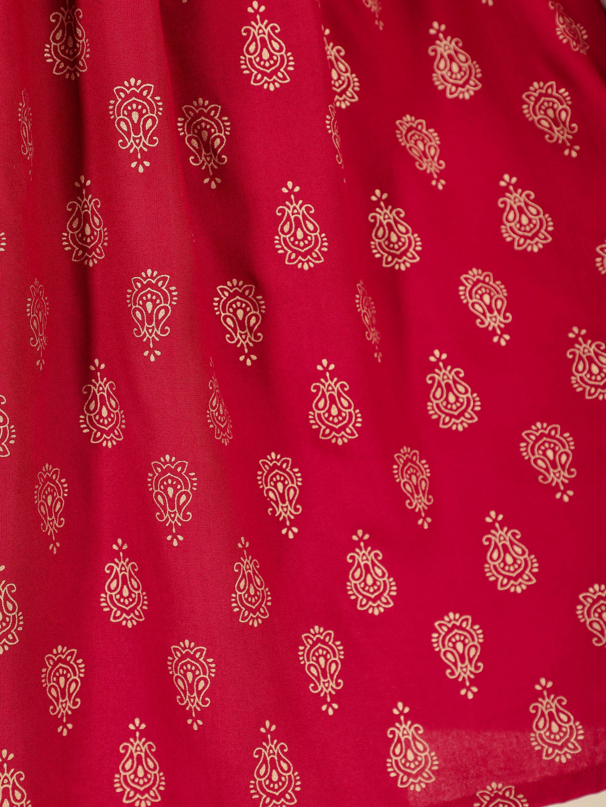 This Red Viscose kurta with a Flared flare is designed for comfort and style. Featuring a Round neckline, Full Sleeve sleeves, and a graceful Knee Length hemline, it’s perfect for festive wear or semi-formal gatherings. The Gold foil highlights add depth and texture, making it a standout piece. Accessorise with a contrasting dupatta and keep it pristine by following proper care instructions.