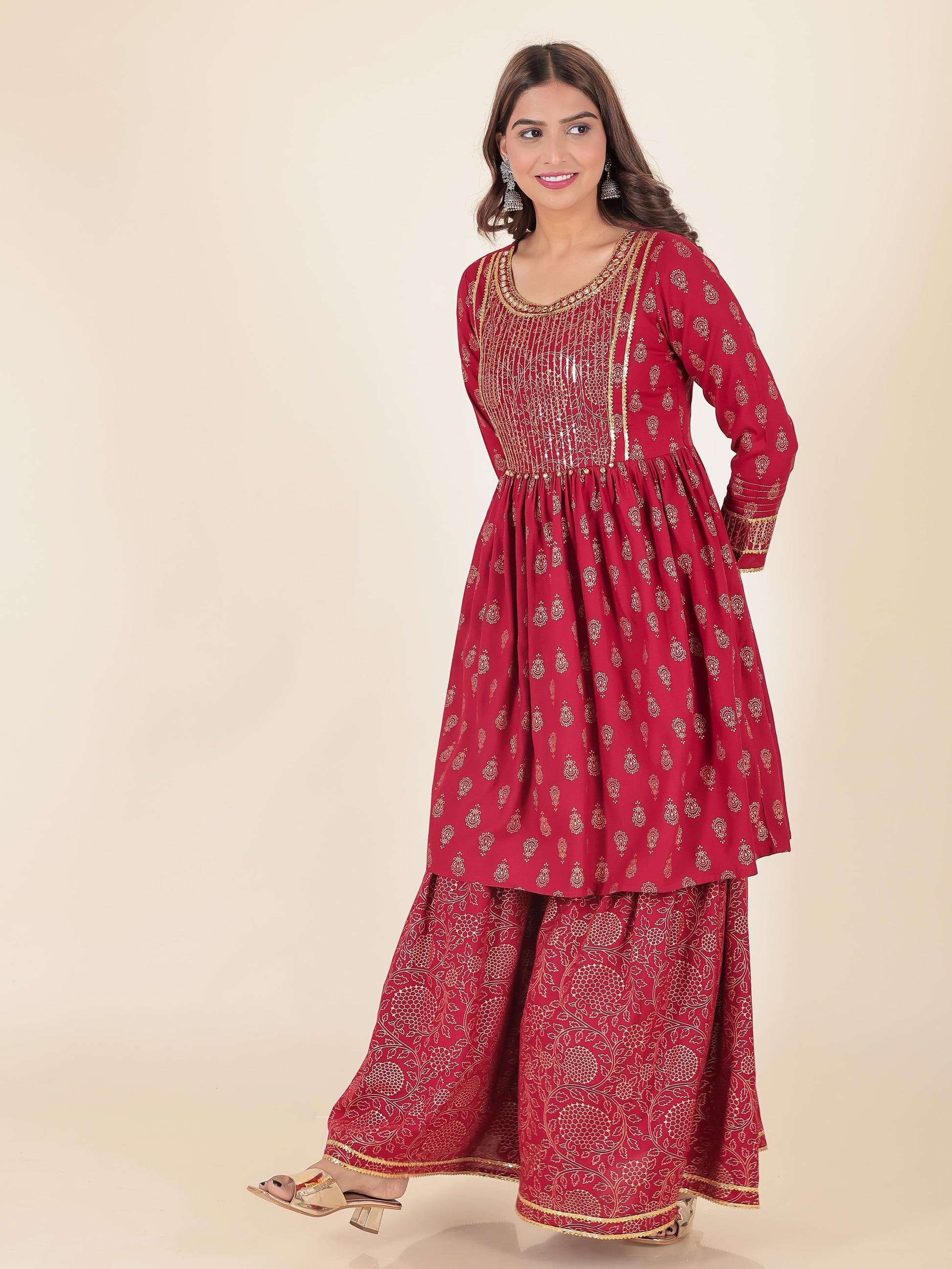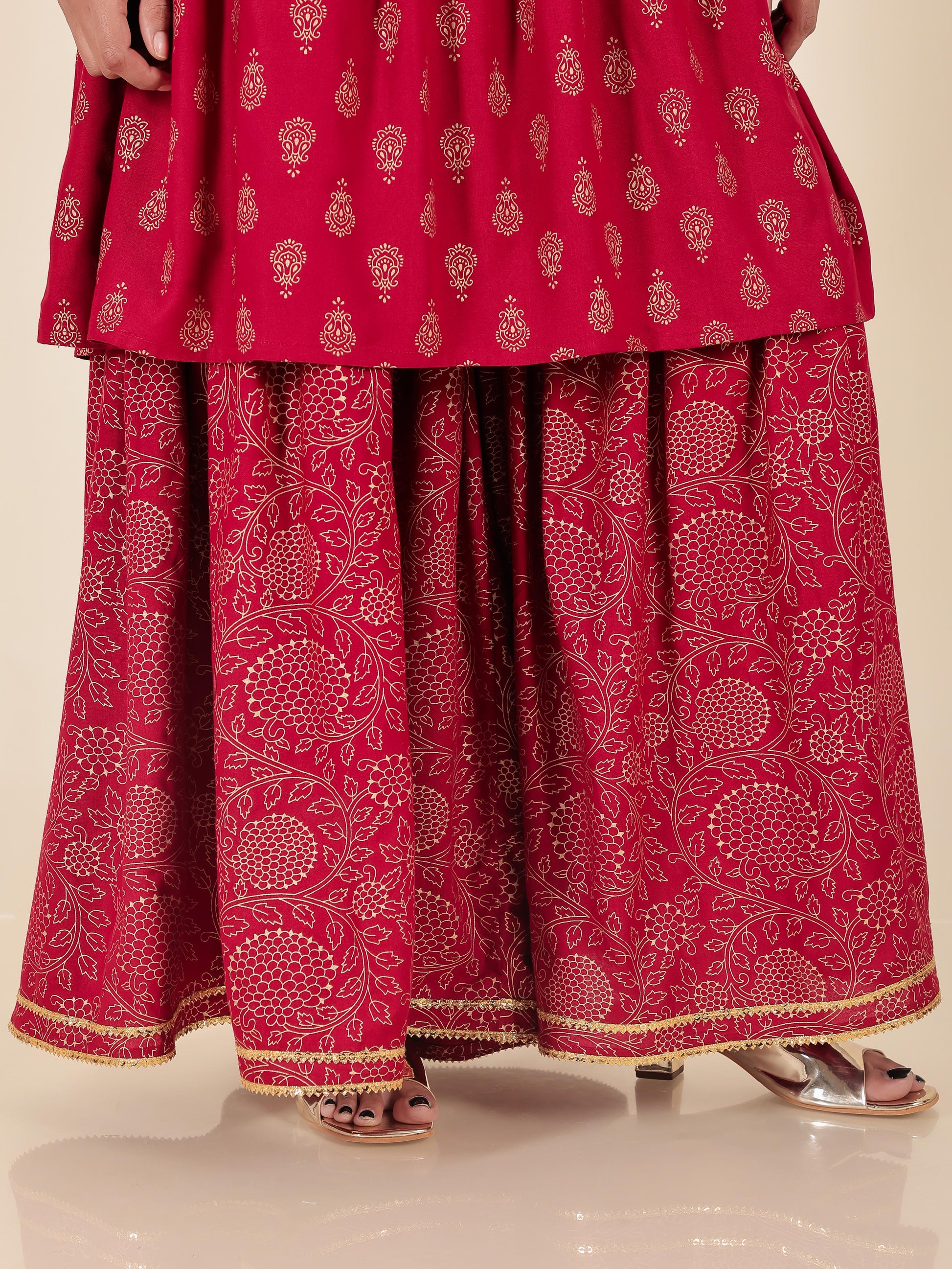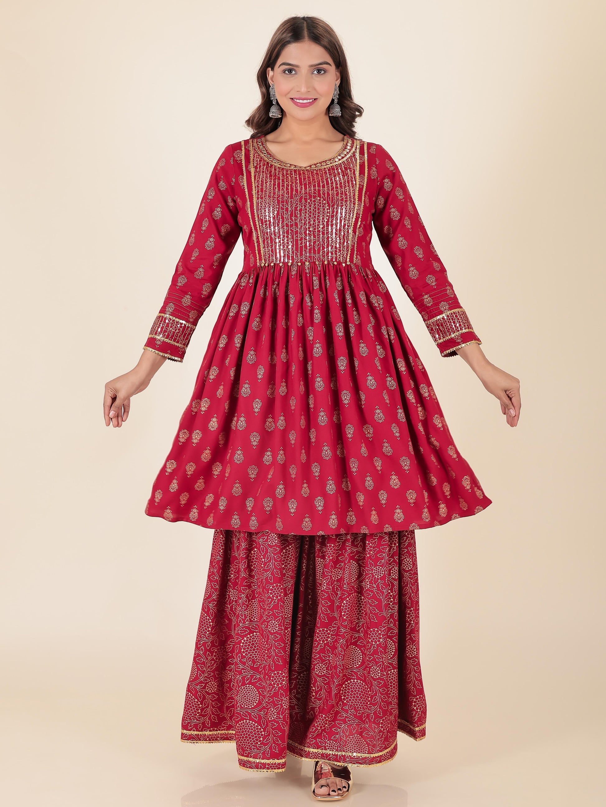 This Red Viscose kurta with a Flared flare is designed for comfort and style. Featuring a Round neckline, Full Sleeve sleeves, and a graceful Knee Length hemline, it’s perfect for festive wear or semi-formal gatherings. The Gold foil highlights add depth and texture, making it a standout piece. Accessorise with a contrasting dupatta and keep it pristine by following proper care instructions.
