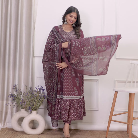 This Maroon Anarkali kurta in soft Soft Cotton is a timeless pick for festive and casual wear. Designed with a Round neckline and 3/4 Sleeve sleeves, its graceful Ankle Length cut flatters all body types. The delicate Floral detailing adds a touch of sophistication. Pair it with statement earrings and juttis for a polished look. Maintain its pristine look by following proper care instructions.