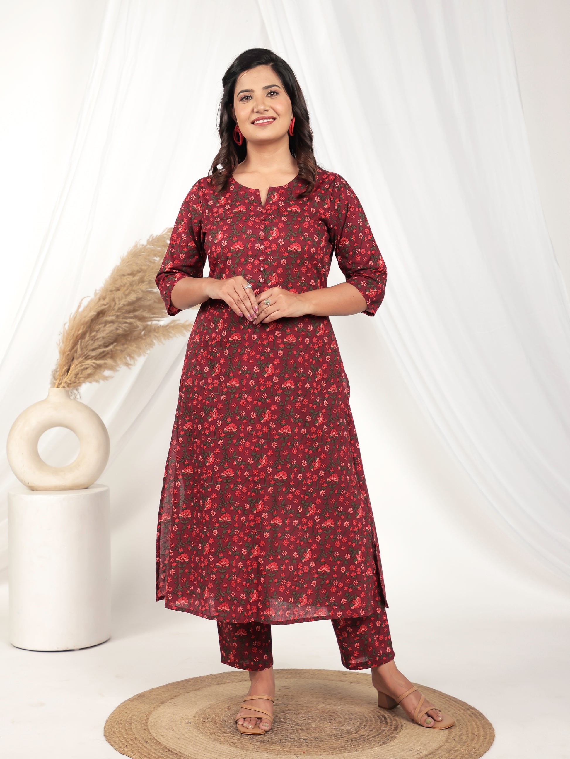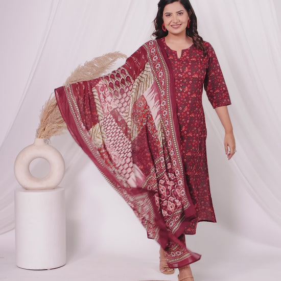 This Maroon Soft Cotton kurta with a A-line flare is designed for comfort and style. Featuring a Round neckline, 3/4 Sleeve sleeves, and a graceful Calf Length hemline, it’s perfect for festive wear or semi-formal gatherings. The Floral highlights add depth and texture, making it a standout piece. Accessorise with a contrasting dupatta and keep it pristine by following proper care instructions.