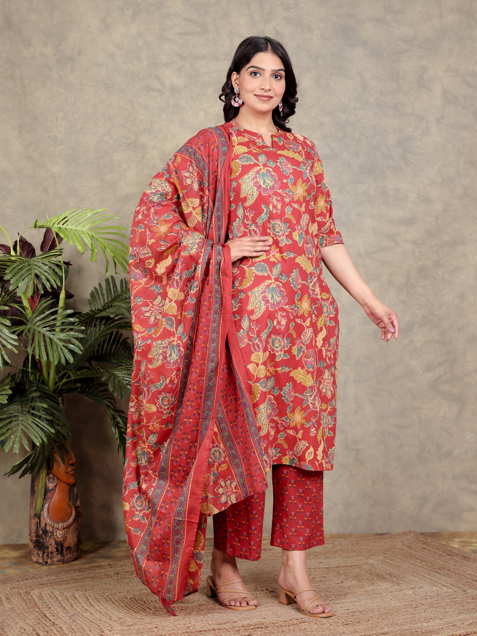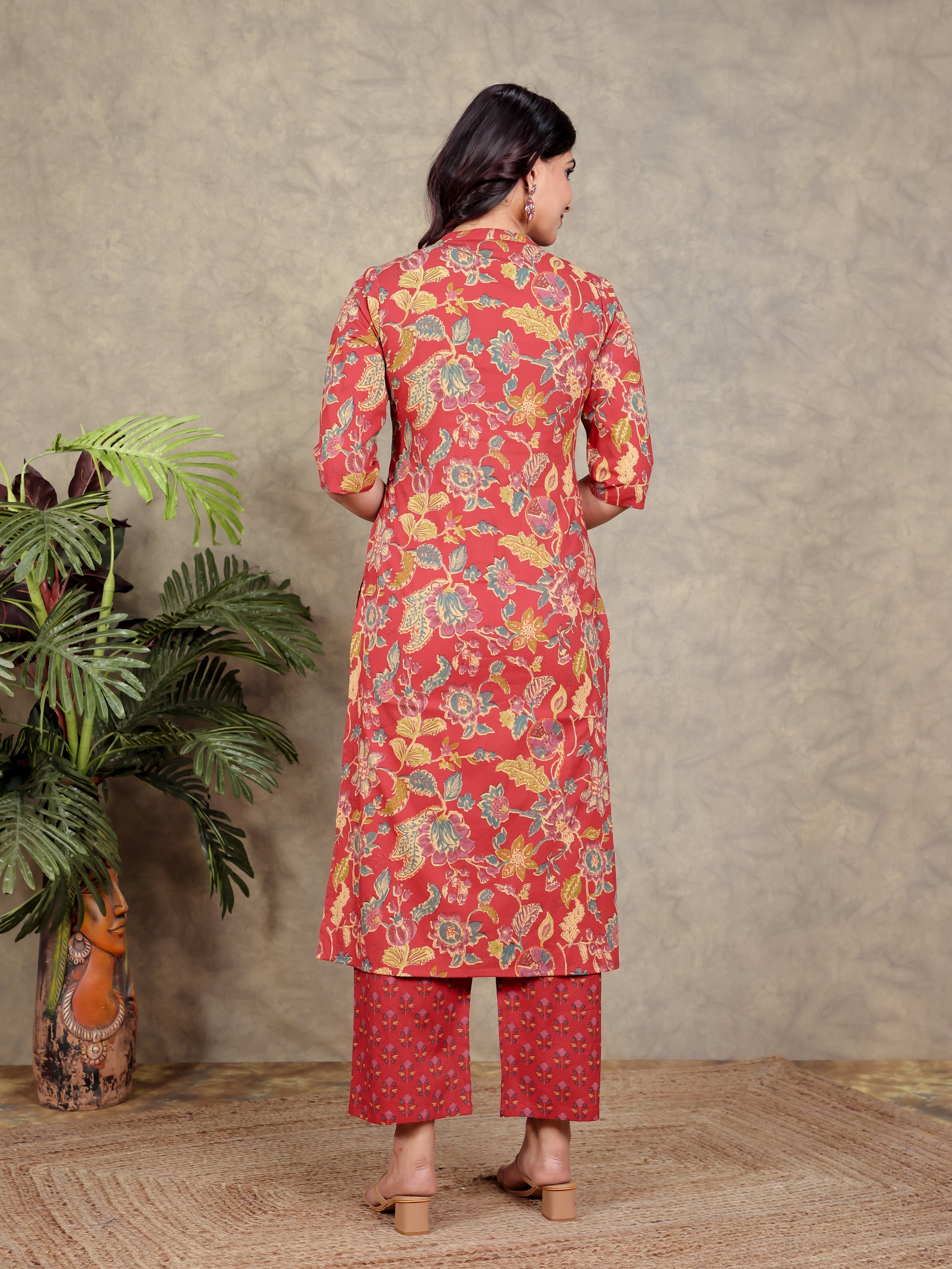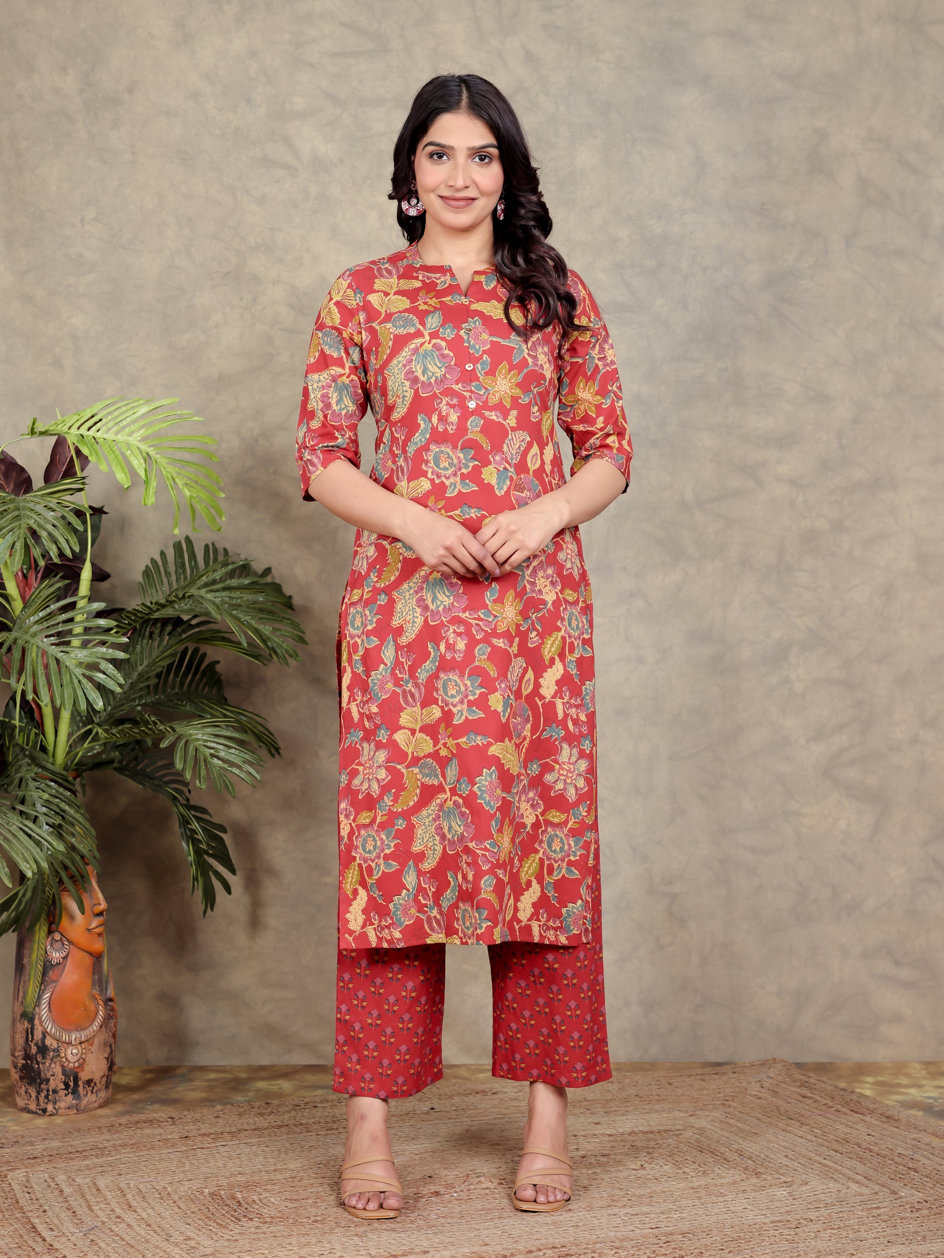 Elevate your ethnic wardrobe with this Soft Cotton kurta in a stunning Red hue. Featuring an elegant Straight fit and striking Floral accents, it’s perfect for festive celebrations or family gatherings. The Mandarin Collar neckline and 3/4 Sleeve provide all-day comfort. Team with gold-toned accessories for an effortlessly chic vibe. Maintain its charm by following proper care instructions.