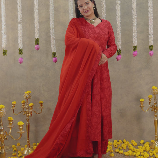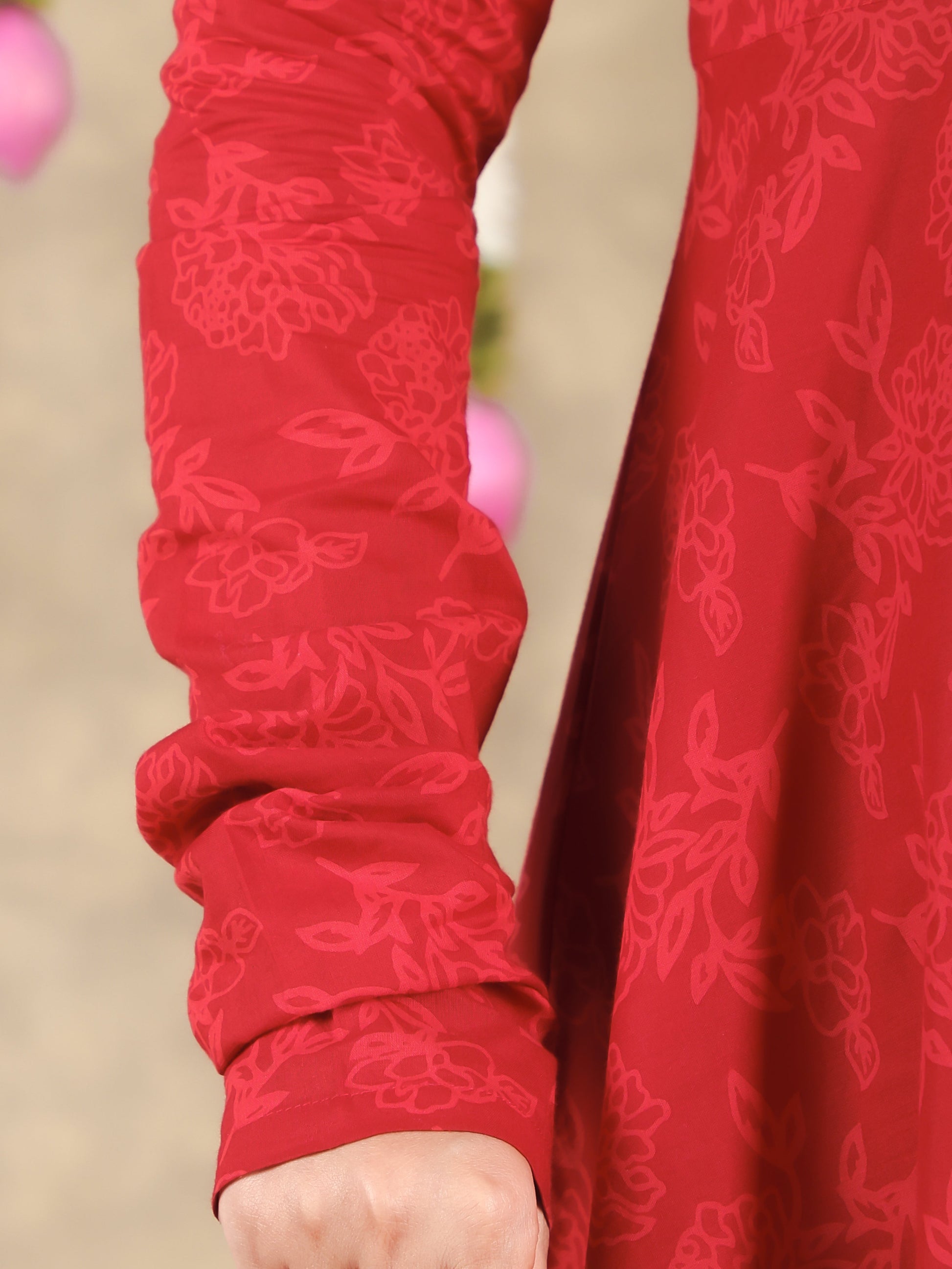 This Red Flared kurta in soft Soft Cotton is a timeless pick for festive and casual wear. Designed with a Sweetheart neckline and Churidar Sleeve sleeves, its graceful Calf Length cut flatters all body types. The delicate Floral detailing adds a touch of sophistication. Pair it with statement earrings and juttis for a polished look. Maintain its pristine look by following proper care instructions.