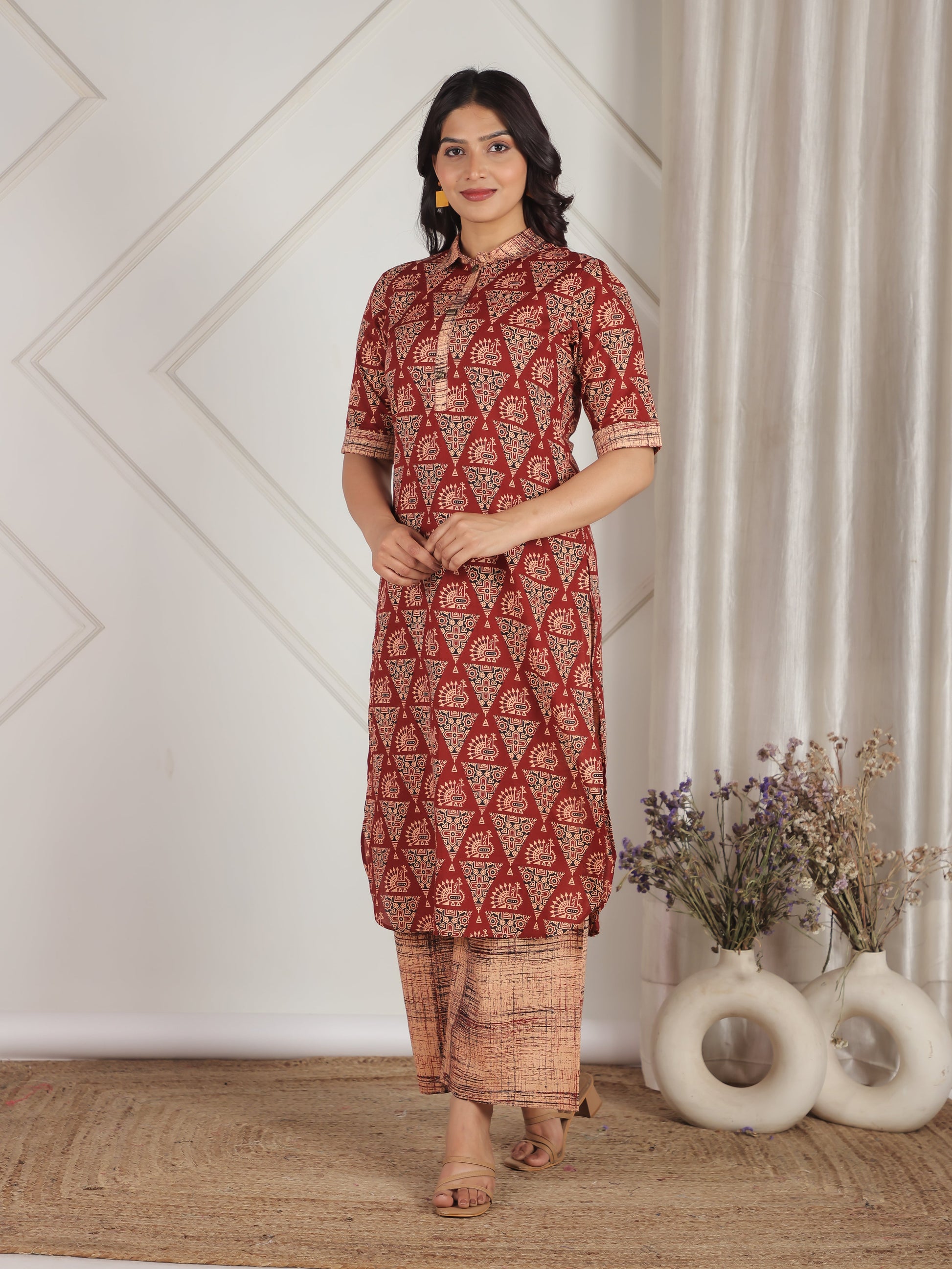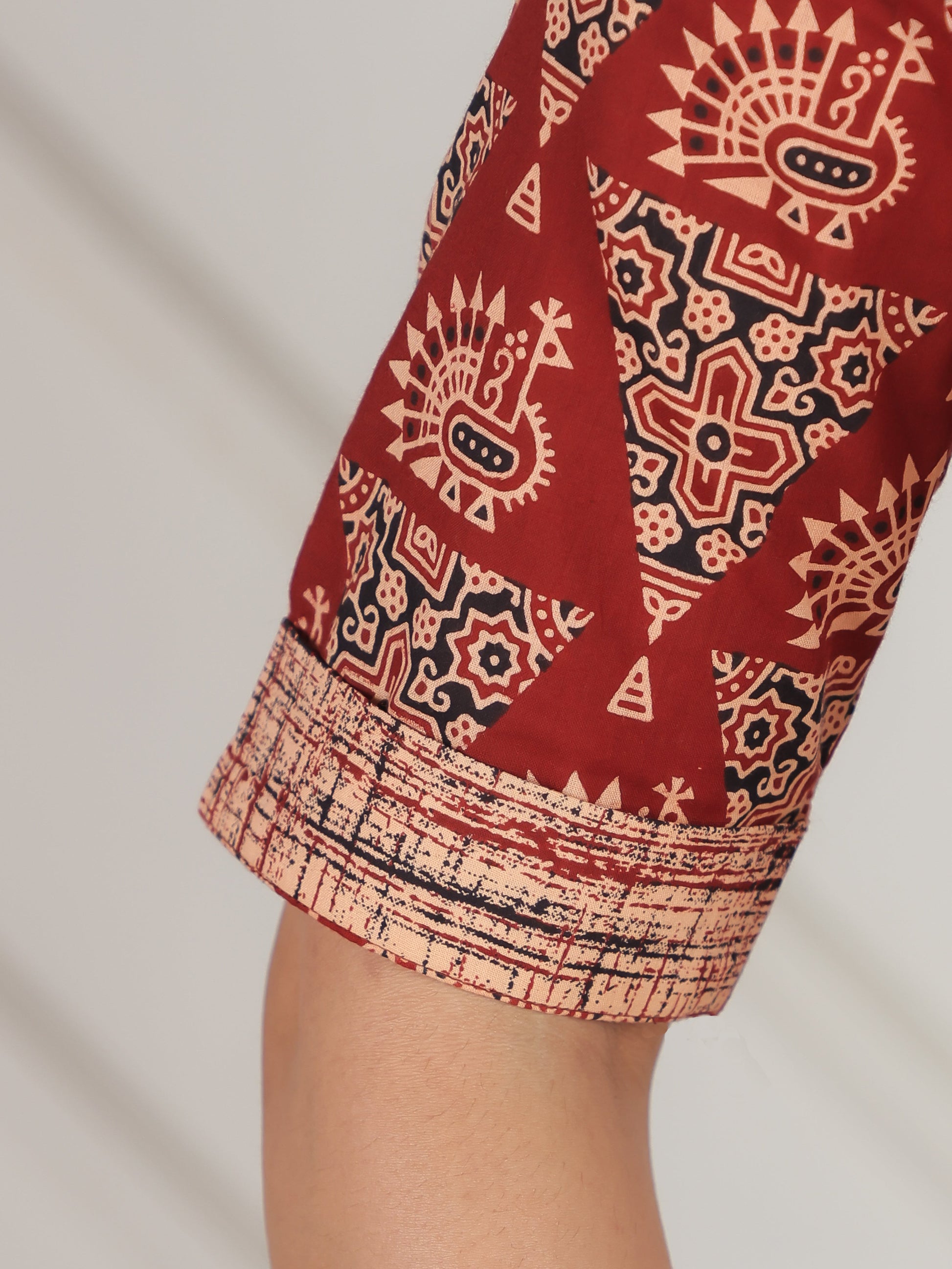 This Red Pathani kurta in soft Soft Cotton is a timeless pick for festive and casual wear. Designed with a Collared neckline and Elbow Length Sleeve sleeves, its graceful Calf Length cut flatters all body types. The delicate Geometric detailing adds a touch of sophistication. Pair it with statement earrings and juttis for a polished look. Maintain its pristine look by following proper care instructions.