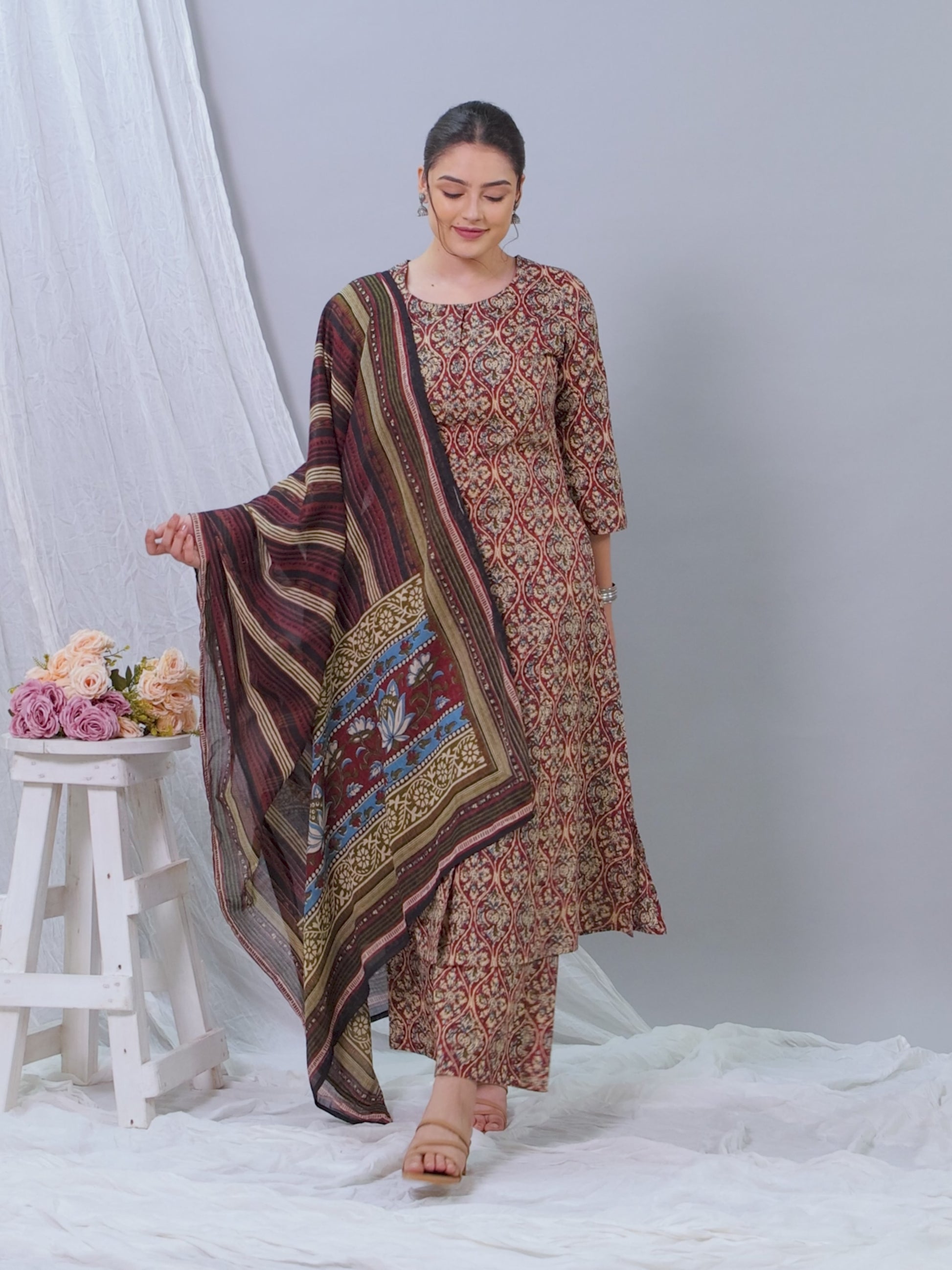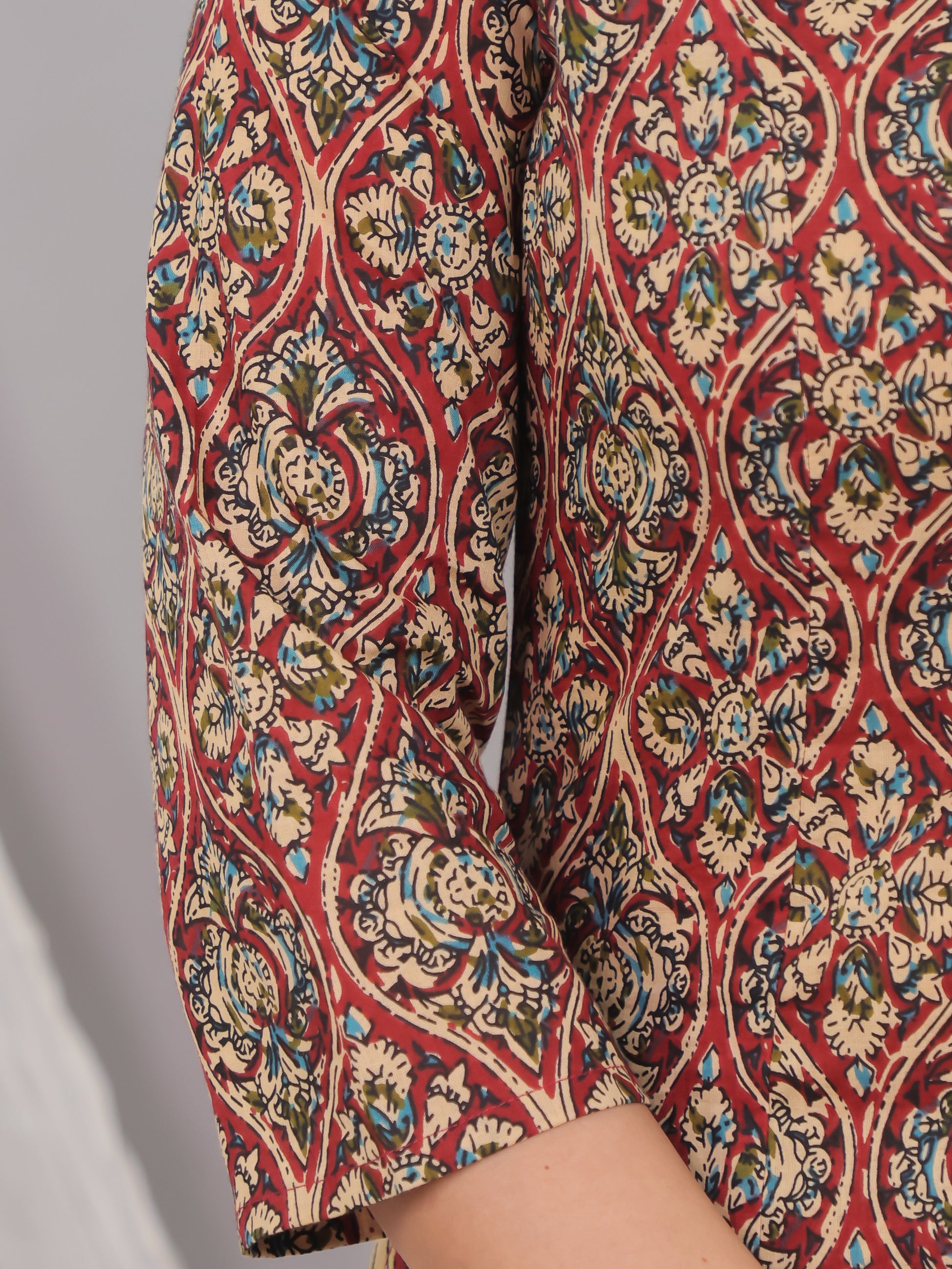 Crafted from breathable Soft Cotton, this A-line kurta in Red blends traditional design with everyday comfort. The Kalamkari finish adds artisanal charm, while the Calf Length silhouette ensures effortless elegance. Style with palazzos or leggings for versatile looks, from workdays to weekend outings. Designed for easy care, this kurta stays beautiful with simple care instructions.