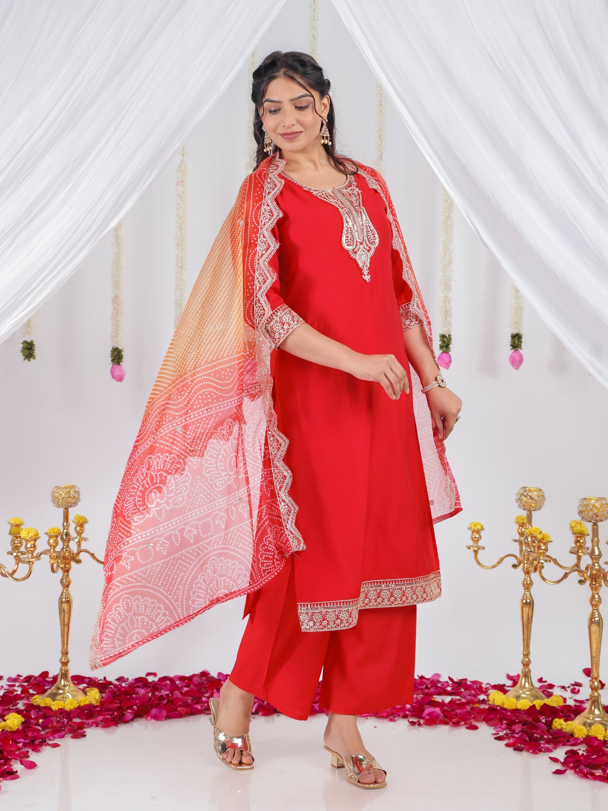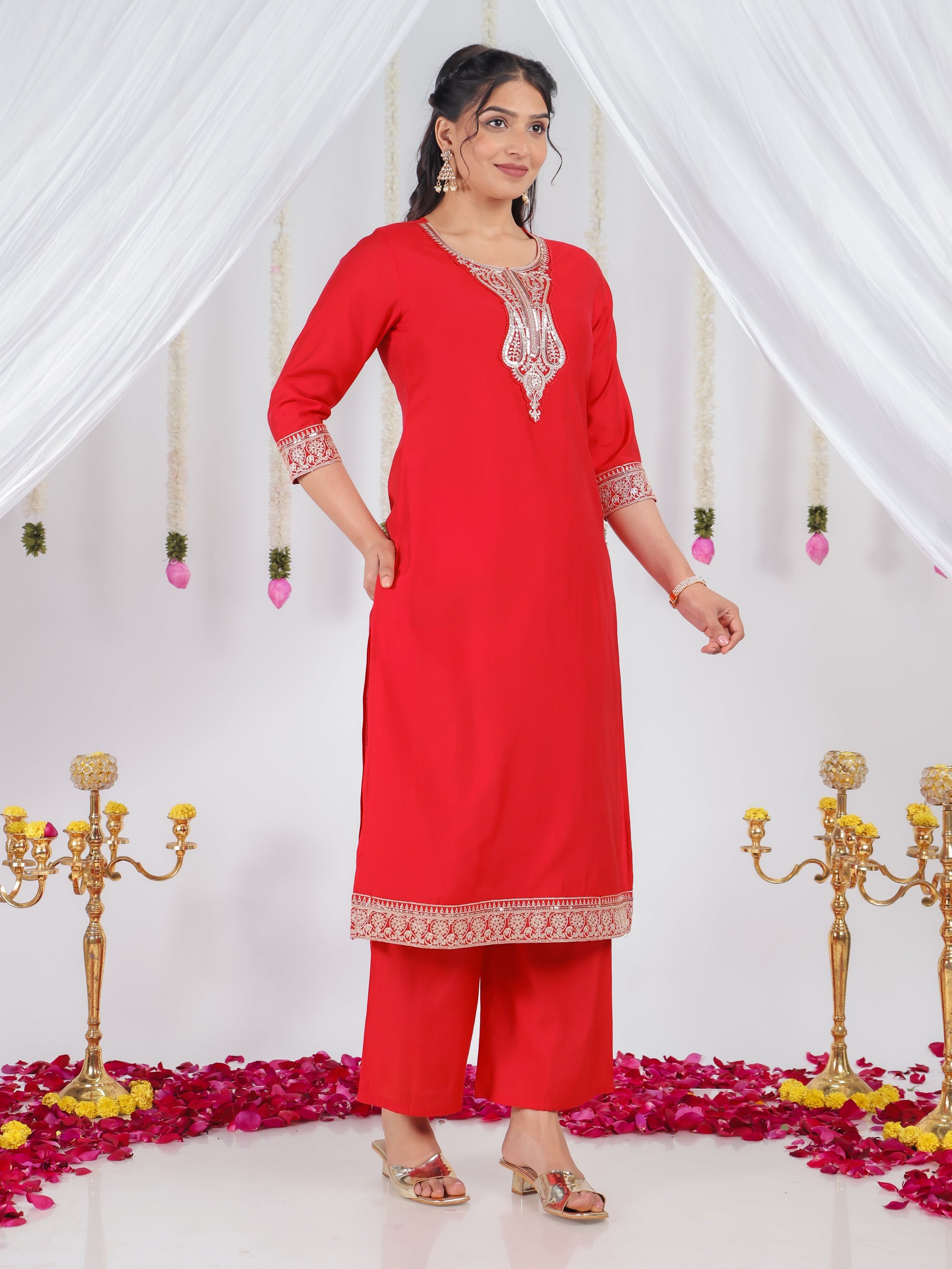 This Red Muslin kurta with a Straight flare is designed for comfort and style. Featuring a Round neckline, 3/4 Sleeve sleeves, and a graceful Calf Length hemline, it’s perfect for festive wear or semi-formal gatherings. The Solid highlights add depth and texture, making it a standout piece. Accessorise with a contrasting dupatta and keep it pristine by following proper care instructions.