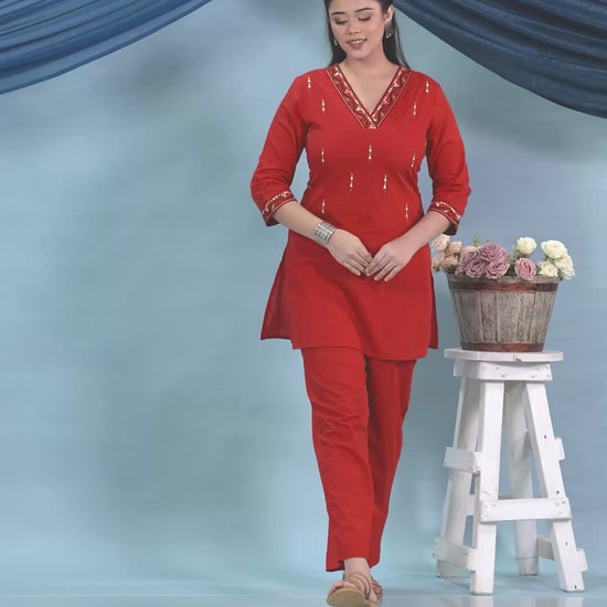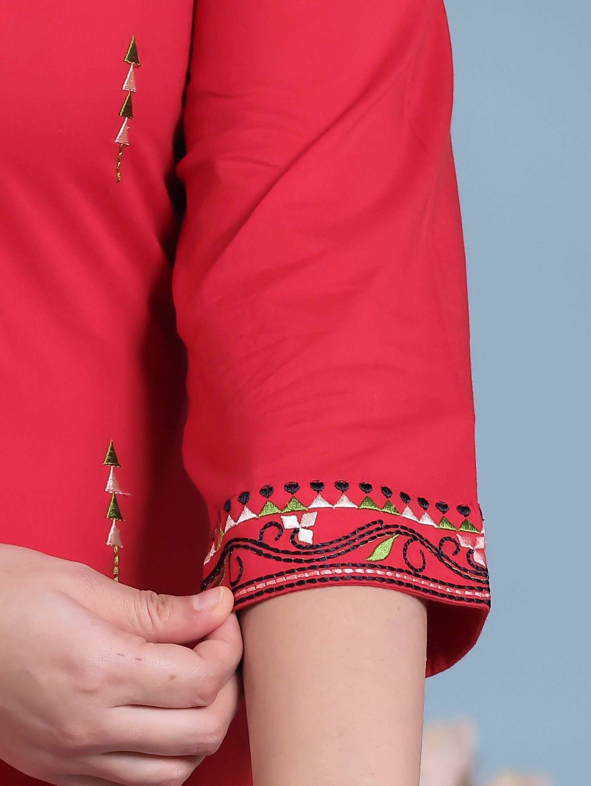 Embroidered Soft Cotton Solid Straight Red Kurta