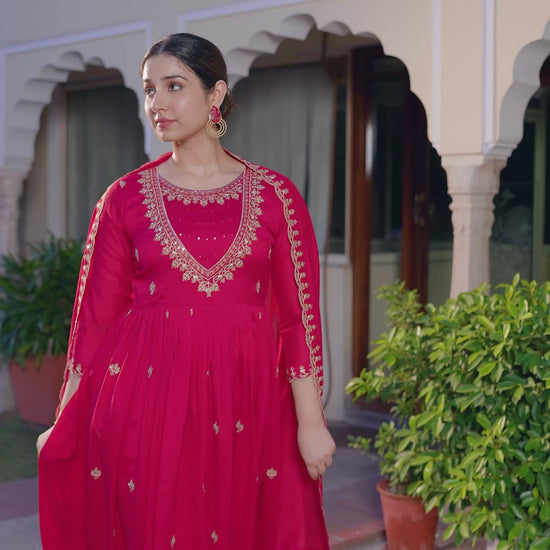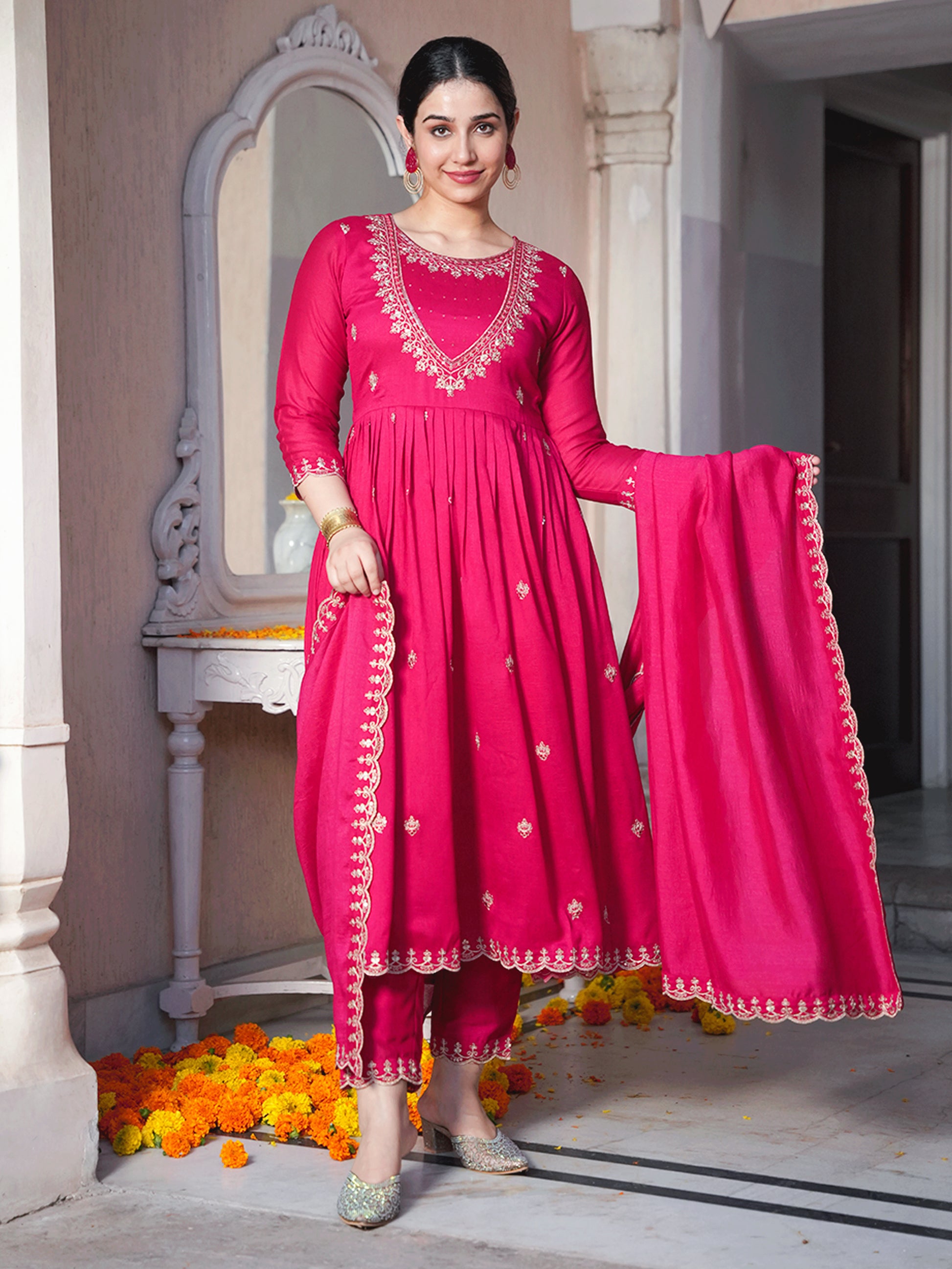 Embroidered Poly Silk Solid Royal Pink Kurta