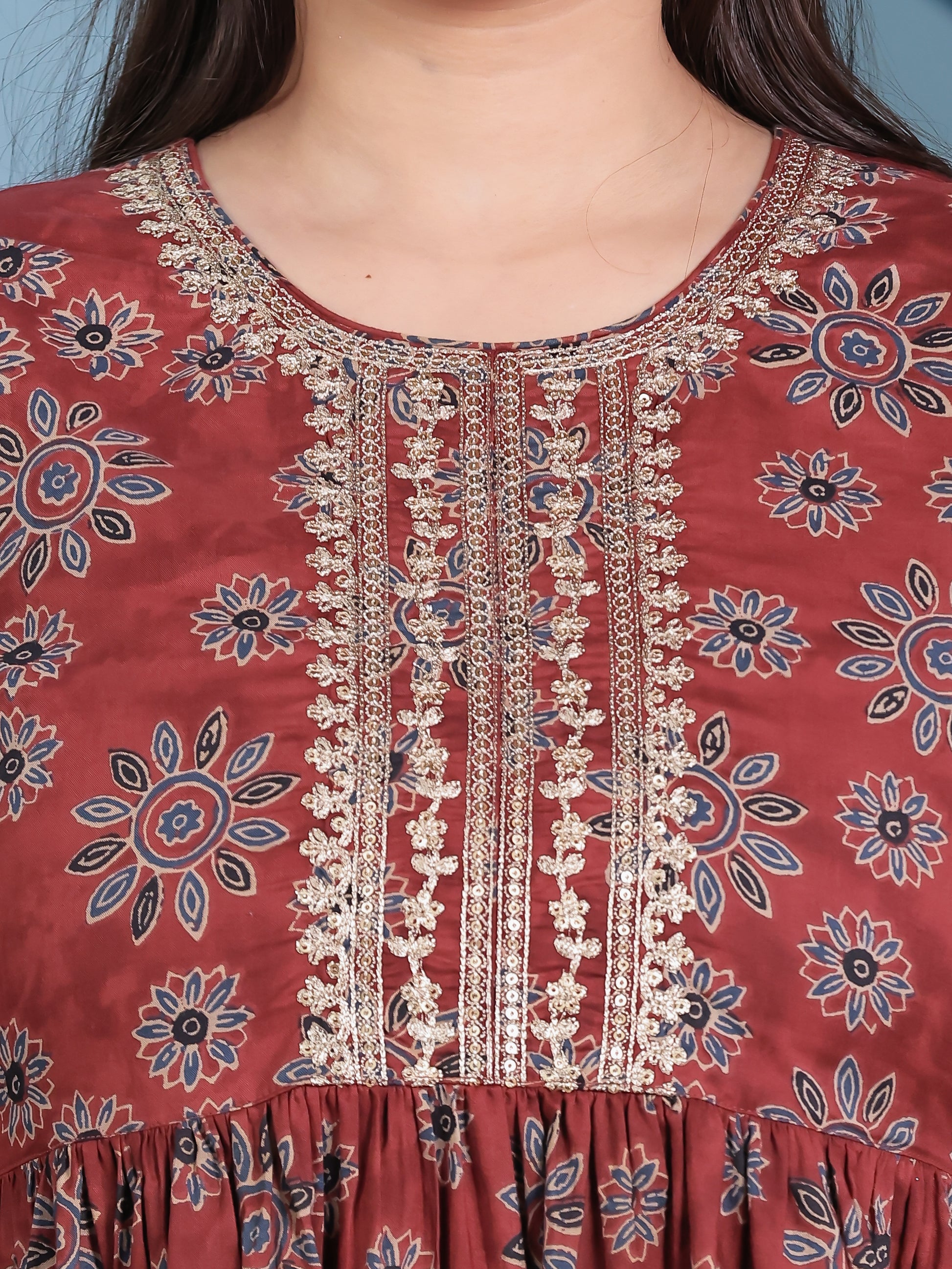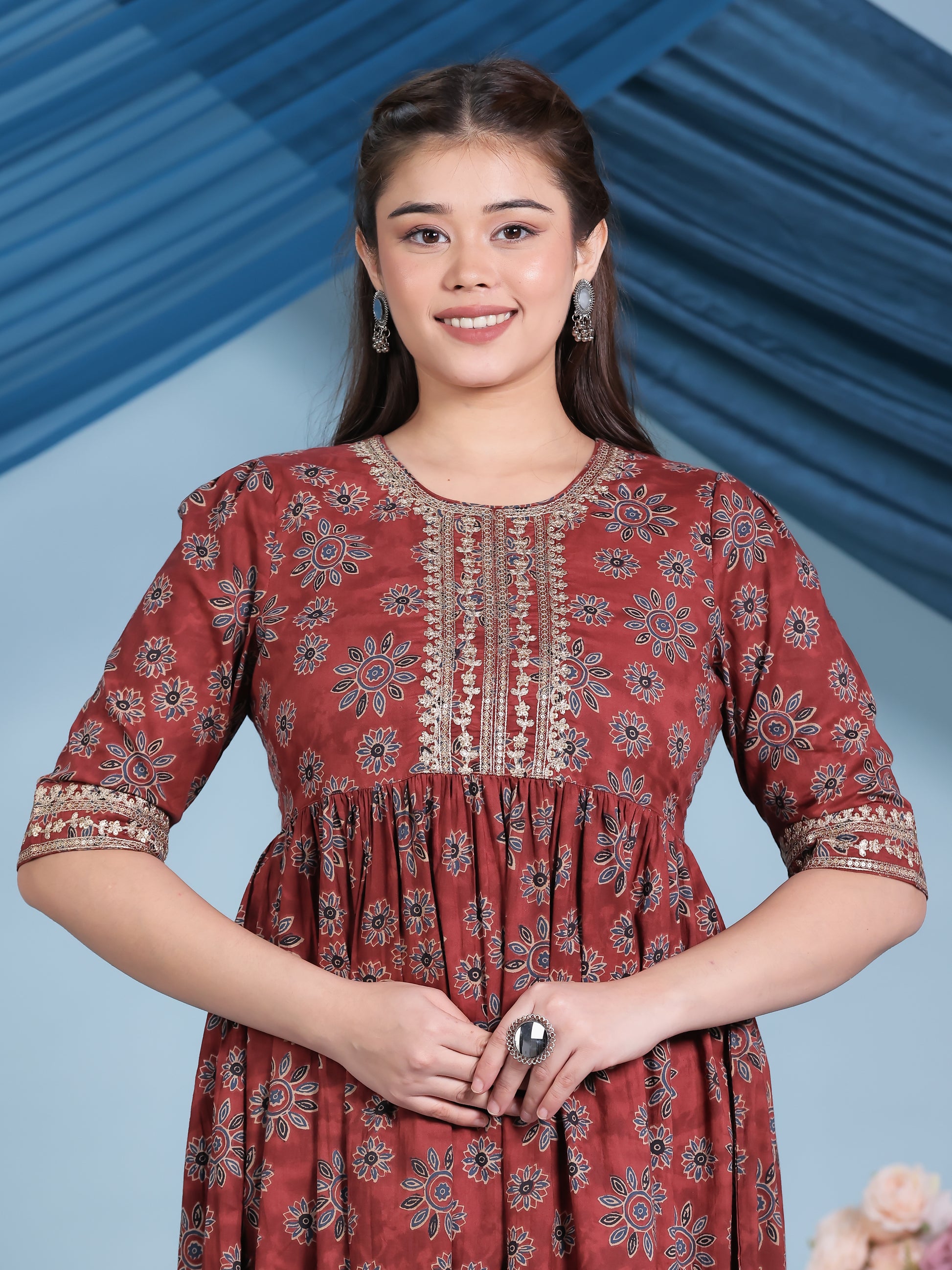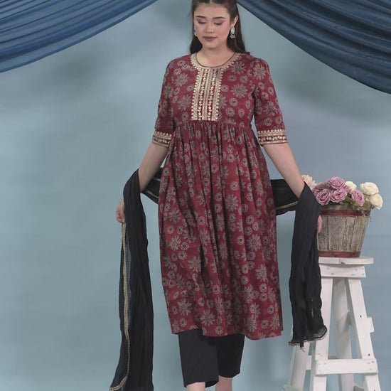 Embroidered Soft Cotton Floral Anarkali Rust Kurta