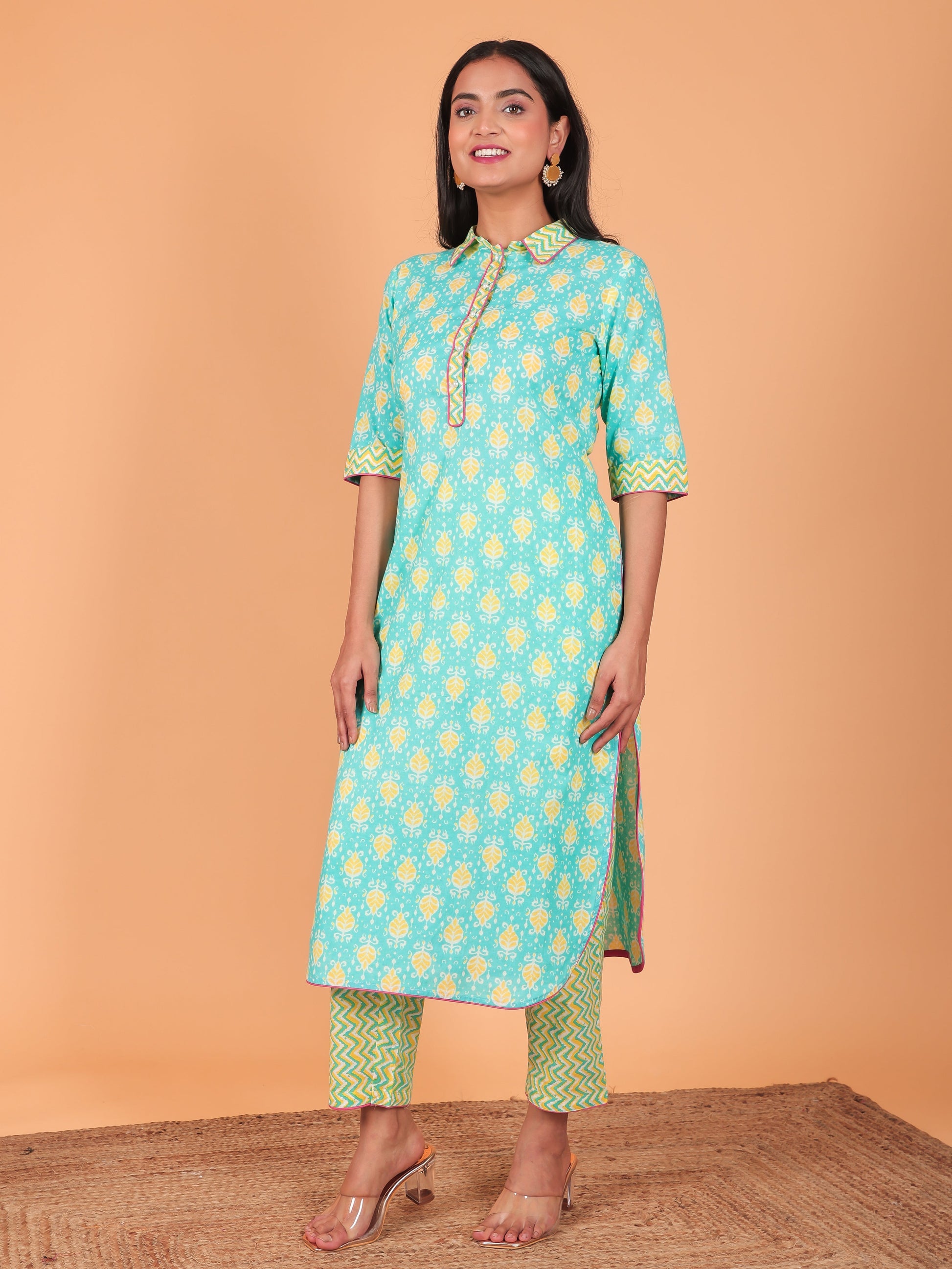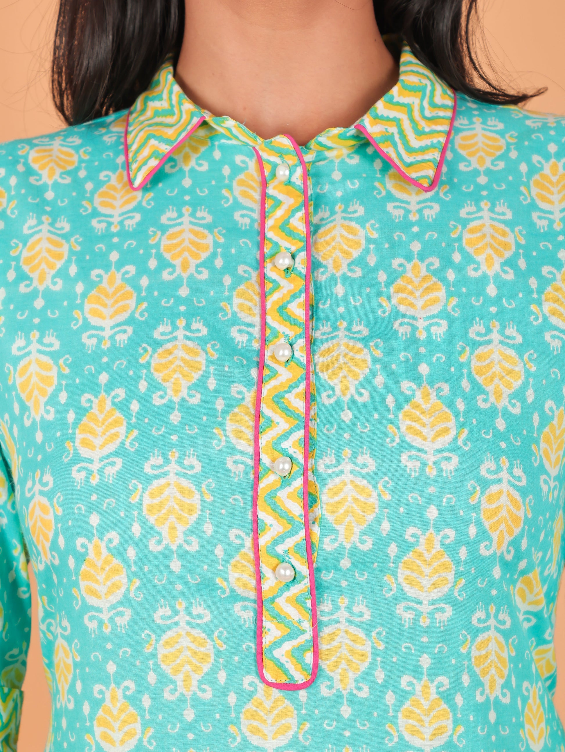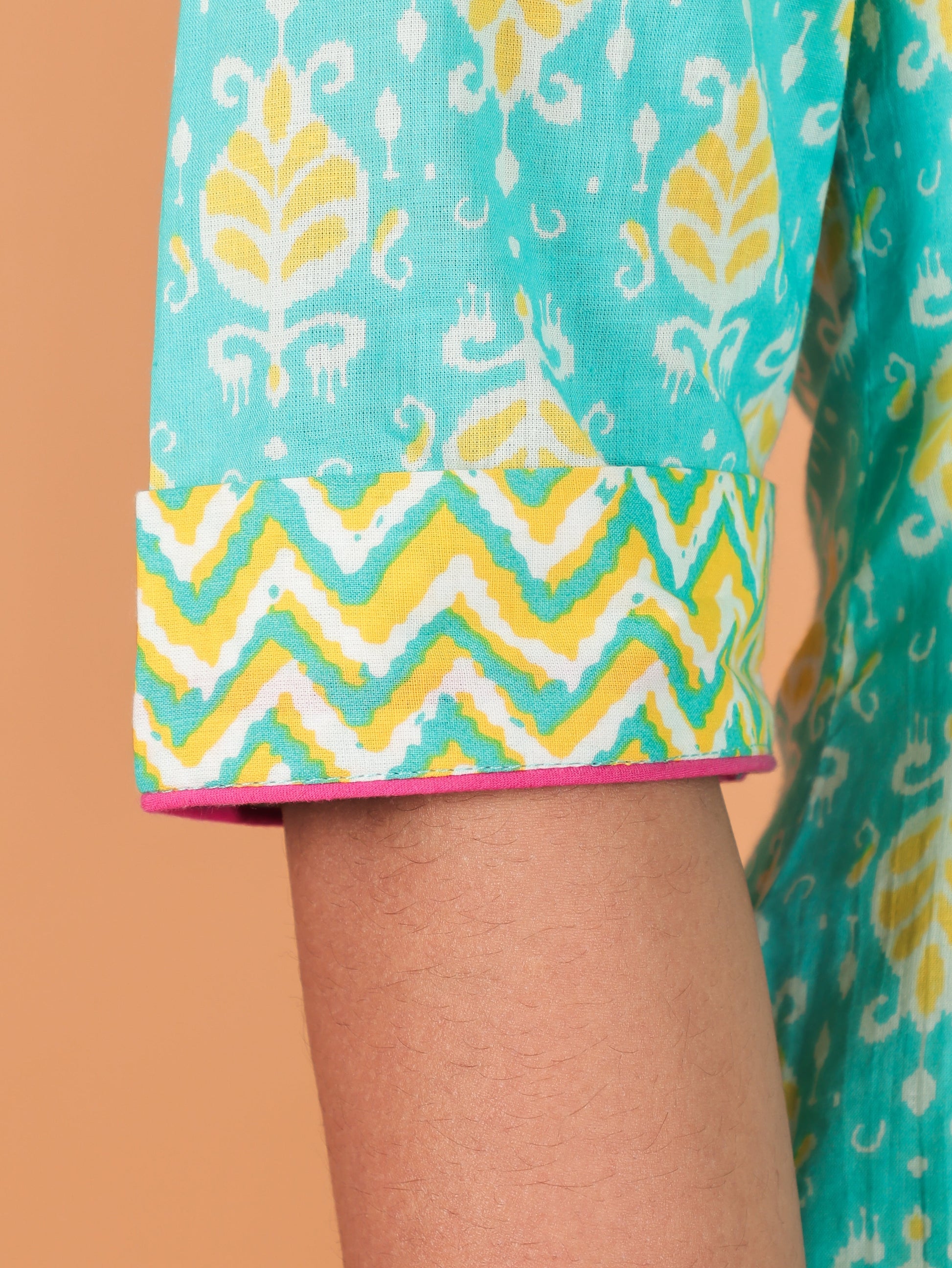 Soft Cotton Ikat Pathani Turquoise Kurta