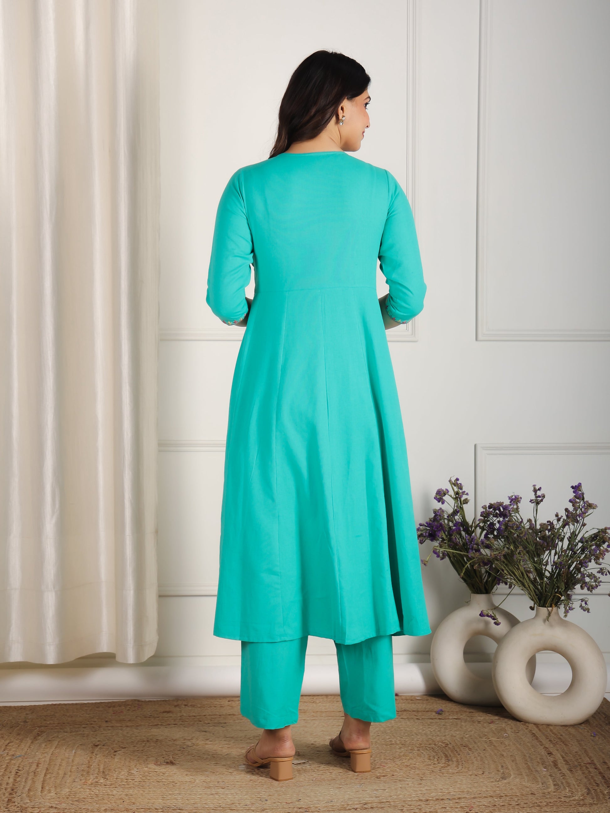 Embroidered Linen Cotton Solid Anarkali Sea Green Kurta