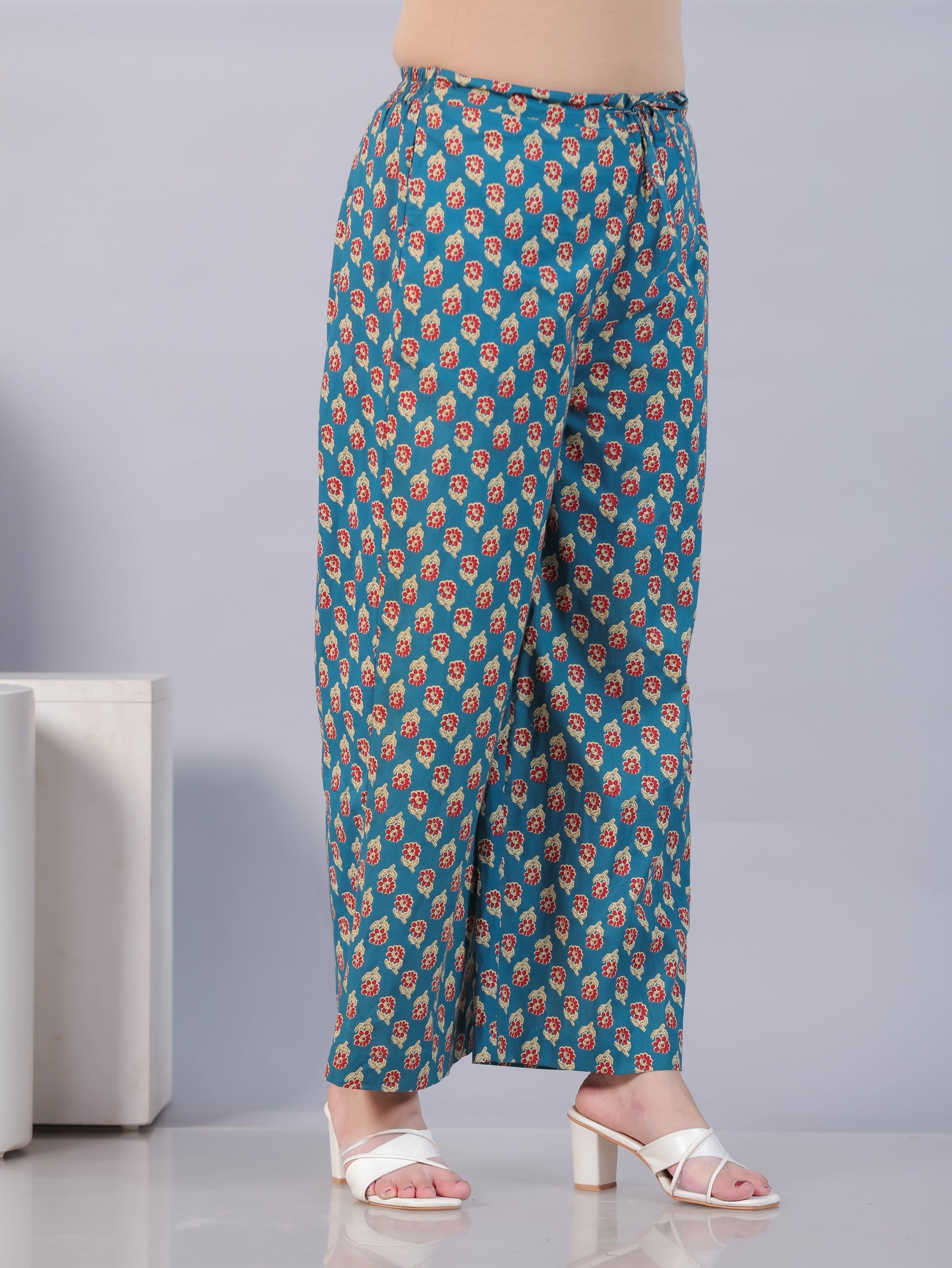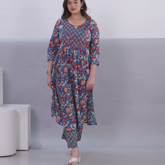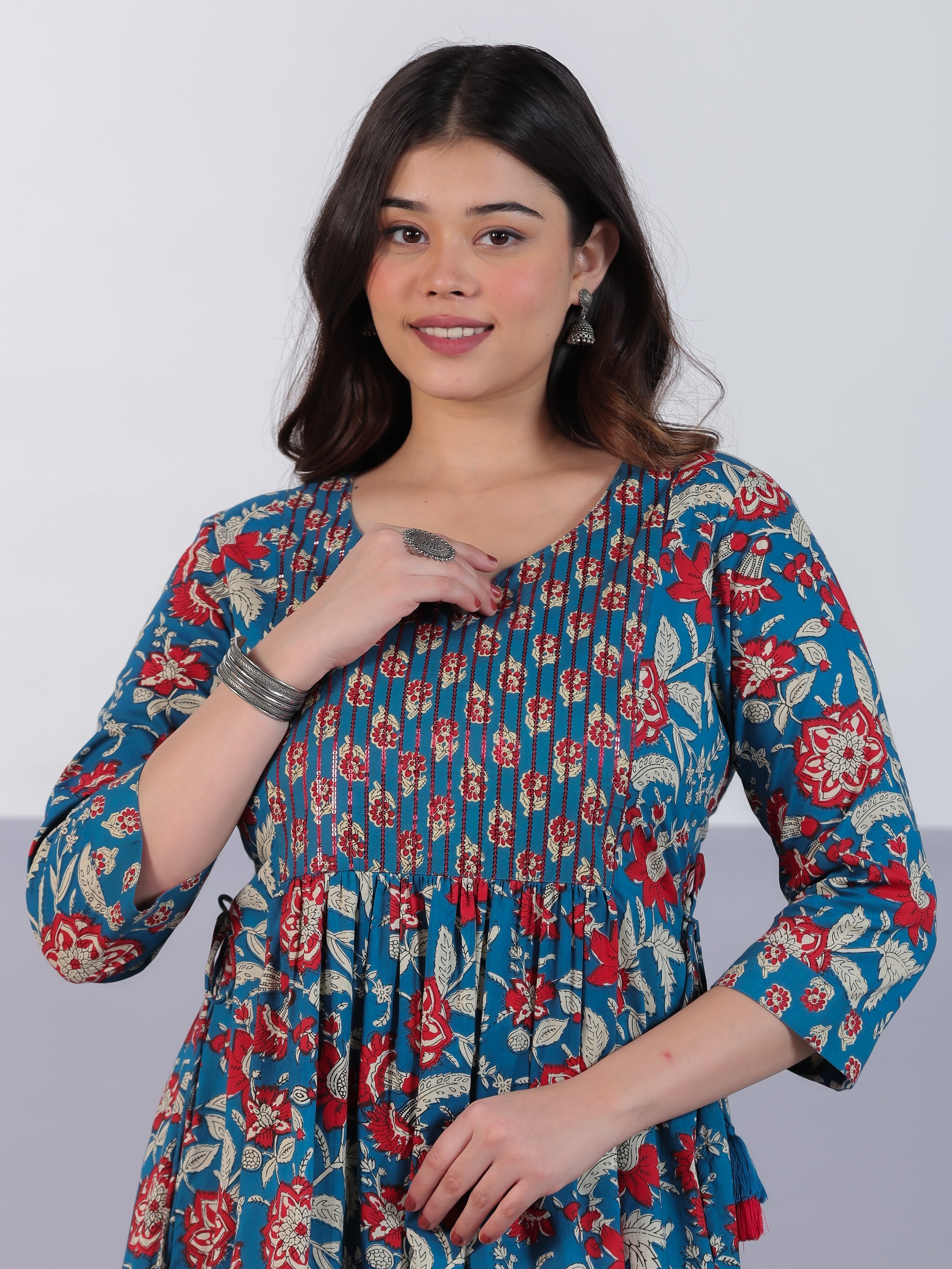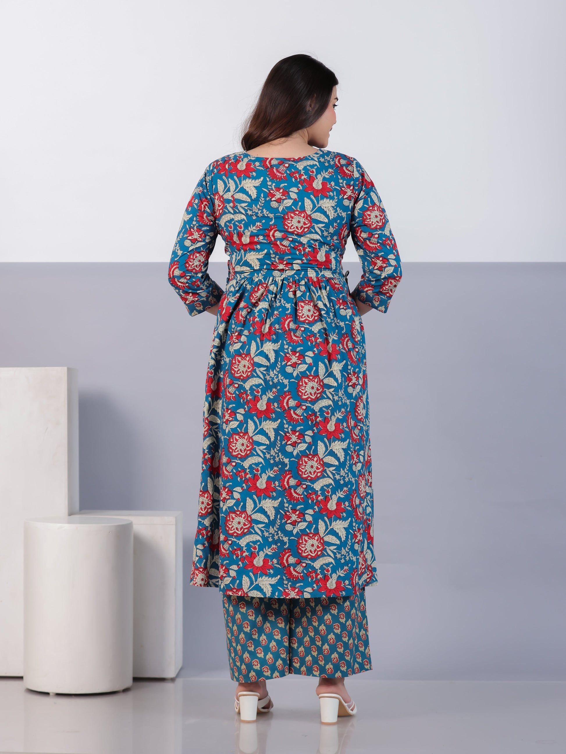 Embroidered Soft Cotton Floral Flared Teal Kurta