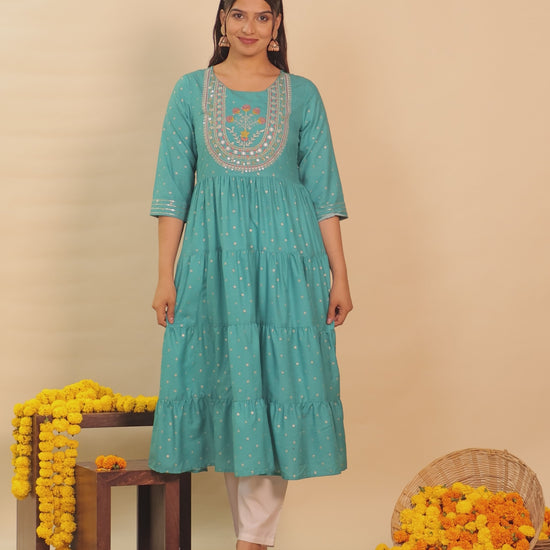 Embroidered Roman silk Gold foil Anarkali Teal Kurta
