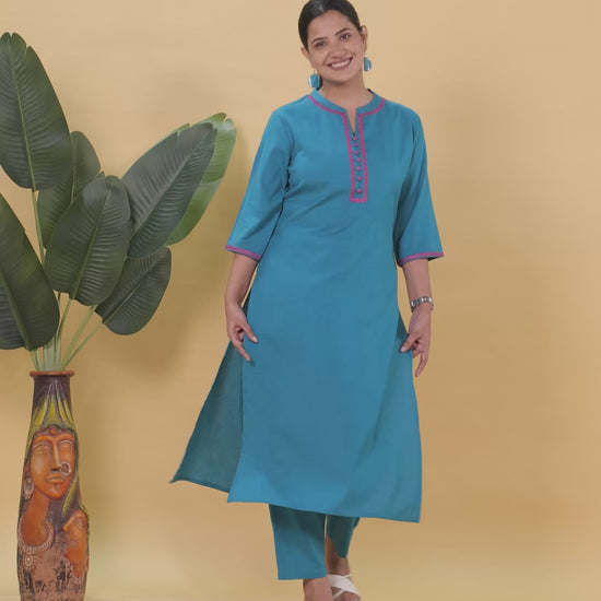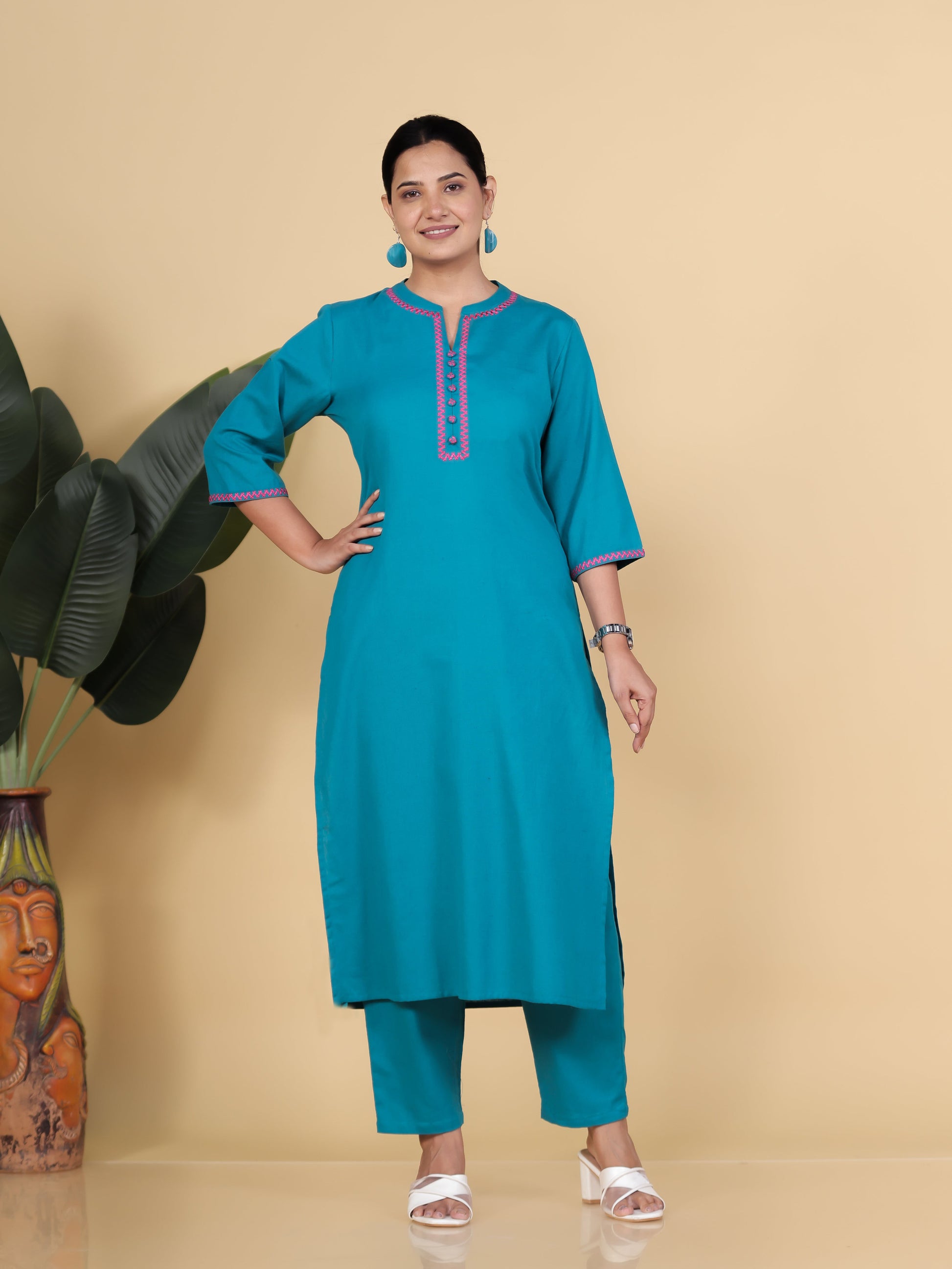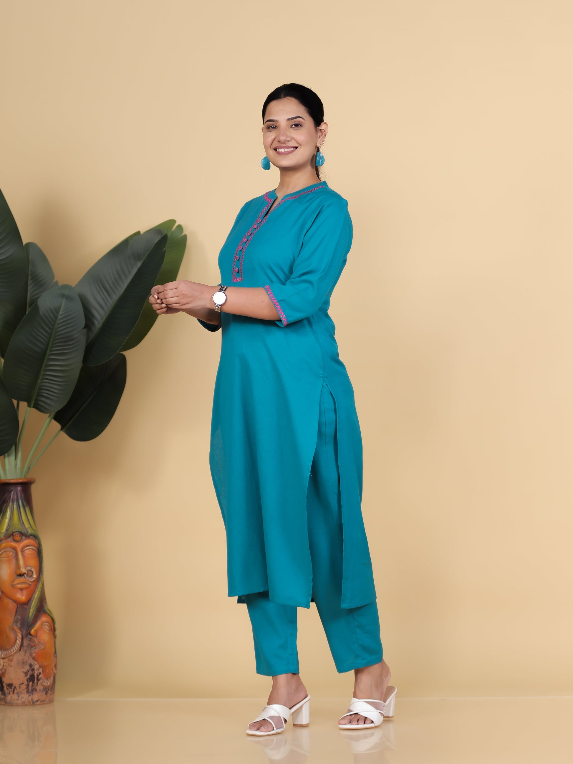 Embroidered Linen Cotton Solid Straight Teal Kurta