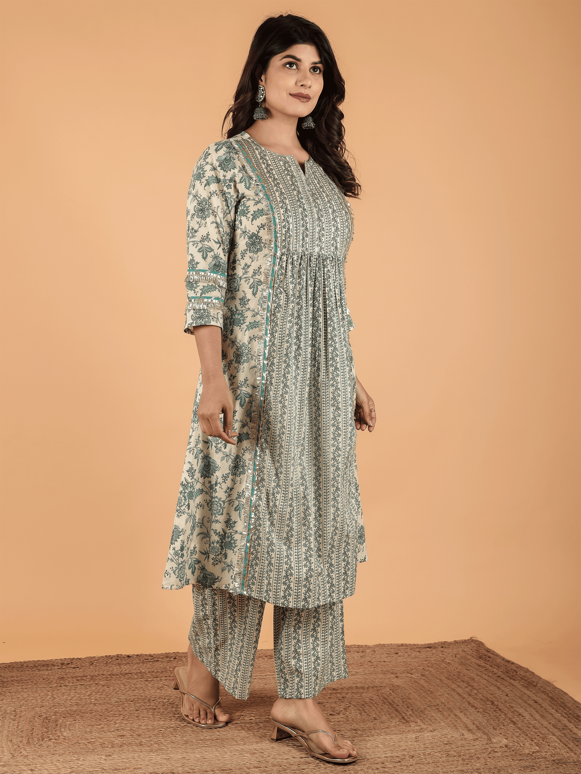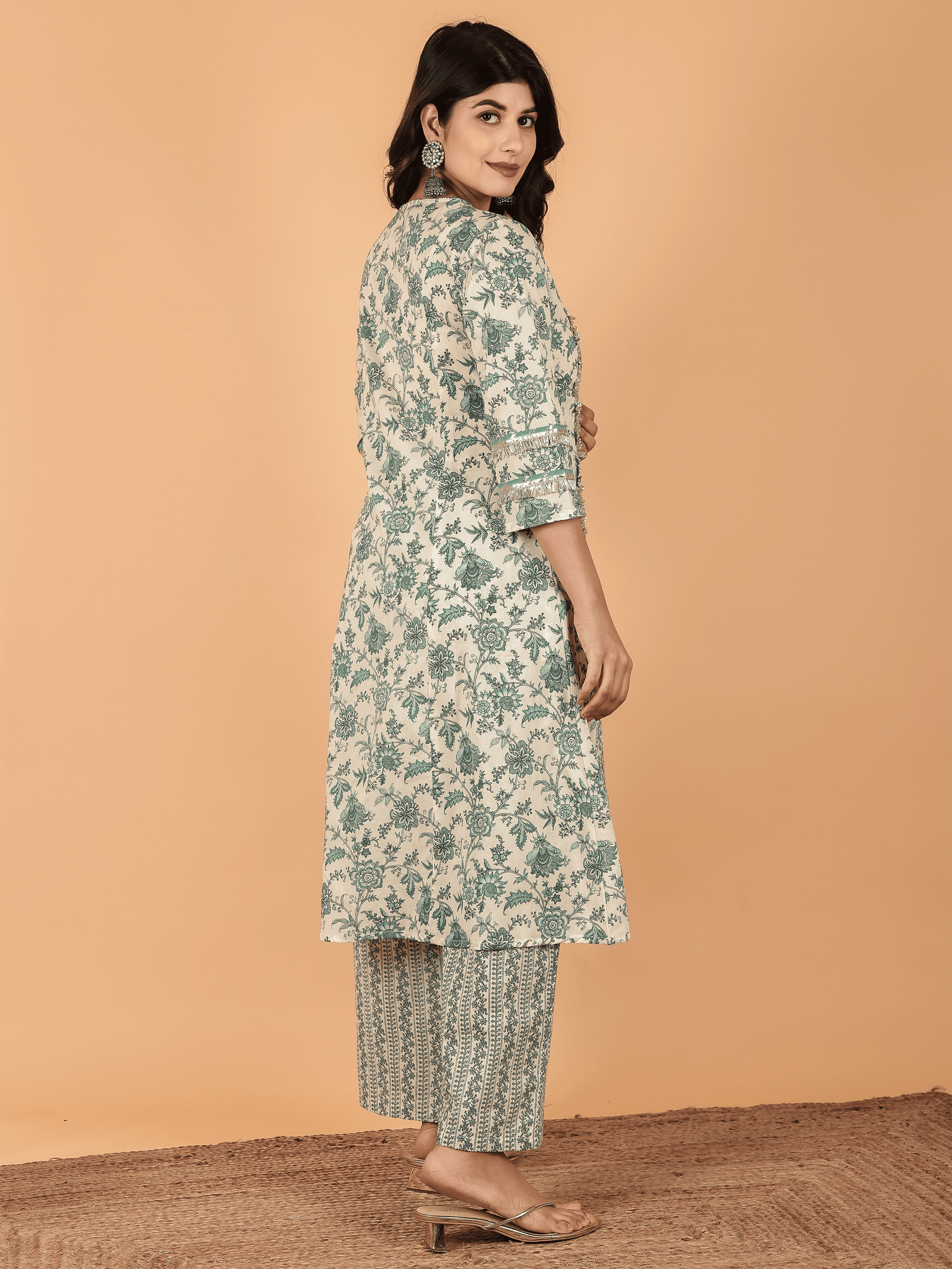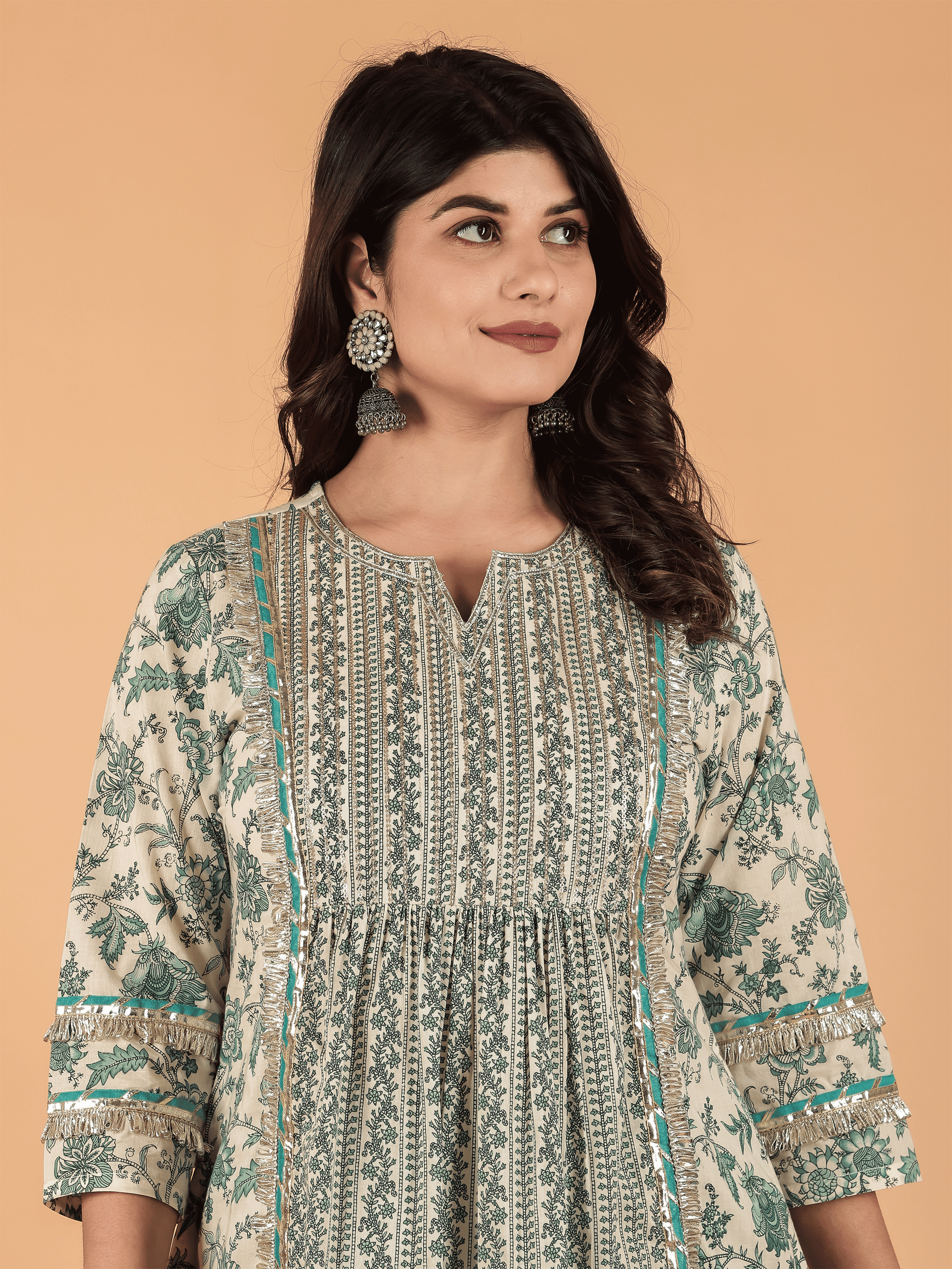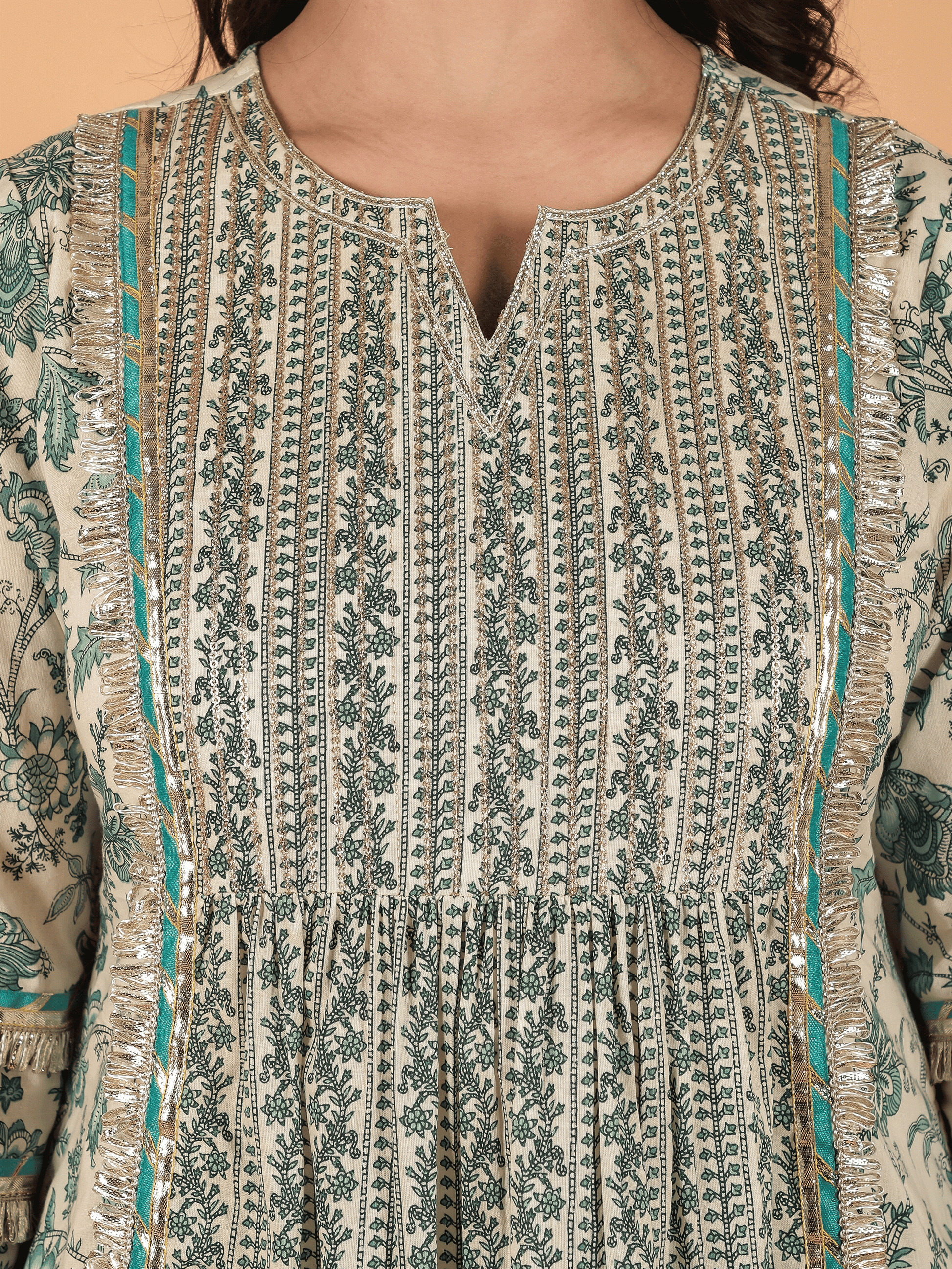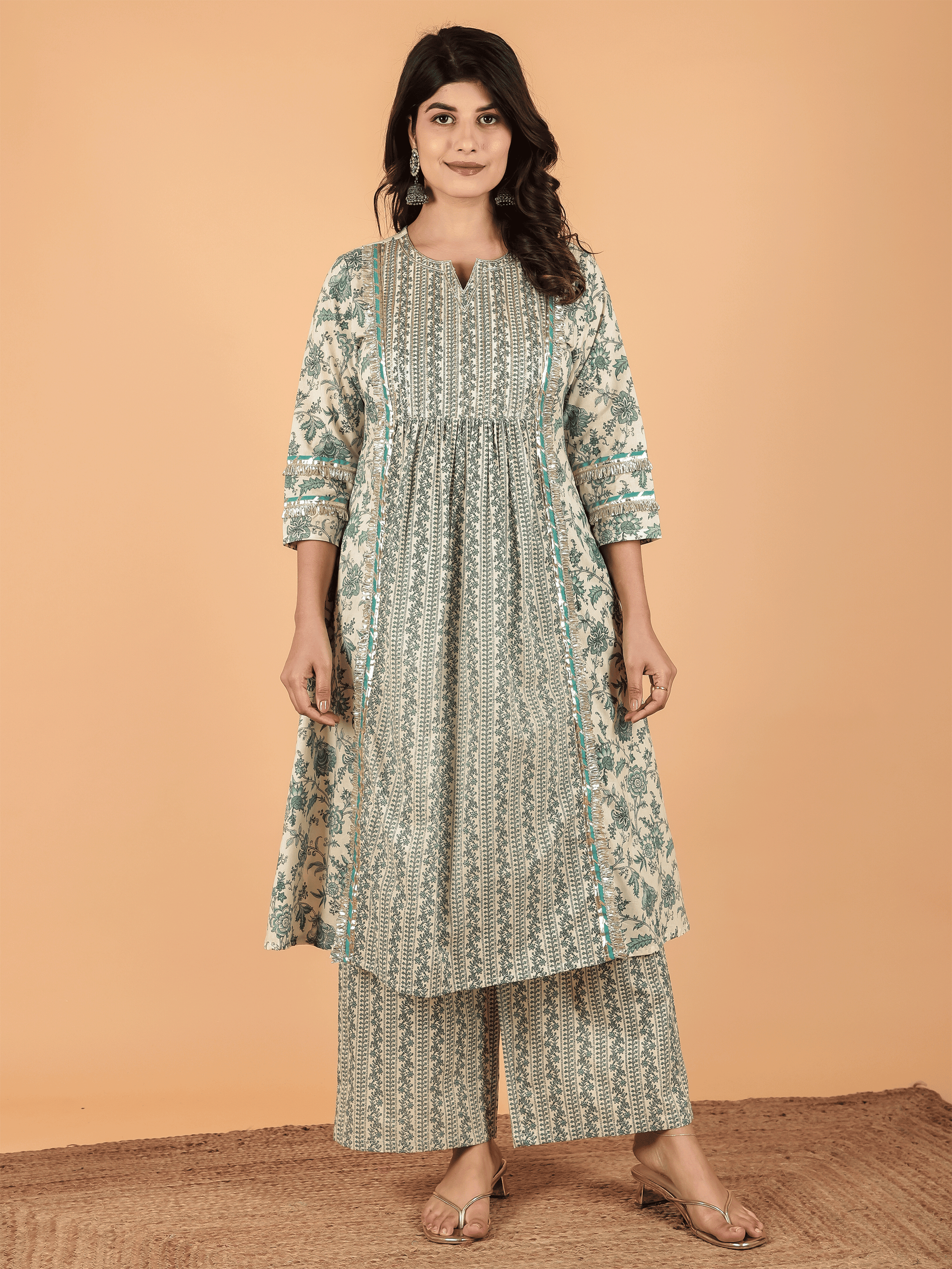 Crafted from breathable Soft Cotton, this Panelled kurta in Cream blends traditional design with everyday comfort. The Floral finish adds artisanal charm, while the Calf Length silhouette ensures effortless elegance. Style with palazzos or leggings for versatile looks, from workdays to weekend outings. Designed for easy care, this kurta stays beautiful with simple care instructions.