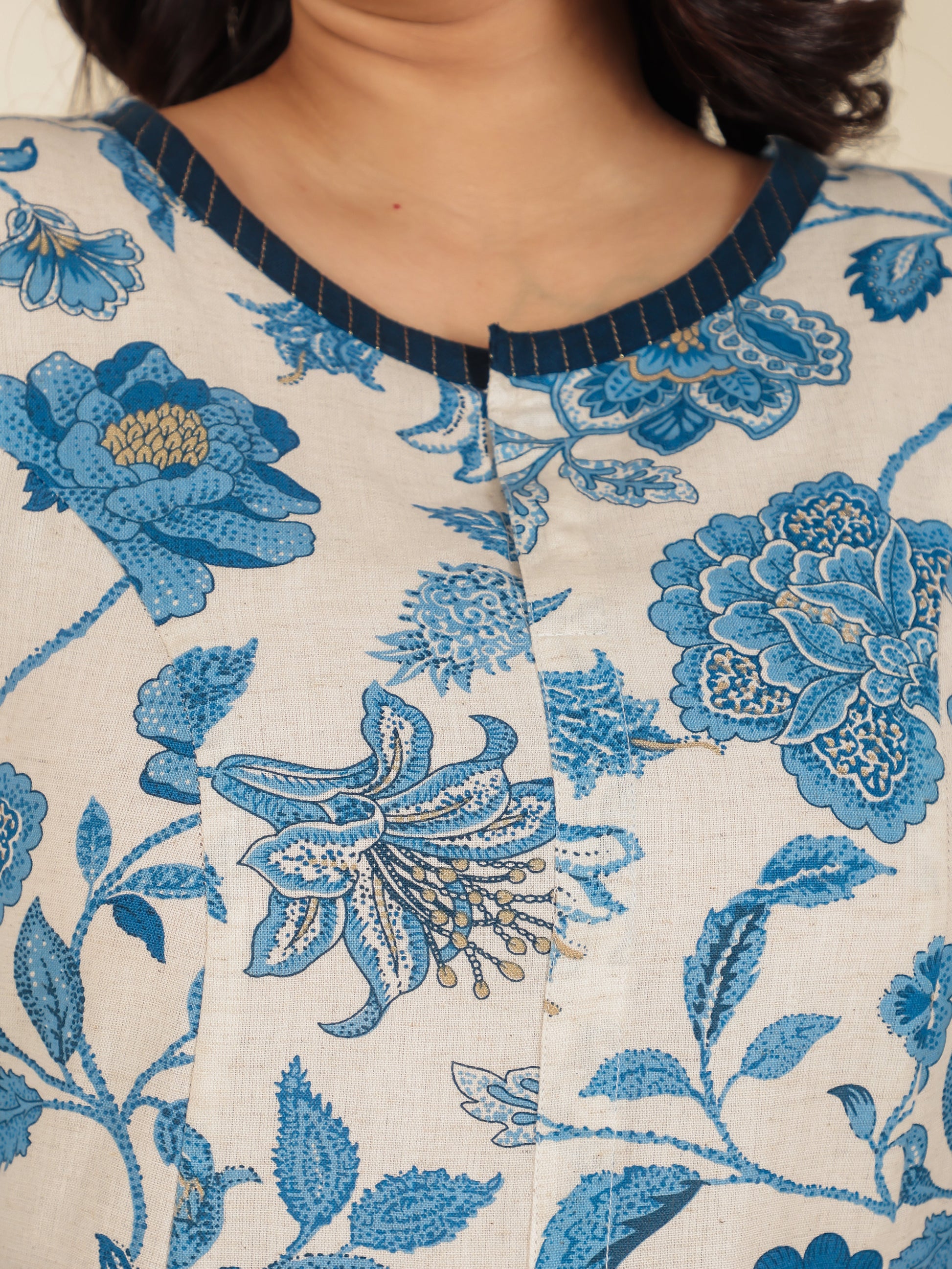 This Cream A-line kurta in soft Linen Cotton is a timeless pick for festive and casual wear. Designed with a Round neckline and 3/4 Sleeve sleeves, its graceful Calf Length cut flatters all body types. The delicate Floral detailing adds a touch of sophistication. Pair it with statement earrings and juttis for a polished look. Maintain its pristine look by following proper care instructions.