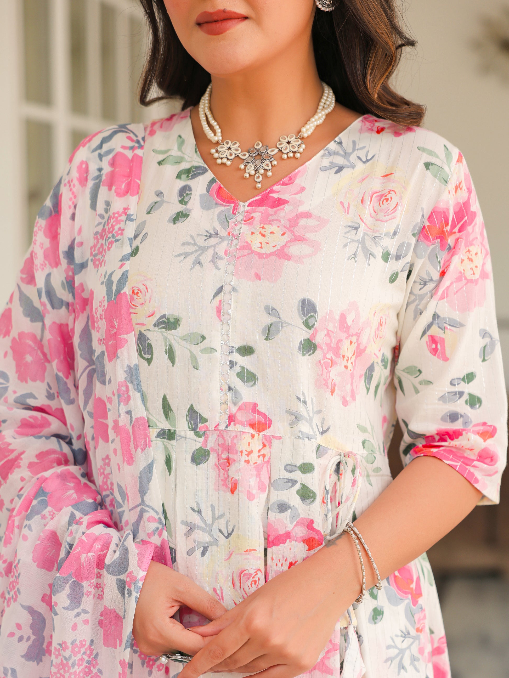 Lurex Cotton Floral A-line White Kurta