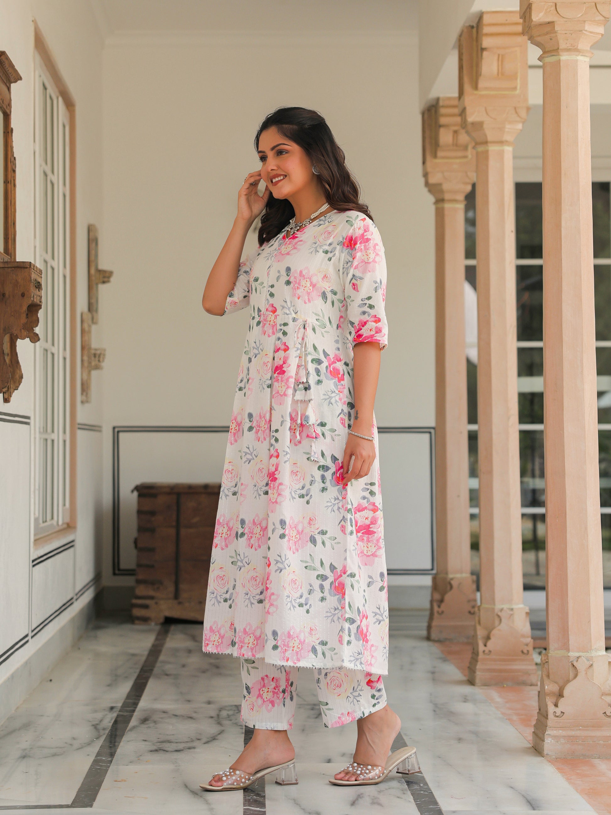 Elevate your ethnic wardrobe with this Lurex Cotton kurta in a stunning White hue. Featuring an elegant A-line fit and striking Floral accents, it’s perfect for festive celebrations or family gatherings. The V neckline and Elbow Length Sleeve provide all-day comfort. Team with gold-toned accessories for an effortlessly chic vibe. Maintain its charm by following proper care instructions.