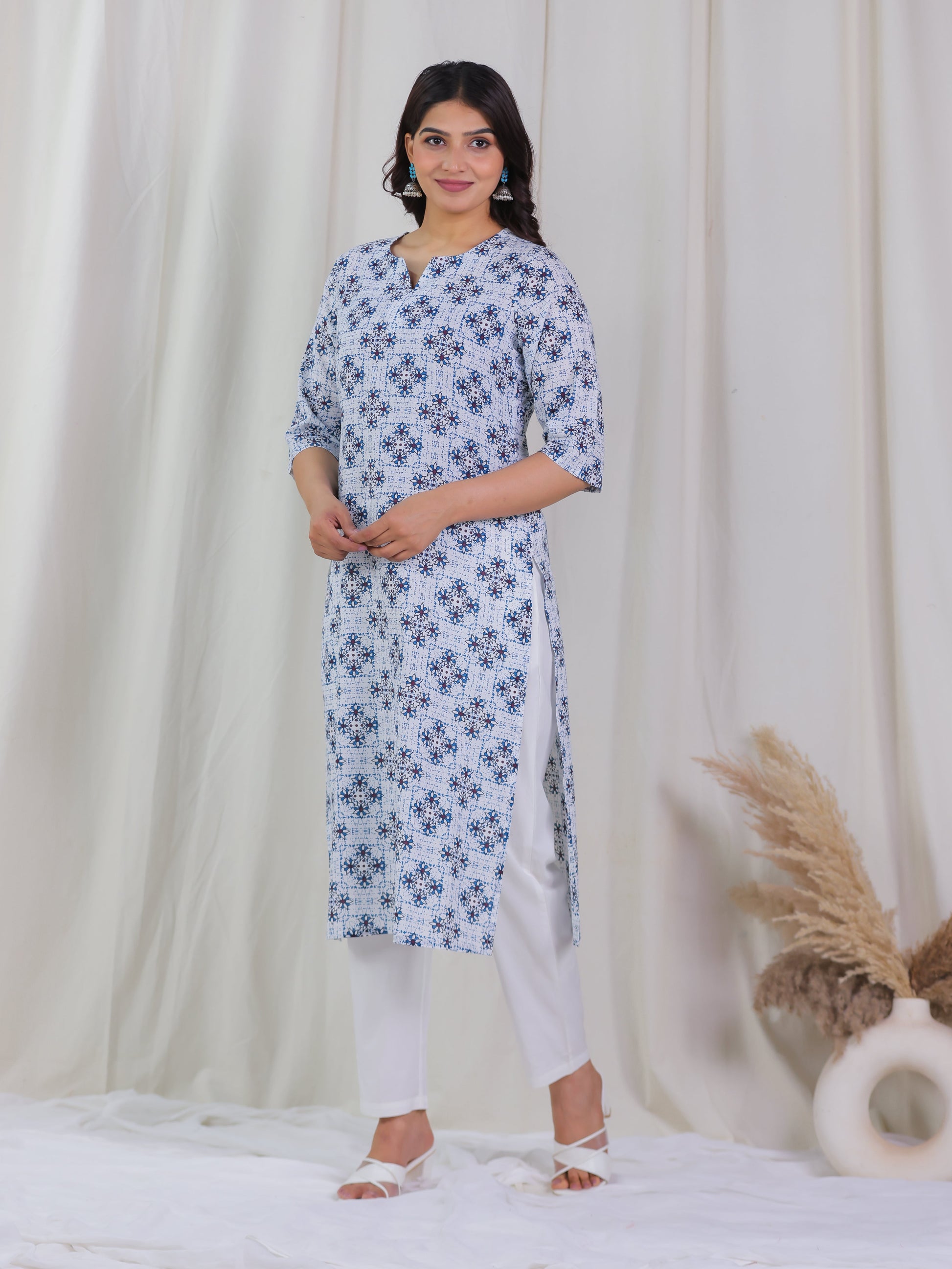 This White Soft Cotton kurta with a Straight flare is designed for comfort and style. Featuring a Round neckline, 3/4 Sleeve sleeves, and a graceful Calf Length hemline, it’s perfect for festive wear or semi-formal gatherings. The Geometric highlights add depth and texture, making it a standout piece. Accessorise with a contrasting dupatta and keep it pristine by following proper care instructions.