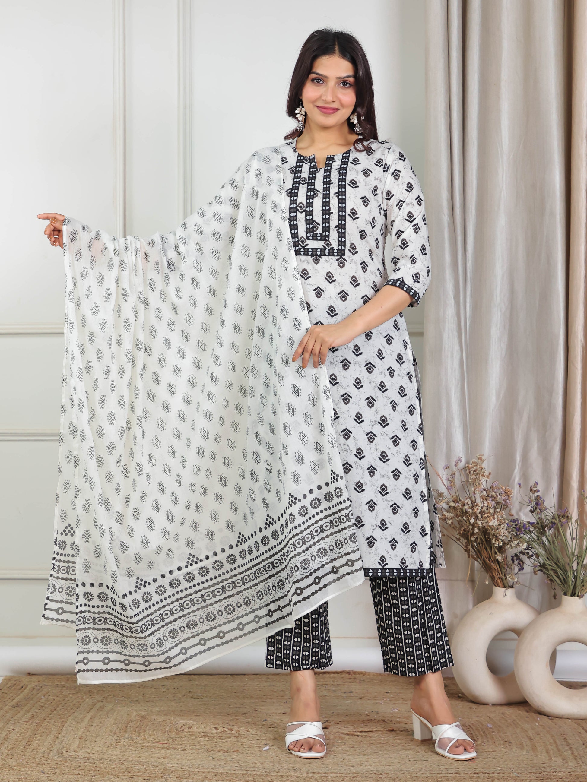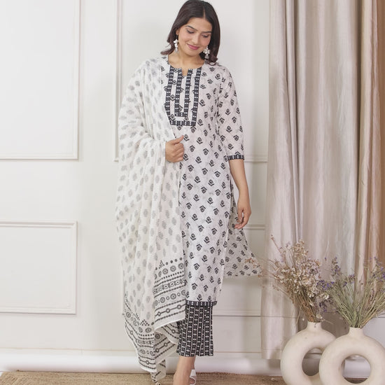 This White Straight kurta in soft Soft Cotton is a timeless pick for festive and casual wear. Designed with a Round neckline and 3/4 Sleeve sleeves, its graceful Calf Length cut flatters all body types. The delicate Ikat detailing adds a touch of sophistication. Pair it with statement earrings and juttis for a polished look. Maintain its pristine look by following proper care instructions.