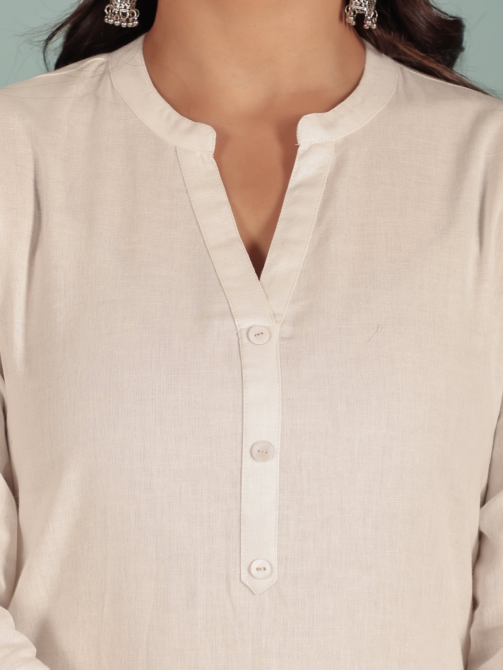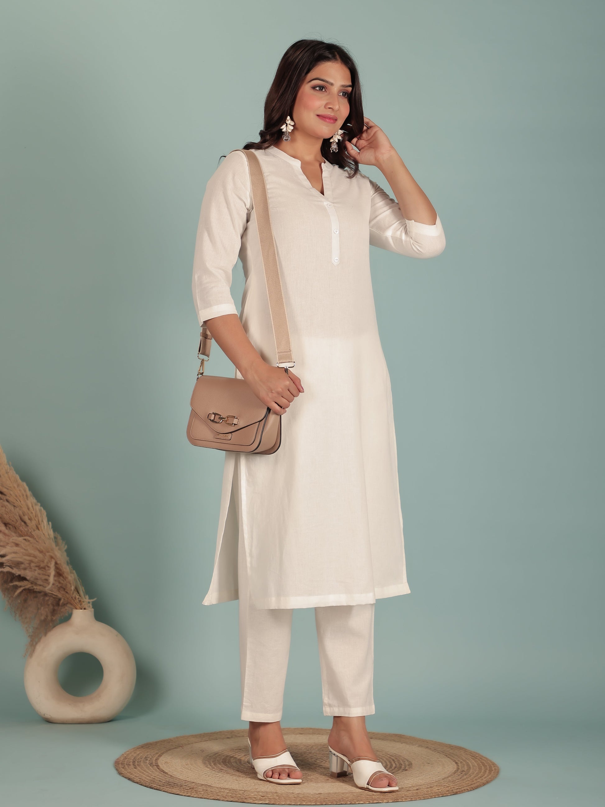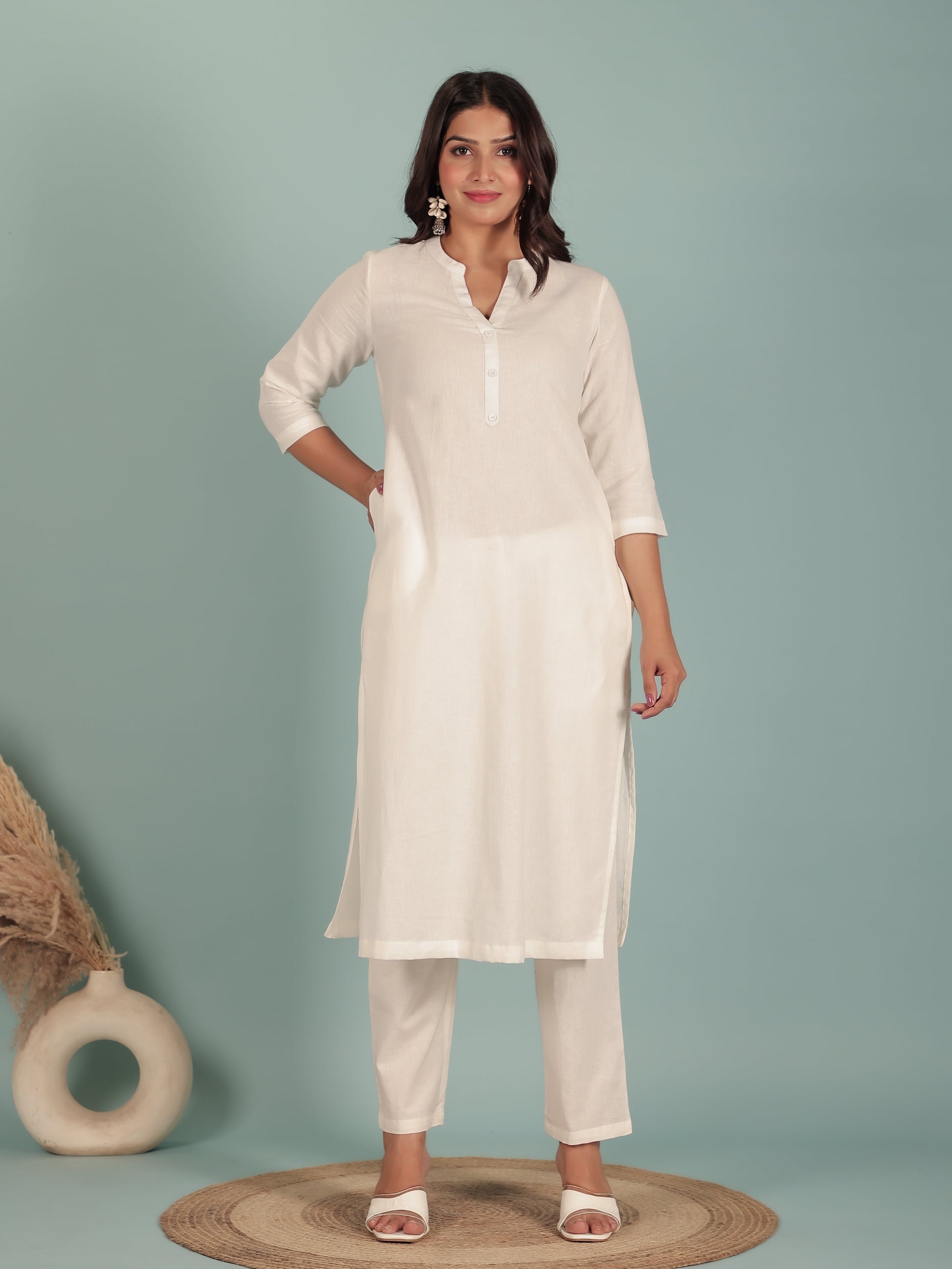 This White Straight kurta in soft Linen Cotton is a timeless pick for festive and casual wear. Designed with a Mandarin Collar neckline and 3/4 Sleeve sleeves, its graceful Calf Length cut flatters all body types. The delicate Solid detailing adds a touch of sophistication. Pair it with statement earrings and juttis for a polished look. Maintain its pristine look by following proper care instructions.