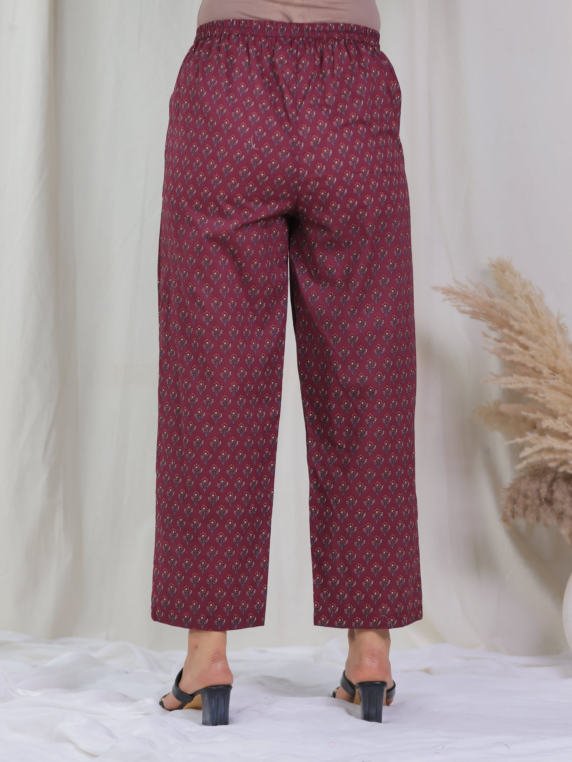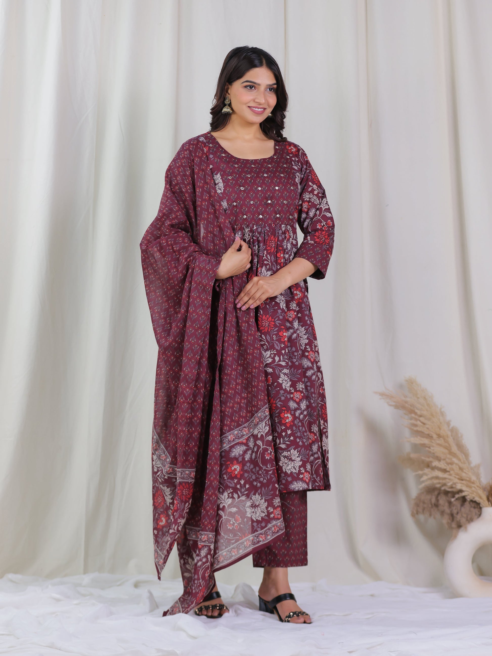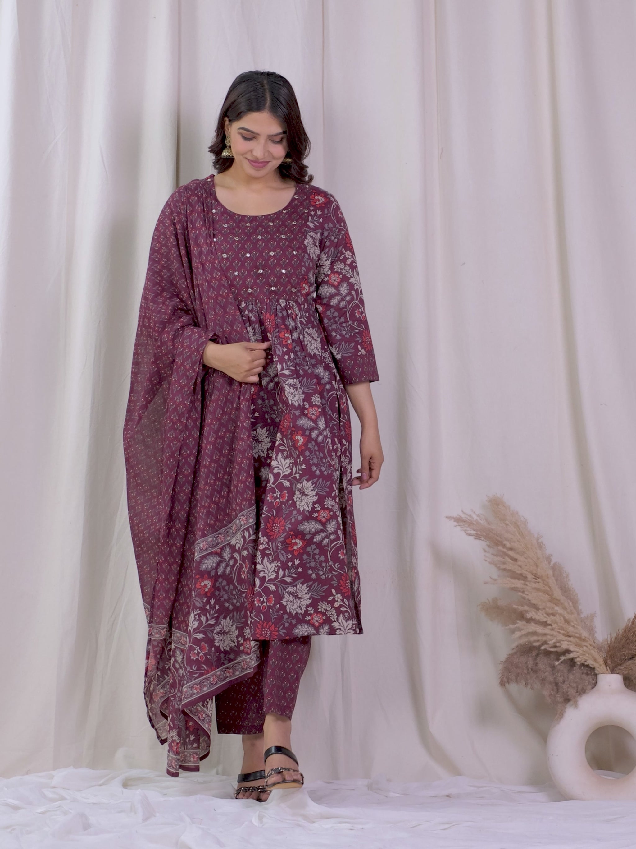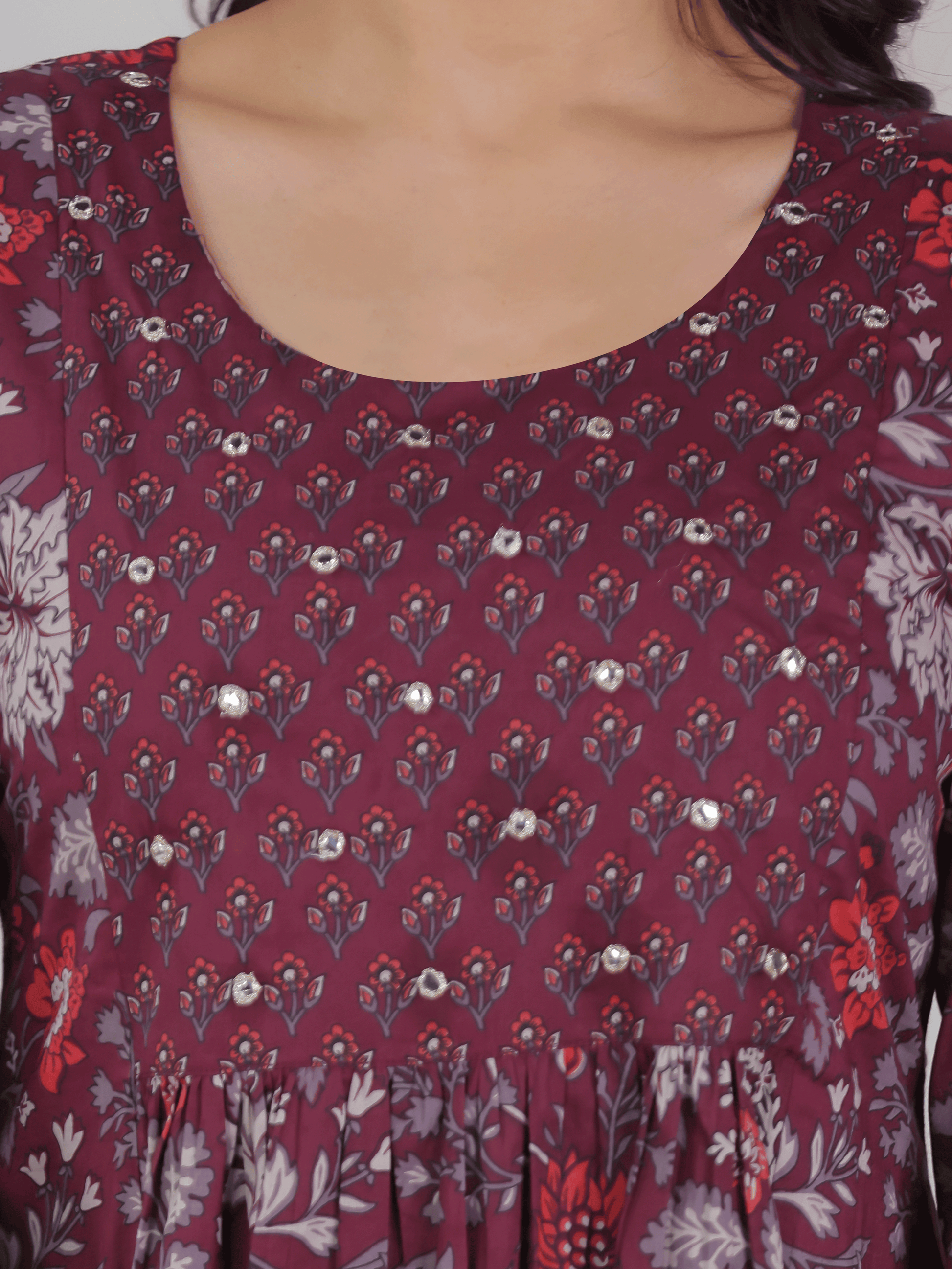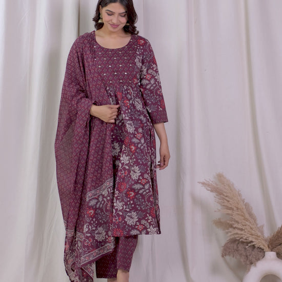 Embroidered Soft Cotton Floral Flared Wine Kurta