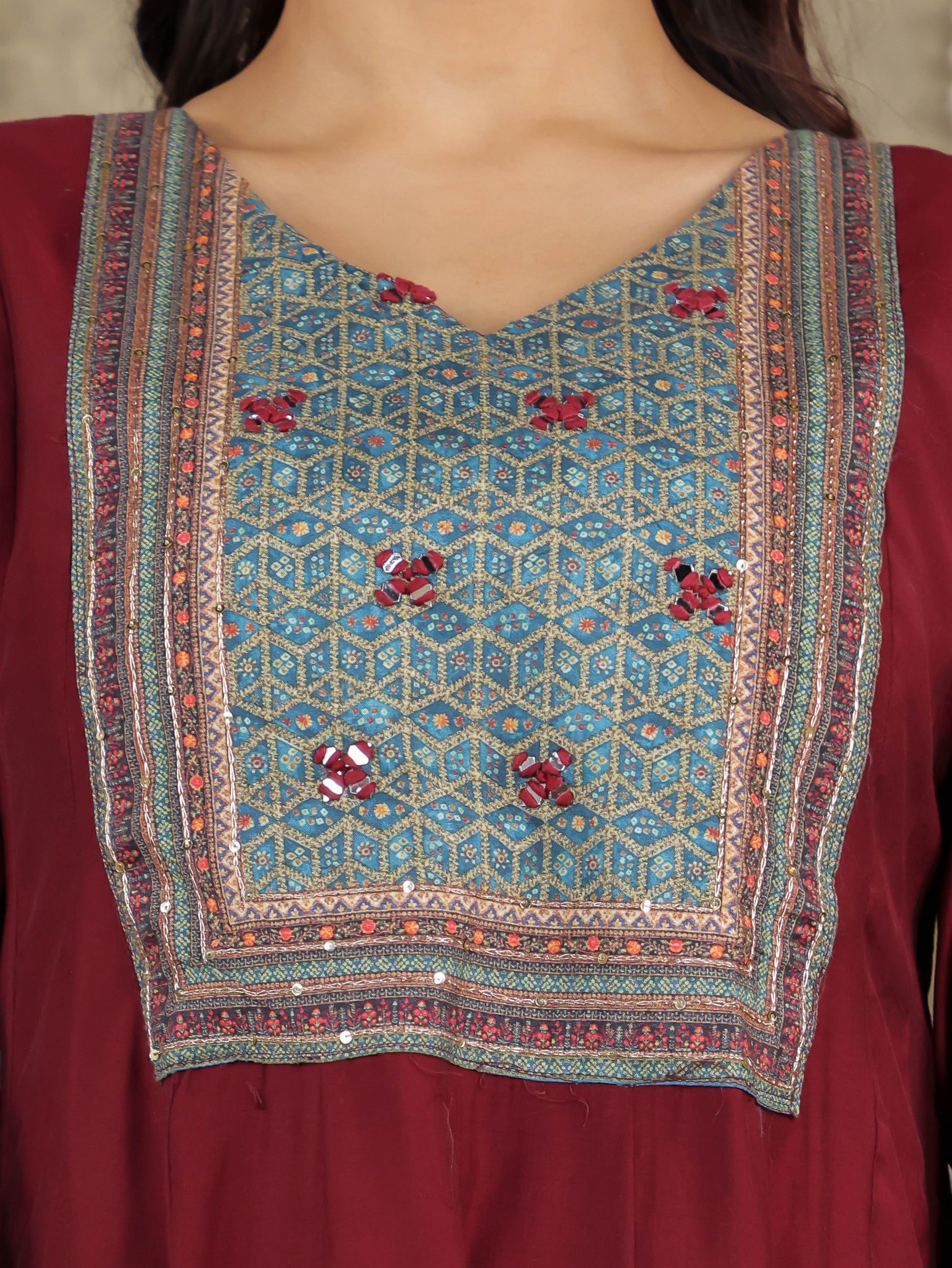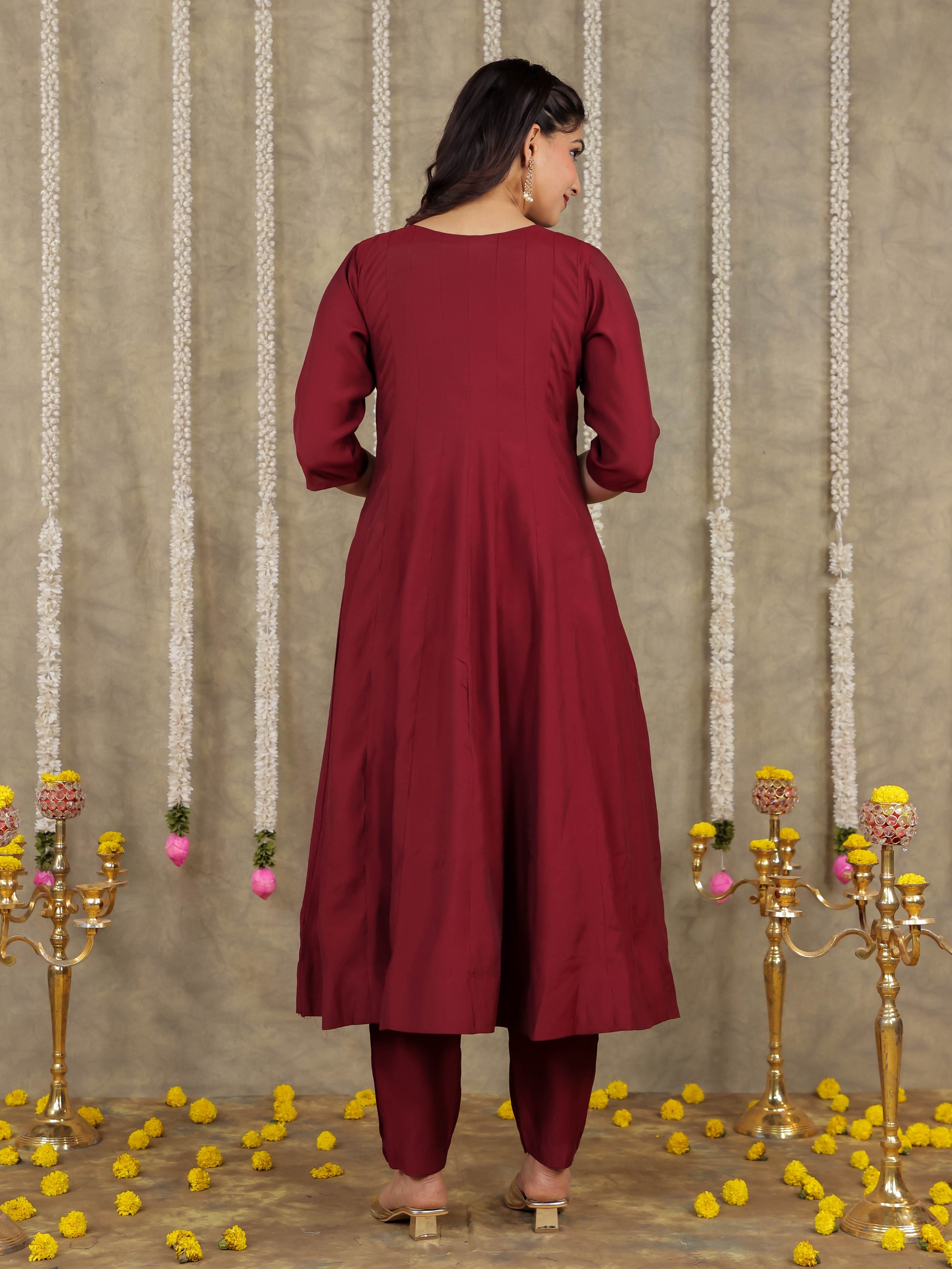 Crafted from breathable Romen silk, this kurta in Wine blends traditional design with everyday comfort. The Solid finish adds artisanal charm, while the silhouette ensures effortless elegance. Style with palazzos or leggings for versatile looks, from workdays to weekend outings. Designed for easy care, this kurta stays beautiful with simple care instructions.