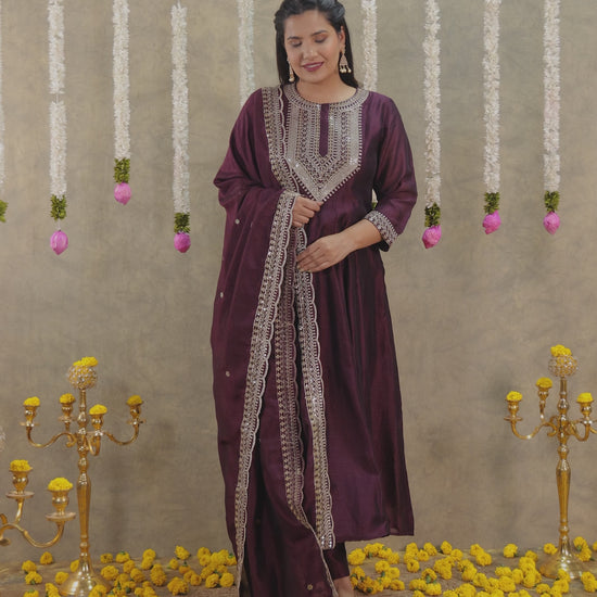 Embroidered Tissue chanderi Solid Anarkali Wine Kurta