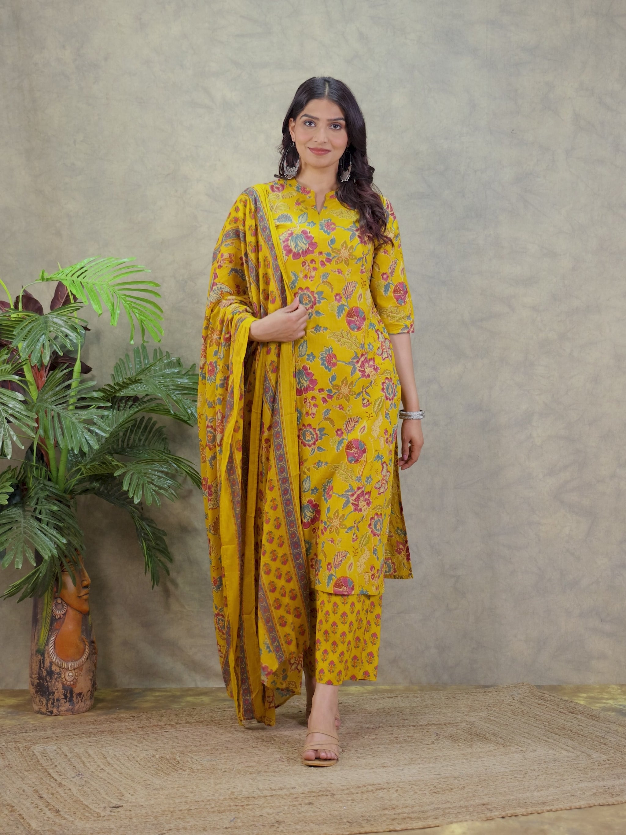 This Yellow Straight kurta in soft Soft Cotton is a timeless pick for festive and casual wear. Designed with a Mandarin Collar neckline and 3/4 Sleeve sleeves, its graceful Calf Length cut flatters all body types. The delicate Floral detailing adds a touch of sophistication. Pair it with statement earrings and juttis for a polished look. Maintain its pristine look by following proper care instructions.