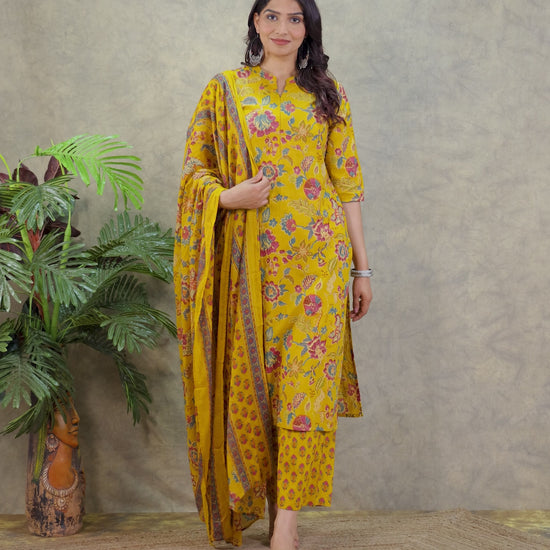 This yellow floral kurta & trousers offers the perfect blend of comfort and style. The beautiful floral pattern complements the elegant mandarin collar neckline. Paired with trousers that create a versatile fusion of ethnic and western elements. These artisanal button work creates visual interest while offering easy wearability. The classic straight silhouette offers a timeless look with clean lines and comfortable mobility. This calf length kurta features 3/4 sleeve that provide a balanced look.