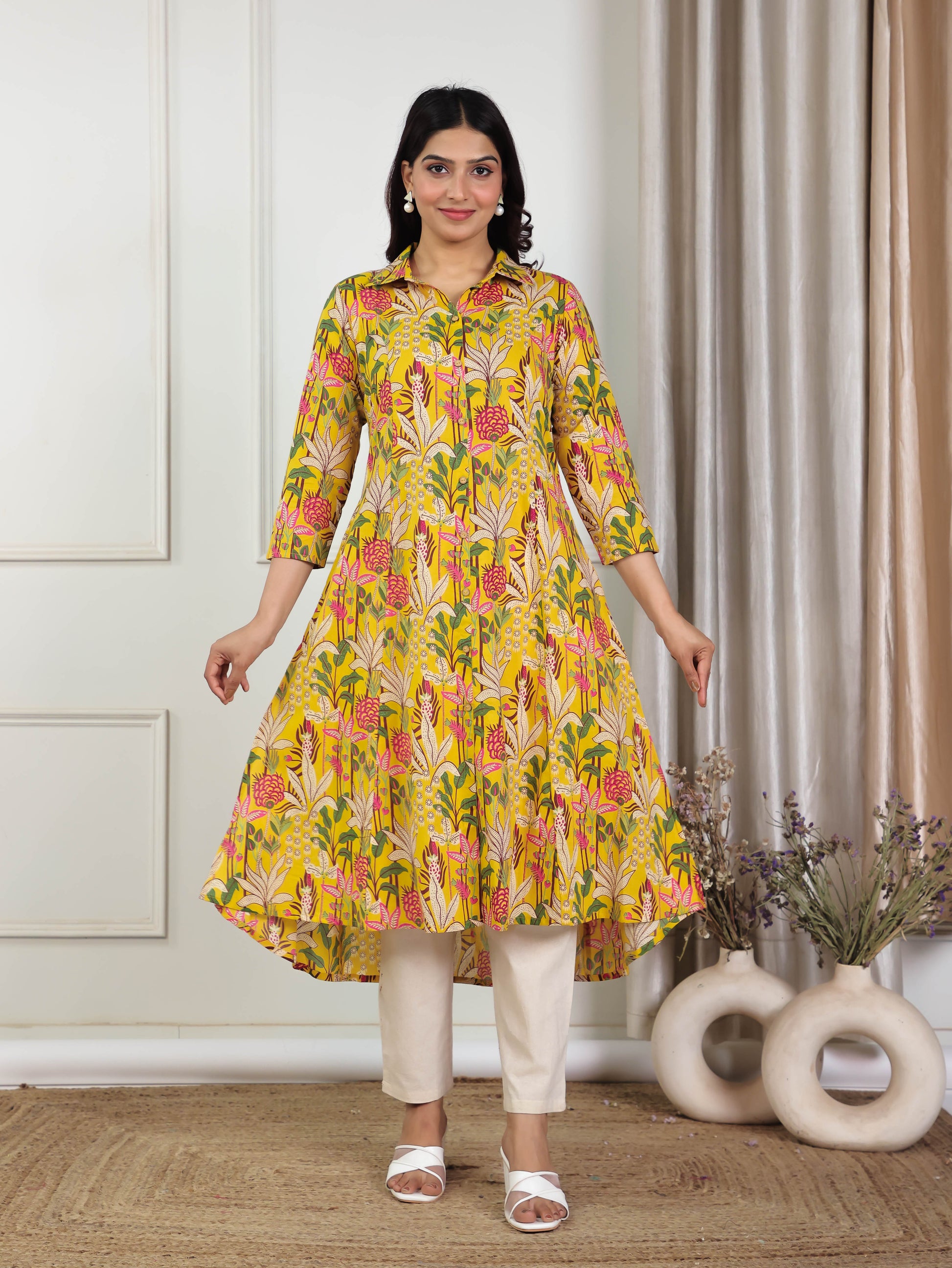 This Yellow Soft Cotton kurta with a High Low flare is designed for comfort and style. Featuring a Collared neckline, 3/4 Sleeve sleeves, and a graceful Calf Length hemline, it’s perfect for festive wear or semi-formal gatherings. The Floral highlights add depth and texture, making it a standout piece. Accessorise with a contrasting dupatta and keep it pristine by following proper care instructions.