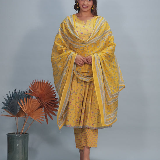 Embroidered Soft Cotton Floral Anarkali Yellow Kurta
