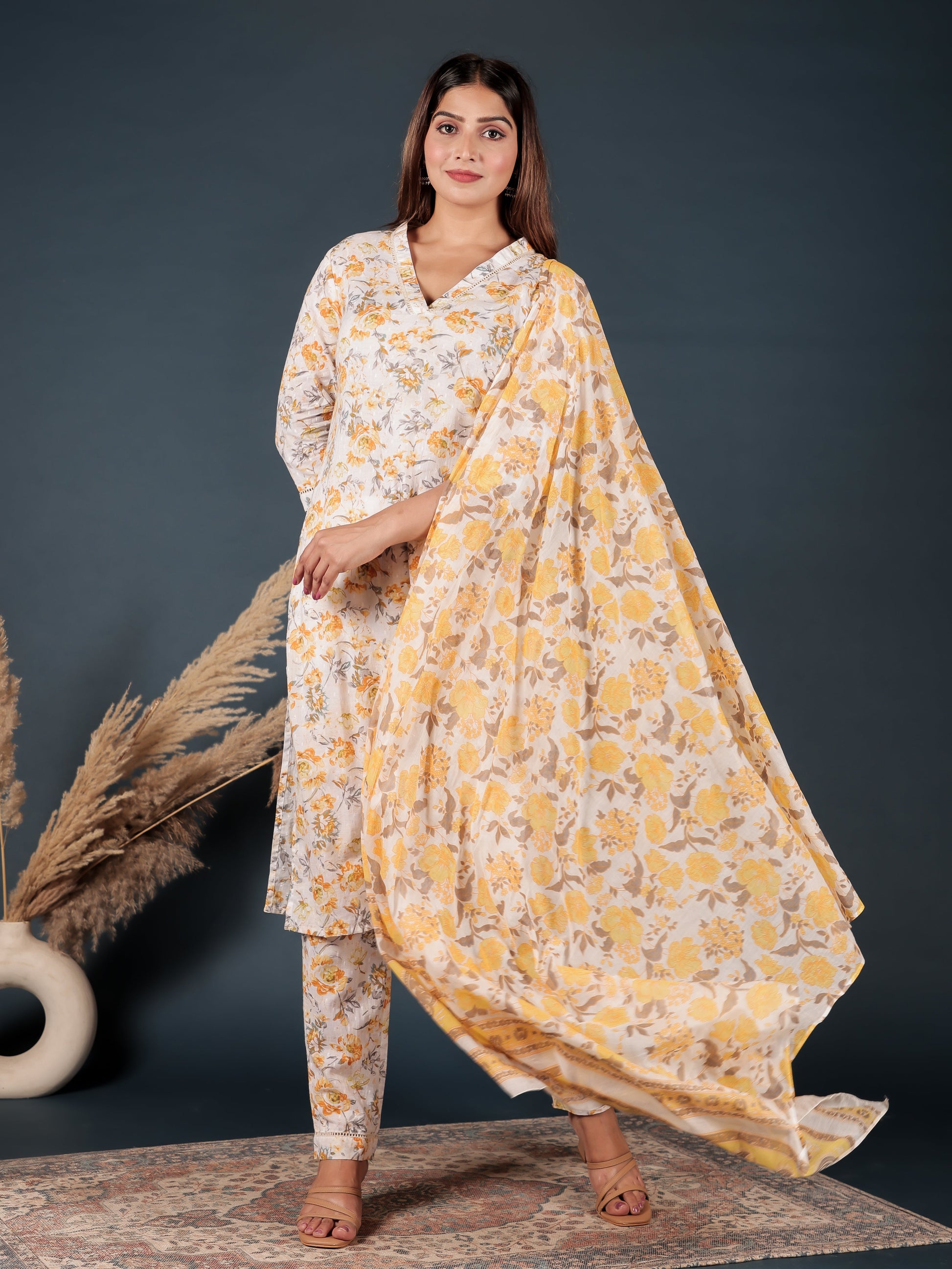 Elevate your ethnic wardrobe with this Textured Cotton kurta in a stunning Yellow hue. Featuring an elegant Straight fit and striking Floral accents, it’s perfect for festive celebrations or family gatherings. The V neckline and 3/4 Sleeve provide all-day comfort. Team with gold-toned accessories for an effortlessly chic vibe. Maintain its charm by following proper care instructions.