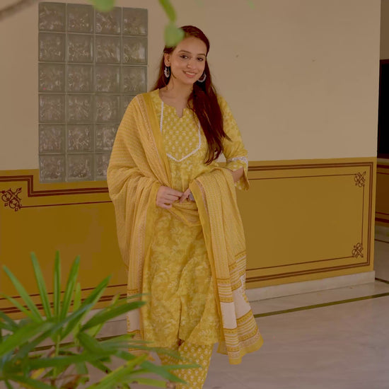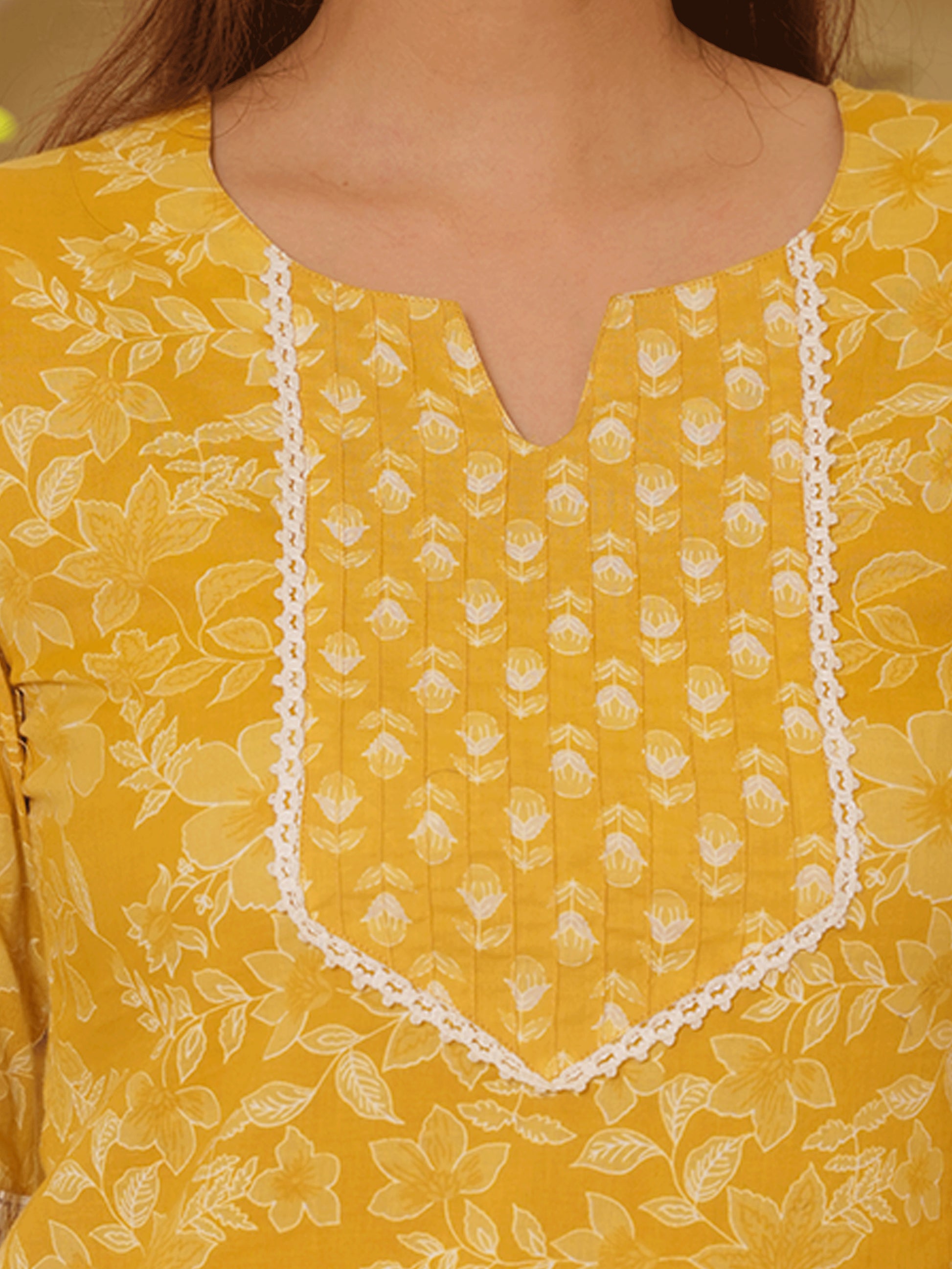 This Yellow Straight kurta in soft Soft Cotton is a timeless pick for festive and casual wear. Designed with a Round neckline and 3/4 Sleeve sleeves, its graceful Calf Length cut flatters all body types. The delicate Floral detailing adds a touch of sophistication. Pair it with statement earrings and juttis for a polished look. Maintain its pristine look by following proper care instructions.