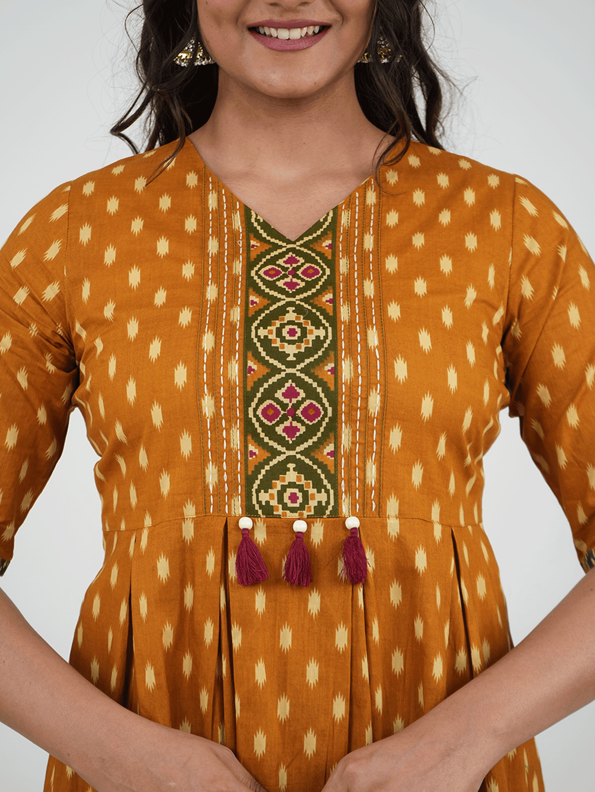 Embroidered Soft Cotton Ikat A-line Yellow Kurta