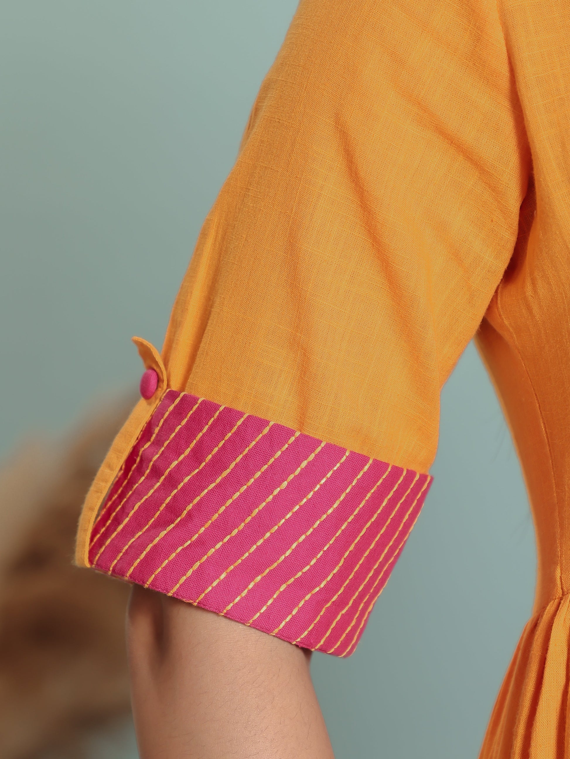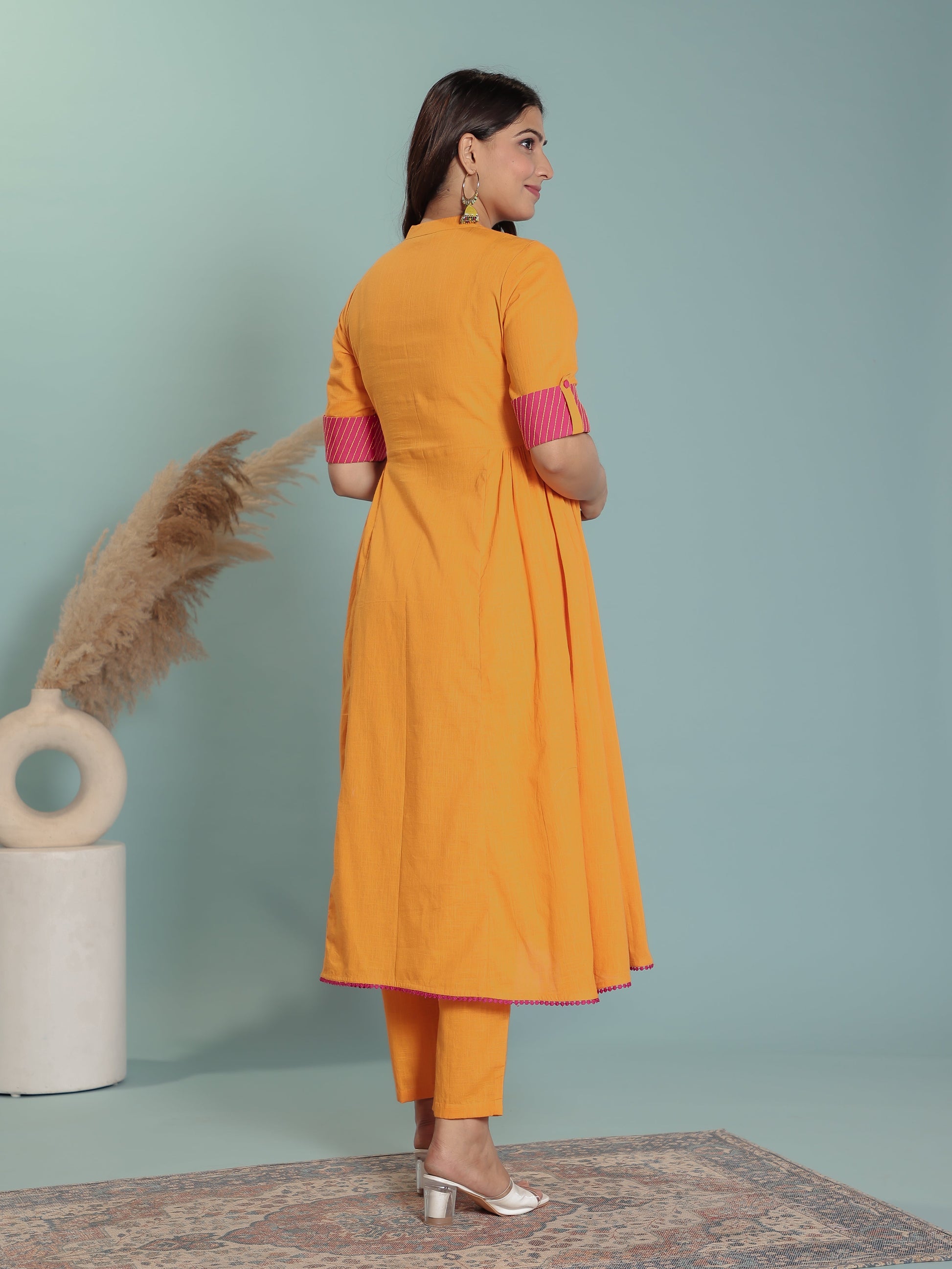 Crafted from breathable Natural Cotton, this Panelled kurta in Yellow blends traditional design with everyday comfort. The Solid finish adds artisanal charm, while the Calf Length silhouette ensures effortless elegance. Style with palazzos or leggings for versatile looks, from workdays to weekend outings. Designed for easy care, this kurta stays beautiful with simple care instructions.