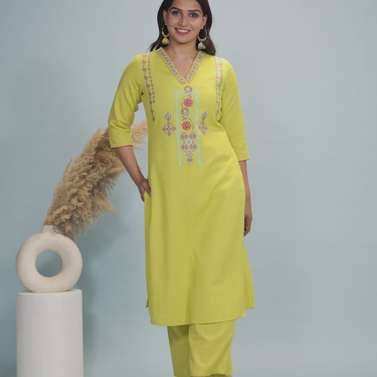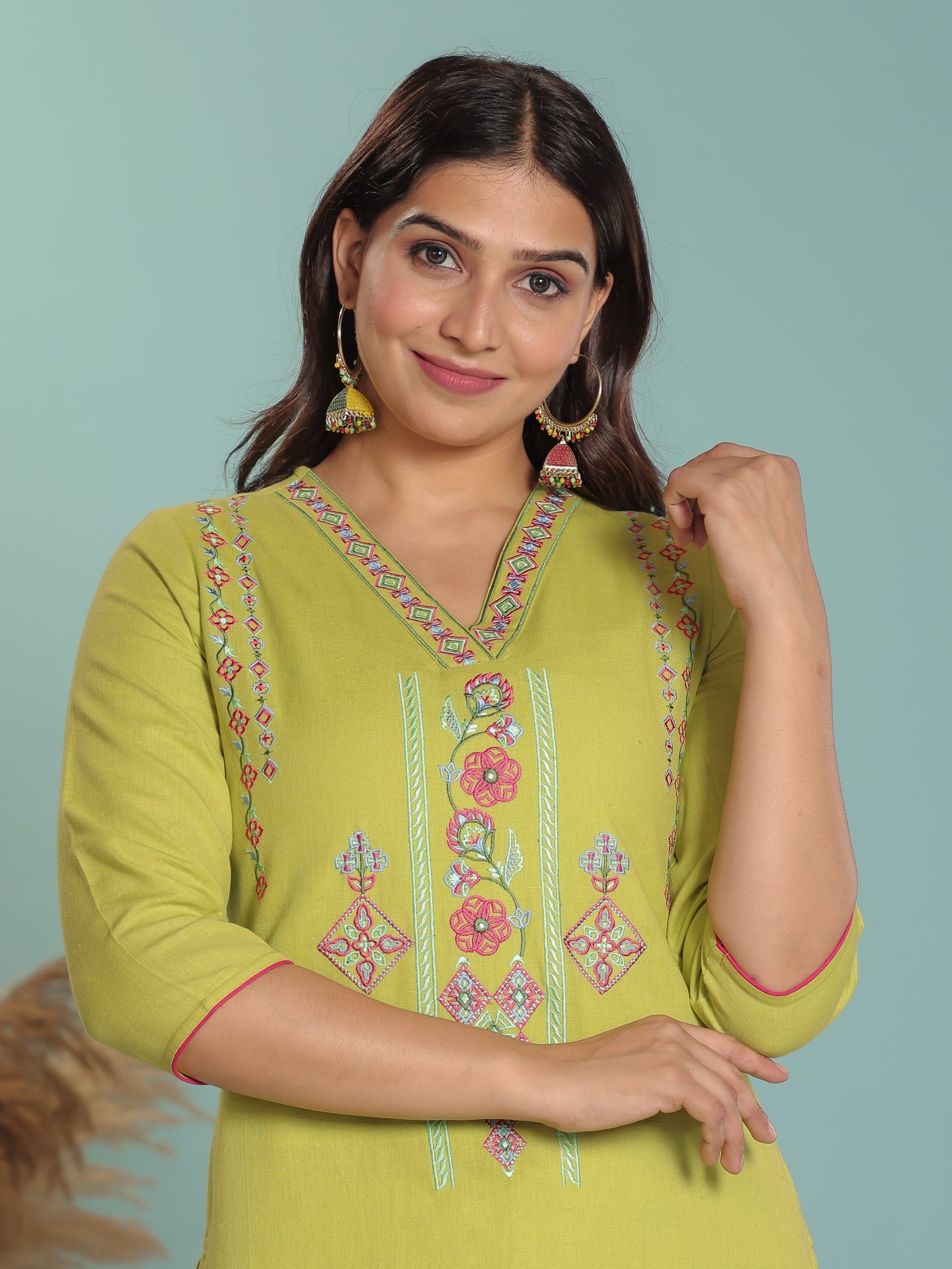 Embroidered Linen Cotton Solid Straight Lime Green Kurta