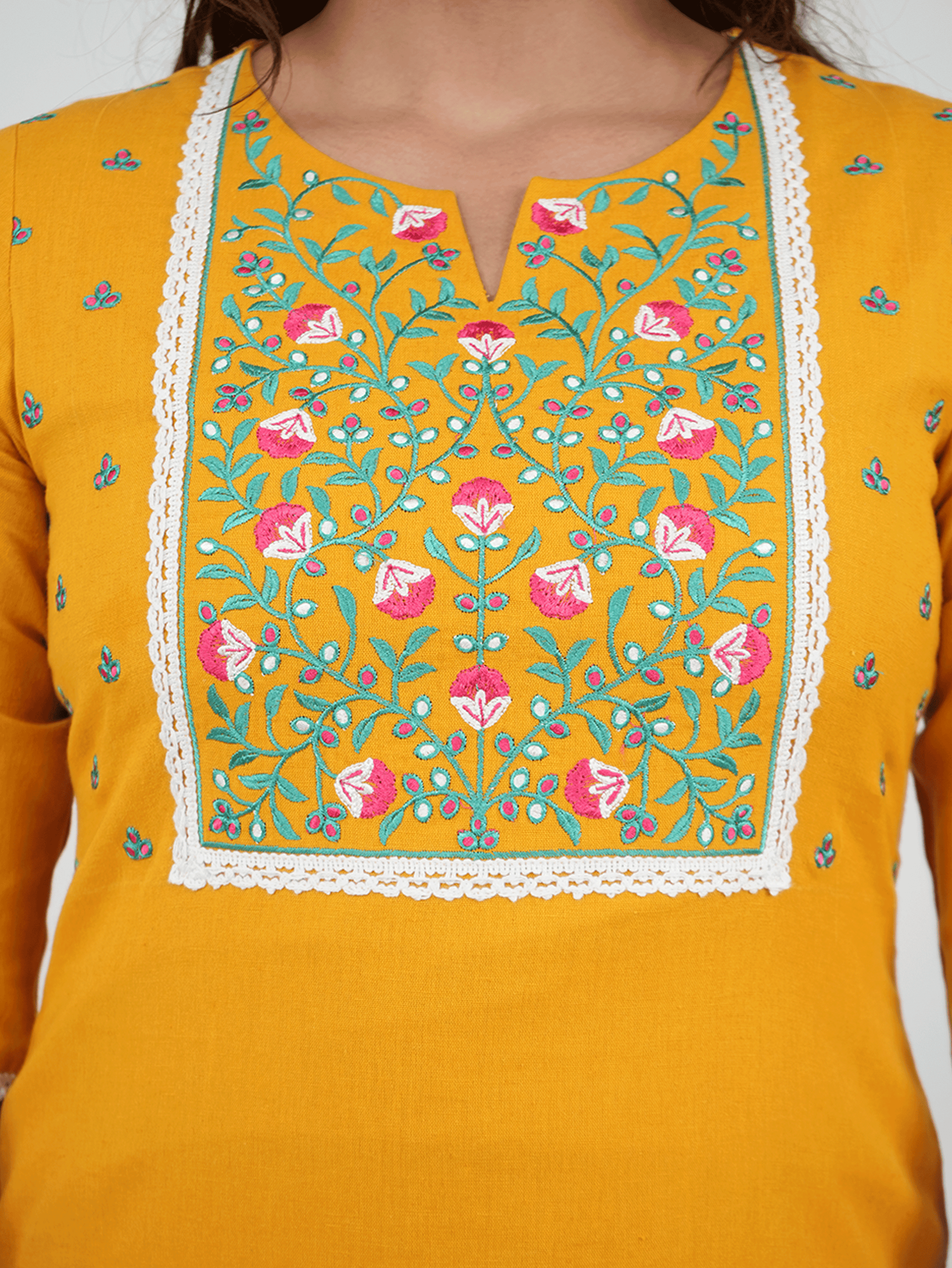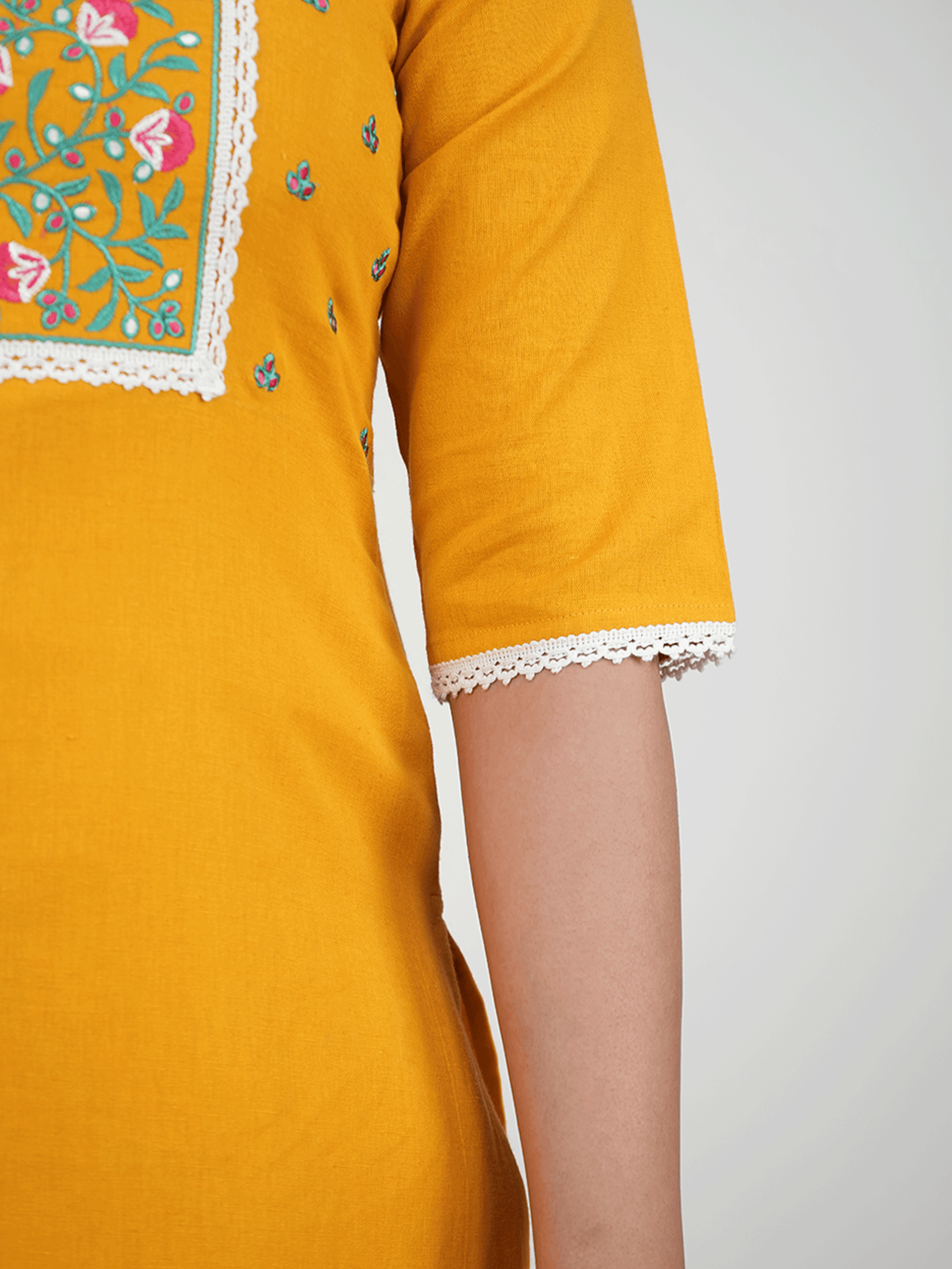 Embroidered Linen Cotton Solid Straight Yellow Kurta