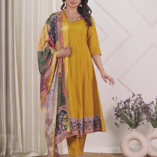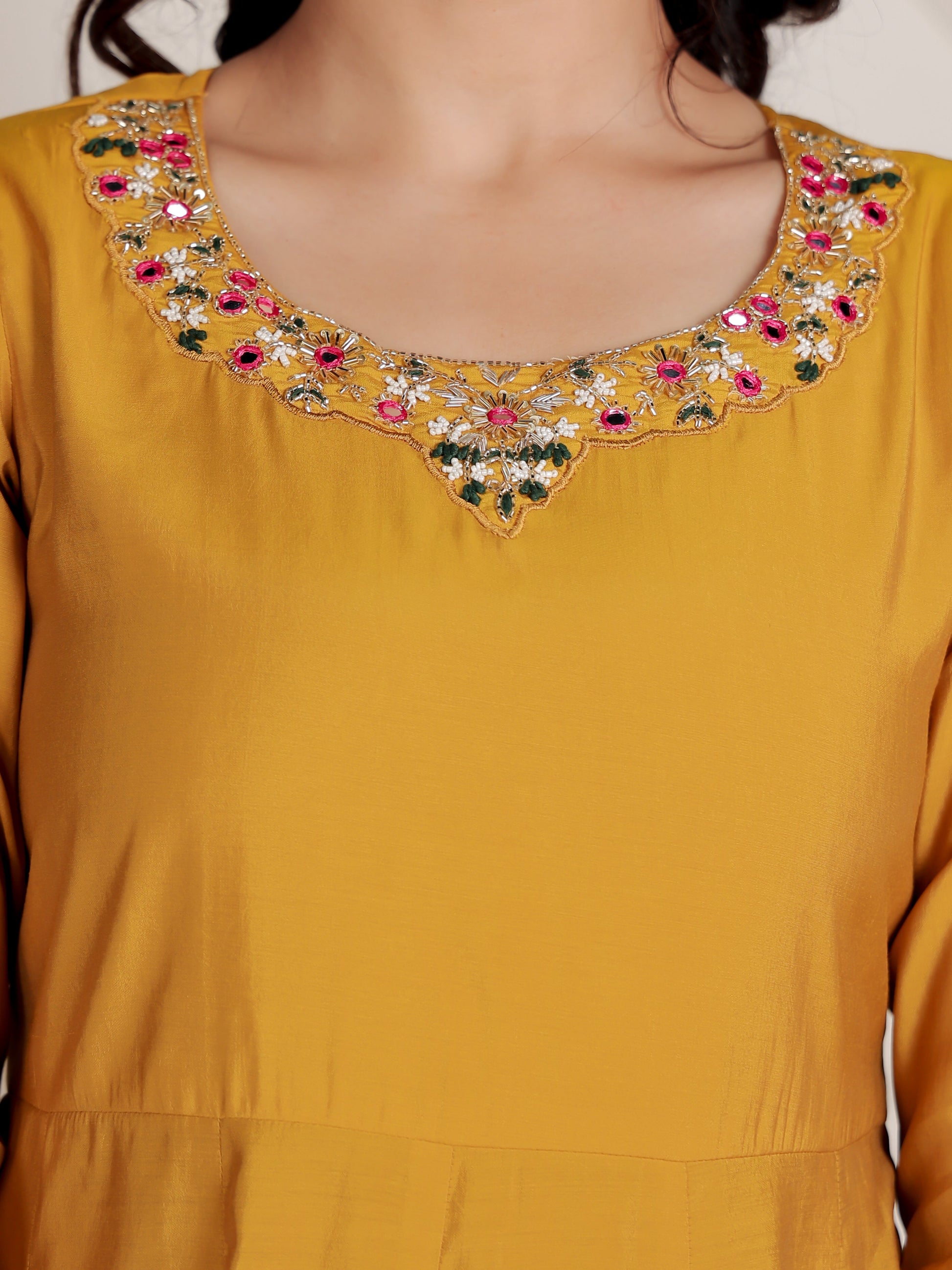 Embroidered Muslin Solid Flared Yellow Kurta
