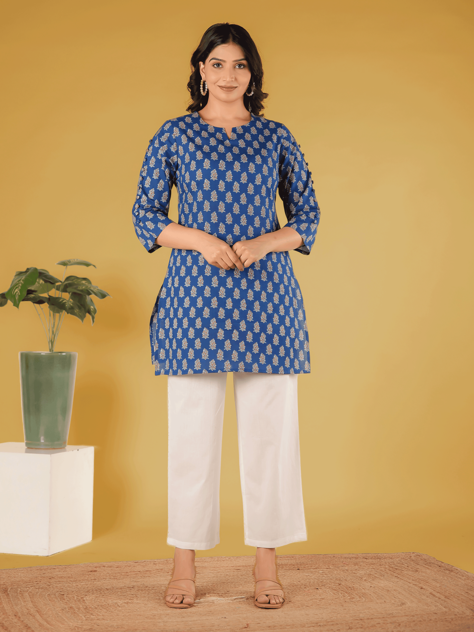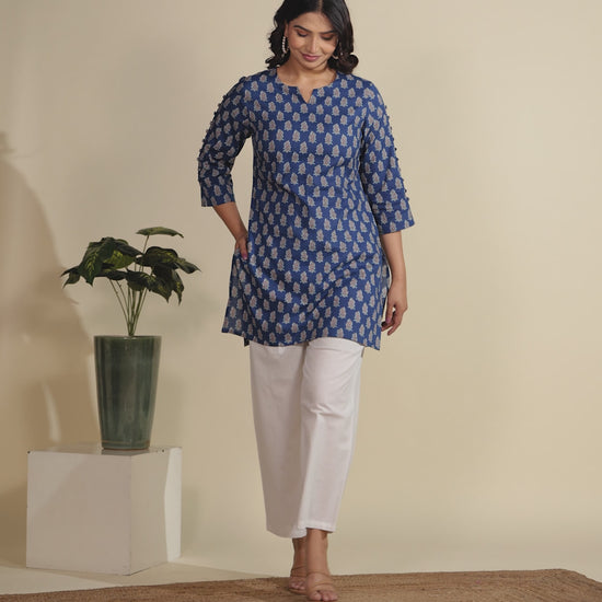 This Blue Soft Cotton kurta with a Straight flare is designed for comfort and style. Featuring a Round neckline, 3/4 Sleeve sleeves, and a graceful Short hemline, it’s perfect for festive wear or semi-formal gatherings. The Floral highlights add depth and texture, making it a standout piece. Accessorise with a contrasting dupatta and keep it pristine by following proper care instructions.