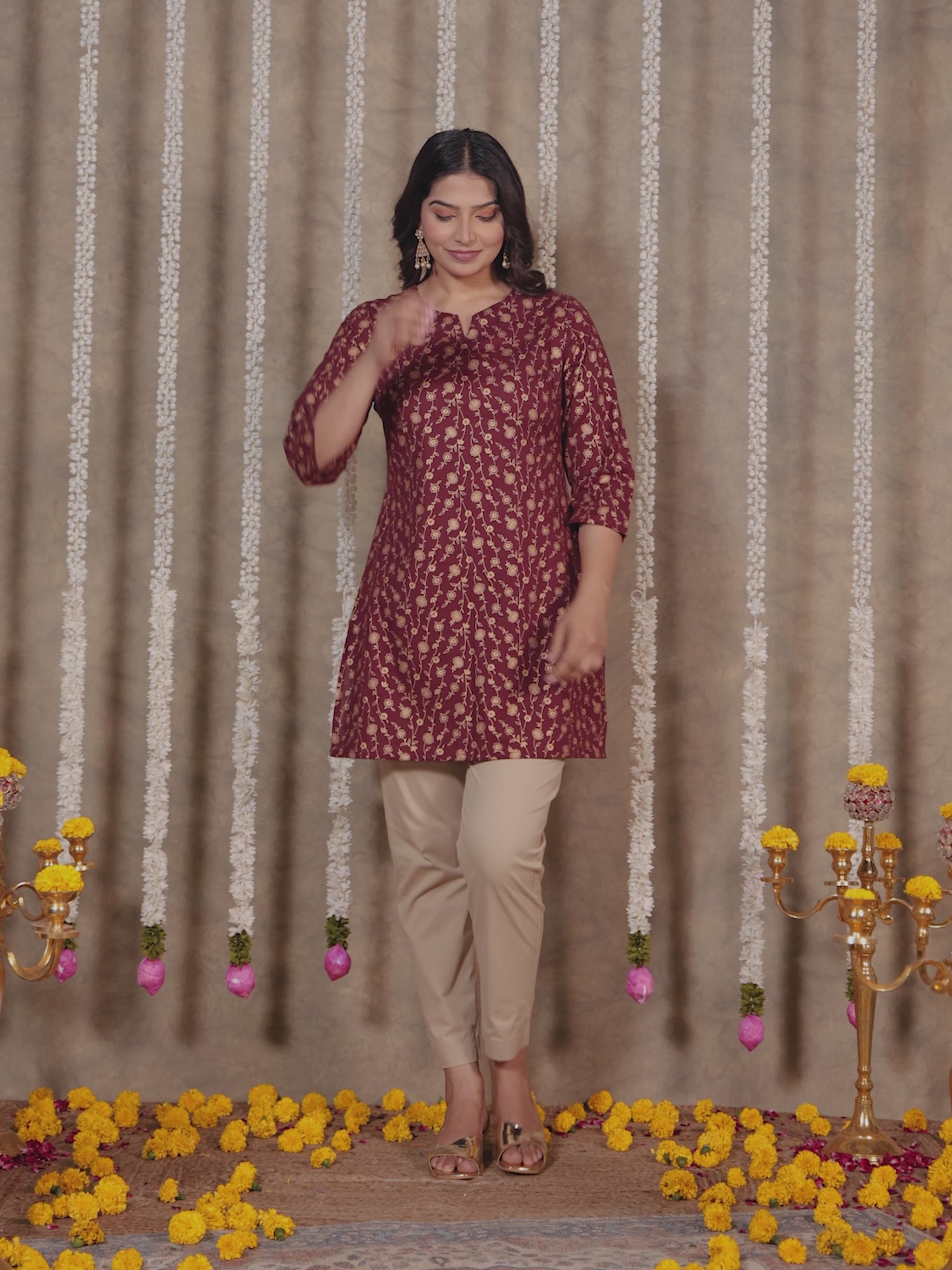 This Maroon Soft Cotton kurta with a Straight flare is designed for comfort and style. Featuring a Round neckline, 3/4 Sleeve sleeves, and a graceful Short hemline, it’s perfect for festive wear or semi-formal gatherings. The Floral highlights add depth and texture, making it a standout piece. Accessorise with a contrasting dupatta and keep it pristine by following proper care instructions.