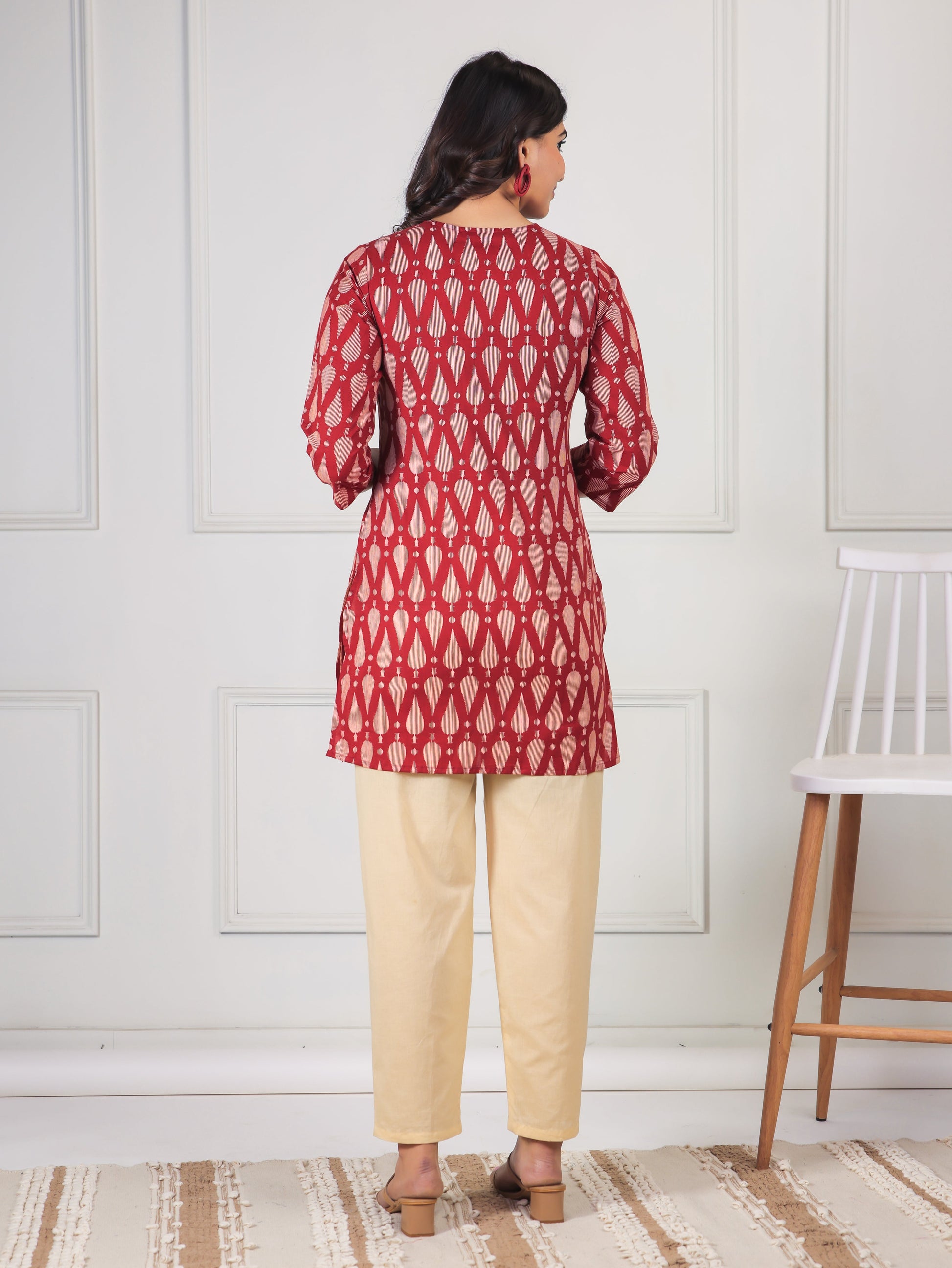 Crafted from breathable Soft Cotton, this Straight kurta in Maroon blends traditional design with everyday comfort. The Geometric finish adds artisanal charm, while the Short silhouette ensures effortless elegance. Style with palazzos or leggings for versatile looks, from workdays to weekend outings. Designed for easy care, this kurta stays beautiful with simple care instructions.