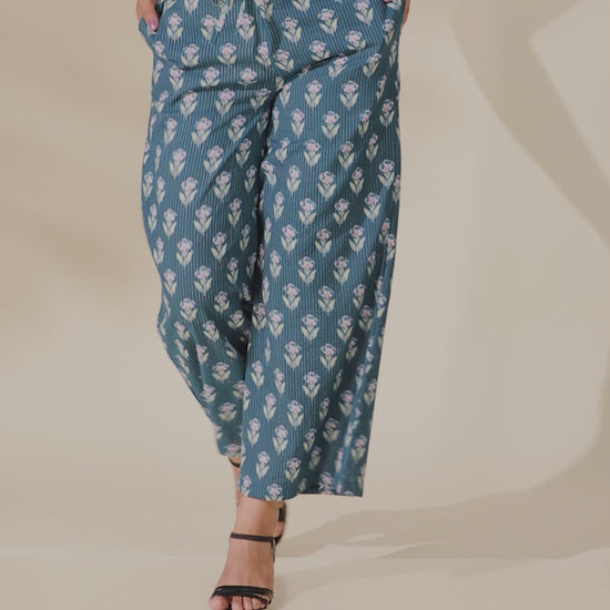 Say hello to the blue palazzo you didn't know you needed – made from quality kantha cotton for everyday comfort. The flowing palazzo silhouette offers graceful movement and all-day comfort. The full length design provides complete coverage with sophisticated drape. Features two convenient pockets that combine functionality with style. The eye-catching block pattern adds visual interest to your ensemble. Easy to maintain with machine wash instructions, these bottoms will become a wardrobe staple.