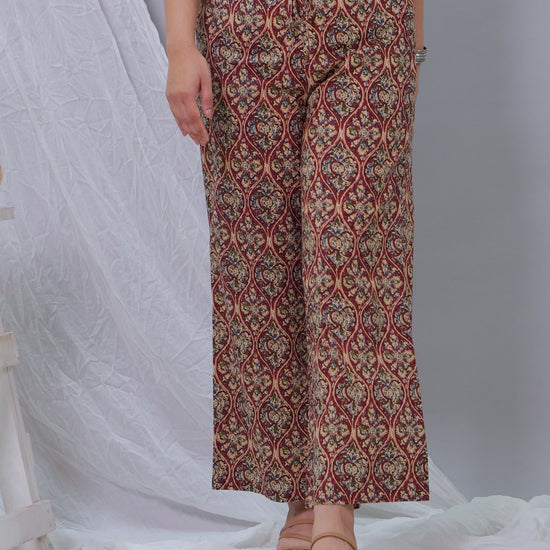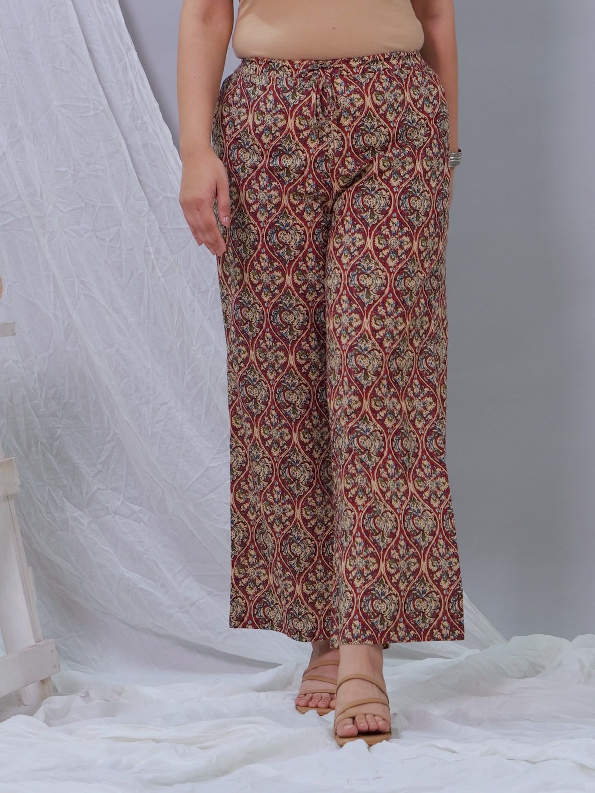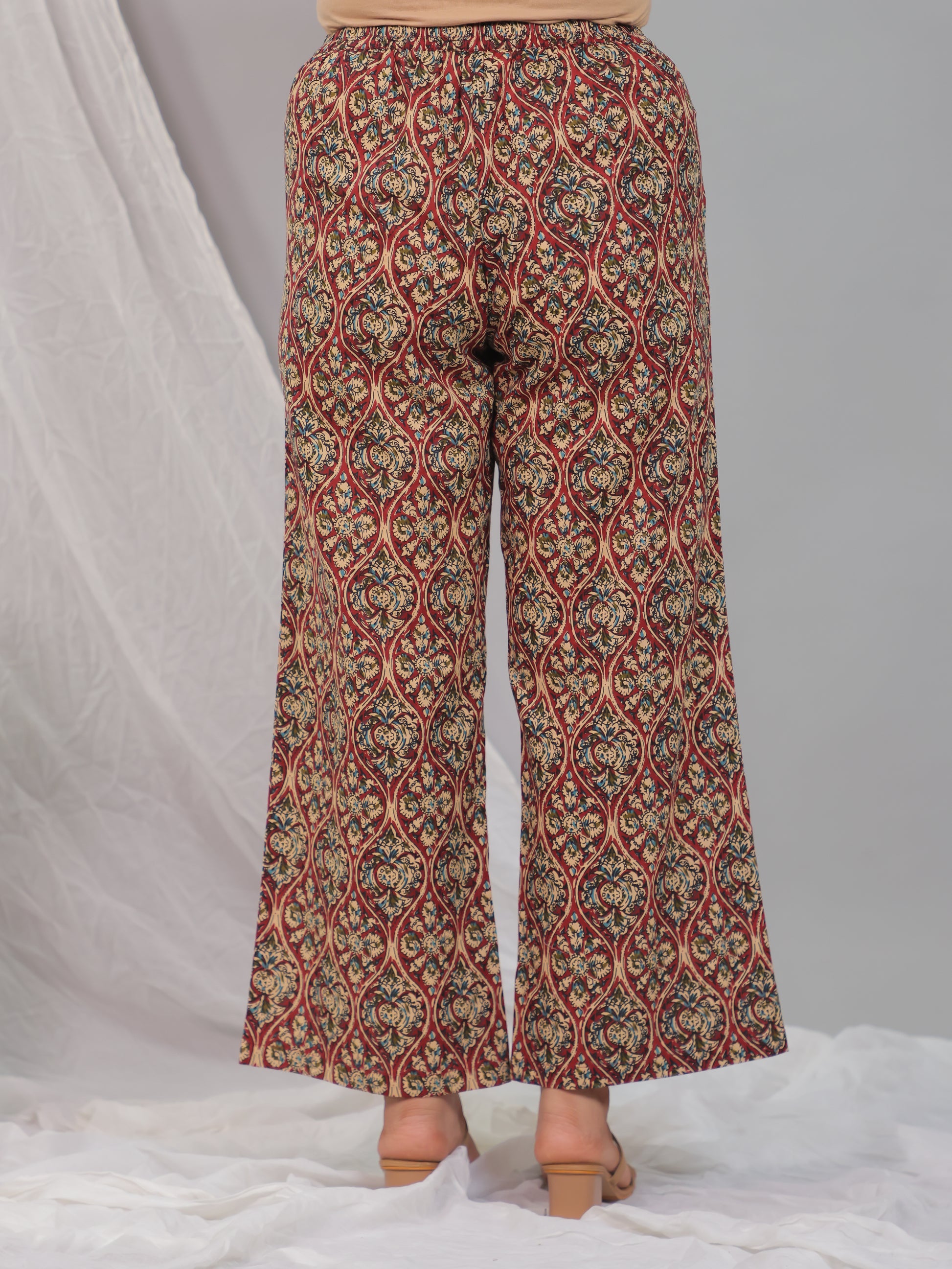 These Red palazzos crafted from soft Soft Cotton bring effortless elegance to your wardrobe. The Kalamkari design adds a playful touch, while pockets offer convenience for daily wear. Perfect for summer outings or relaxed evenings, they pair beautifully with kurtas, tunics, or crop tops. Easy care keeps them looking fresh season after season.