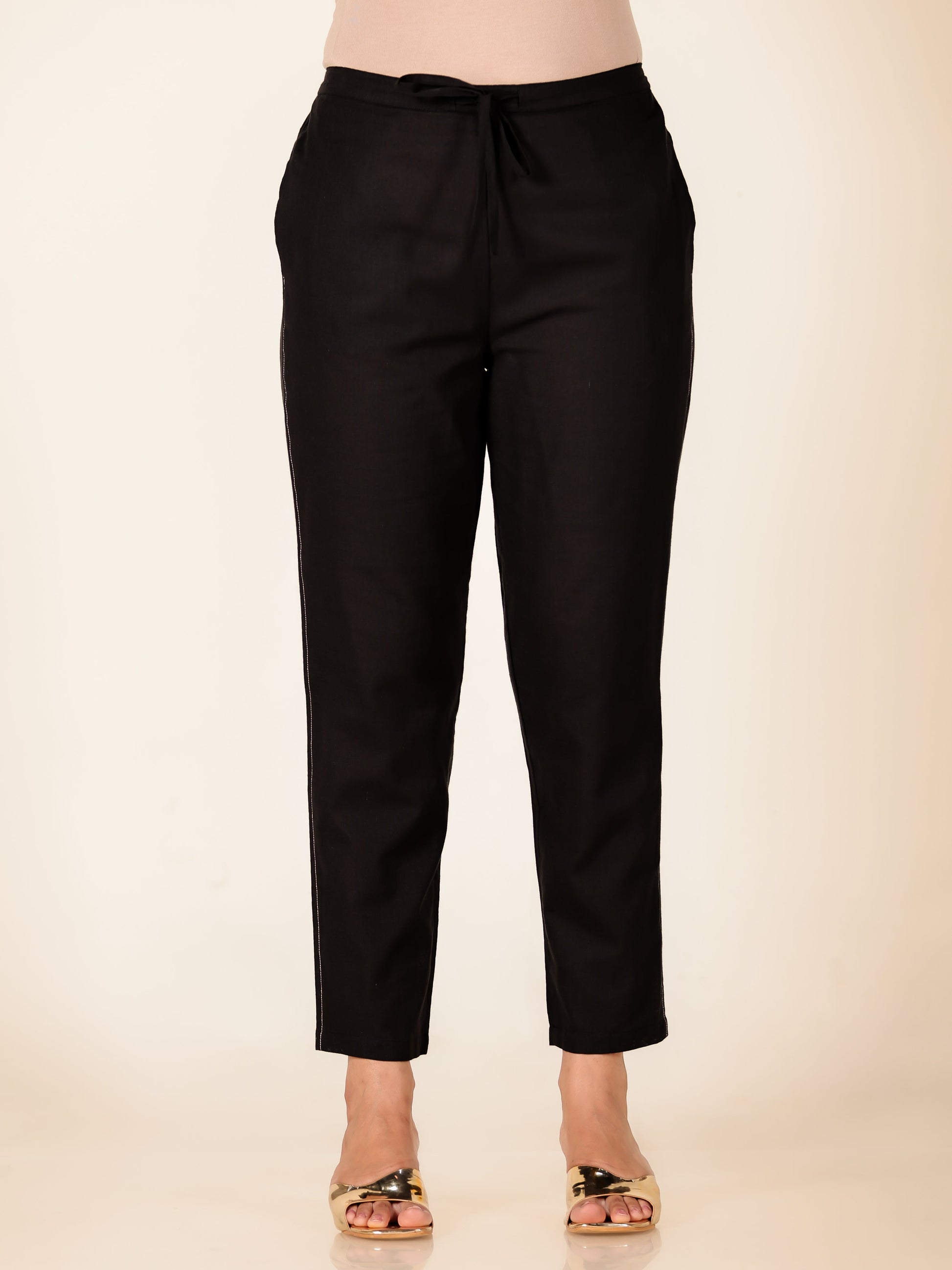 Embroidered Linen Cotton Solid Black Tapered Trousers