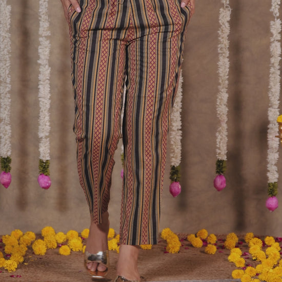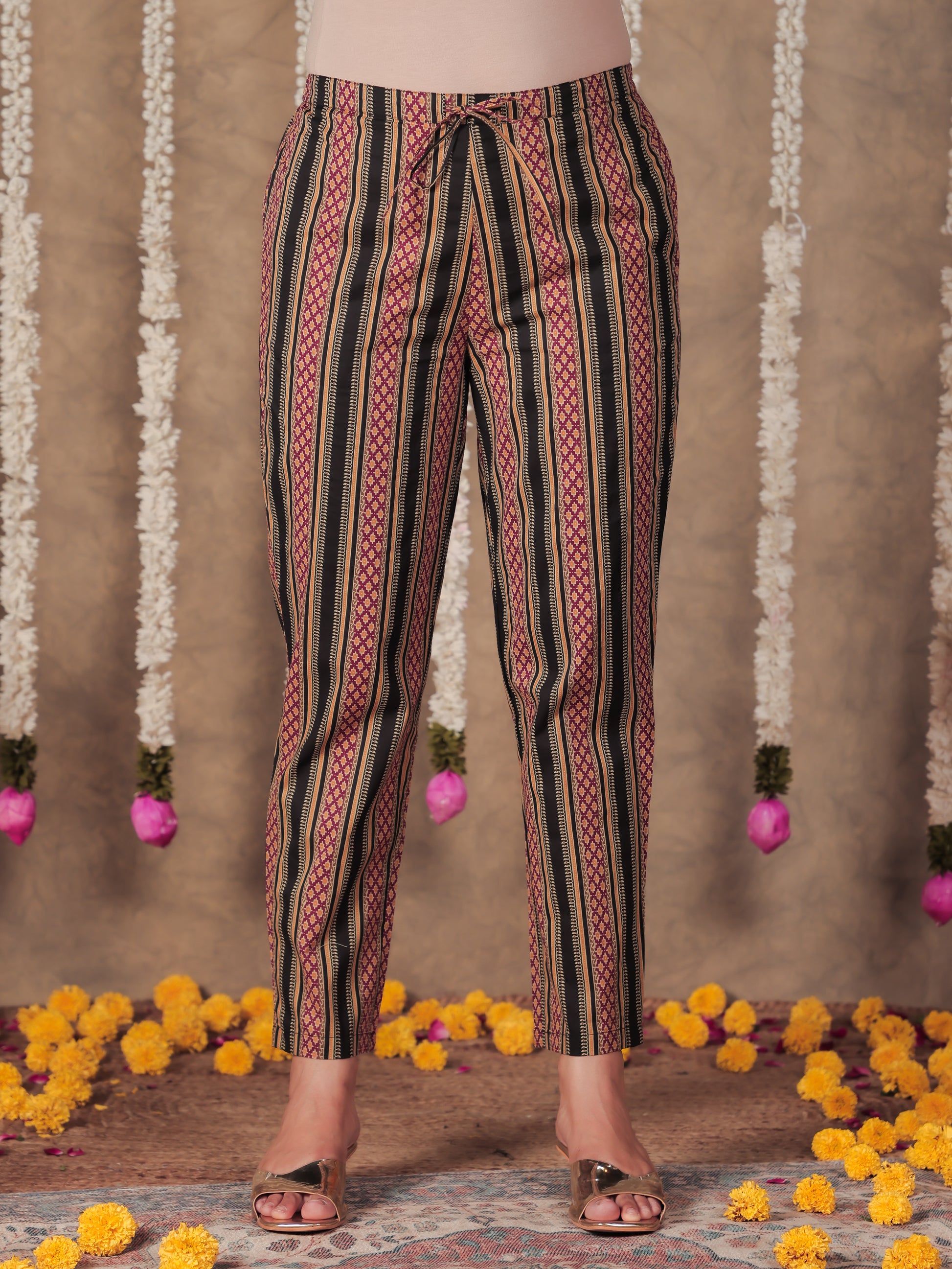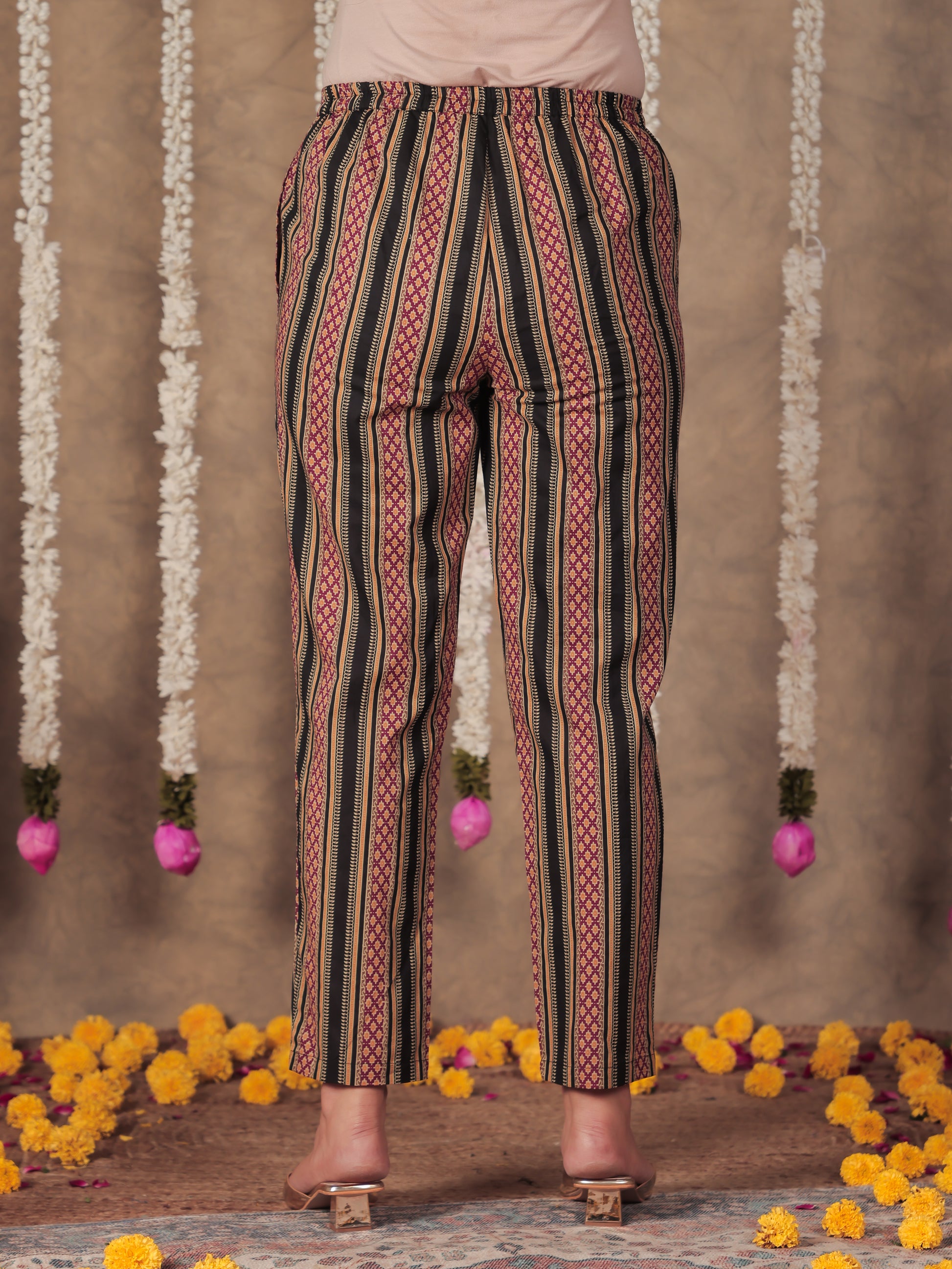 Upgrade your wardrobe with these Black bottoms made from lightweight Soft Cotton. The Striped accents bring subtle charm, while pockets make them practical for all-day wear. Perfect for pairing with ethnic kurtas or western blouses, these bottoms are a go-to choice for comfort and style. Easy care ensures they stay fresh season after season.